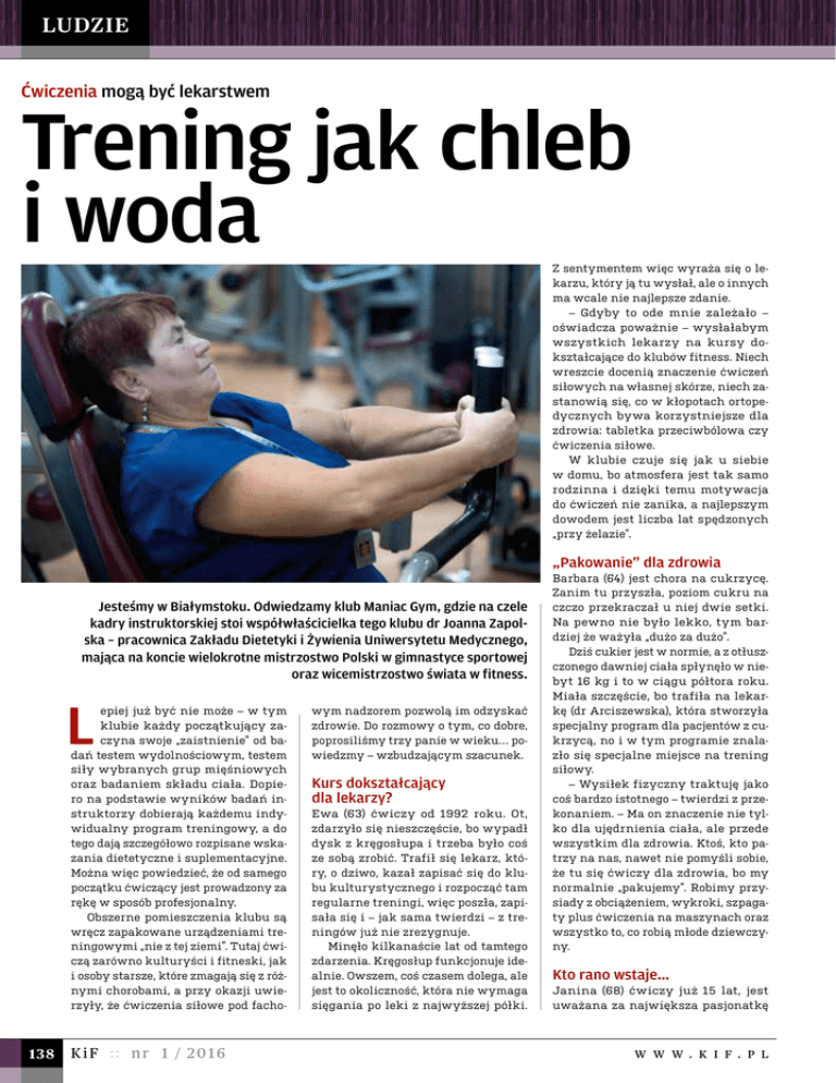 LUDZIE Ćwiczenia mogą być lekarstwem Trening jak chleb i woda Z sentymentem więc wyraża się o lekarzu, który ją tu wysłał, ale o innych ma wcale nie najlepsze zdanie. – Gdyby to ode mnie zależało – oświadcza poważnie – wysłałabym wszystkich lekarzy na kursy dokształcające do klubów fitness. Niech wreszcie docenią znaczenie ćwiczeń siłowych na własnej skórze, niech zastanowią się, co w kłopotach ortopedycznych bywa korzystniejsze dla zdrowia: tabletka przeciwbólowa czy ćwiczenia siłowe. W klubie czuje się jak u siebie w domu, bo atmosfera jest tak samo rodzinna i dzięki temu motywacja do ćwiczeń nie zanika, a najlepszym dowodem jest liczba lat spędzonych „przy żelazie”. „Pakowanie” dla zdrowia Jesteśmy w Białymstoku. Odwiedzamy klub Maniac Gym, gdzie na czele kadry instruktorskiej stoi współwłaścicielka tego klubu dr Joanna Zapolska – pracownica Zakładu Dietetyki i Żywienia Uniwersytetu Medycznego, mająca na koncie wielokrotne mistrzostwo Polski w gimnastyce sportowej oraz wicemistrzostwo świata w fitness. L epiej już być nie może – w tym klubie każdy początkujący zaczyna swoje „zaistnienie” od badań testem wydolnościowym, testem siły wybranych grup mięśniowych oraz badaniem składu ciała. Dopiero na podstawie wyników badań instruktorzy dobierają każdemu indywidualny program treningowy, a do tego dają szczegółowo rozpisane wskazania dietetyczne i suplementacyjne. Można więc powiedzieć, że od samego początku ćwiczący jest prowadzony za rękę w sposób profesjonalny. Obszerne pomieszczenia klubu są wręcz zapakowane urządzeniami treningowymi „nie z tej ziemi”. Tutaj ćwiczą zarówno kulturyści i fitneski, jak i osoby starsze, które zmagają się z różnymi chorobami, a przy okazji uwierzyły, że ćwiczenia siłowe pod facho- 138 K i F :: n r 1 / 2016 wym nadzorem pozwolą im odzyskać zdrowie. Do rozmowy o tym, co dobre, poprosiliśmy trzy panie w wieku… powiedzmy – wzbudzającym szacunek. Kurs dokształcający dla lekarzy? Ewa (63) ćwiczy od 1992 roku. Ot, zdarzyło się nieszczęście, bo wypadł dysk z kręgosłupa i trzeba było coś ze sobą zrobić. Trafił się lekarz, który, o dziwo, kazał zapisać się do klubu kulturystycznego i rozpocząć tam regularne treningi, więc poszła, zapisała się i – jak sama twierdzi – z treningów już nie zrezygnuje. Minęło kilkanaście lat od tamtego zdarzenia. Kręgosłup funkcjonuje idealnie. Owszem, coś czasem dolega, ale jest to okoliczność, która nie wymaga sięgania po leki z najwyższej półki. Barbara (64) jest chora na cukrzycę. Zanim tu przyszła, poziom cukru na czczo przekraczał u niej dwie setki. Na pewno nie było lekko, tym bardziej że ważyła „dużo za dużo”. Dziś cukier jest w normie, a z otłuszczonego dawniej ciała spłynęło w niebyt 16 kg i to w ciągu półtora roku. Miała szczęście, bo trafiła na lekarkę (dr Arciszewska), która stworzyła specjalny program dla pacjentów z cukrzycą, no i w tym programie znalazło się specjalne miejsce na trening siłowy. – Wysiłek fizyczny traktuję jako coś bardzo istotnego – twierdzi z przekonaniem. – Ma on znaczenie nie tylko dla ujędrnienia ciała, ale przede wszystkim dla zdrowia. Ktoś, kto patrzy na nas, nawet nie pomyśli sobie, że tu się ćwiczy dla zdrowia, bo my normalnie „pakujemy”. Robimy przysiady z obciążeniem, wykroki, szpagaty plus ćwiczenia na maszynach oraz wszystko to, co robią młode dziewczyny. Kto rano wstaje… Janina (68) ćwiczy już 15 lat, jest uważana za największa pasjonatkę w w w. k i f. p l LUDZIE dzieć w domu, wyglądać przez okno i łykać tabletki. Wybrały inny sposób na życie i teraz energia rozpiera je na każdym kroku. – Przede wszystkim taki sposób na życie odbija się korzystnie na psychice – oświadcza Ewa. – Wprawdzie my tutaj ciężko ćwiczymy, ale jednocześnie traktujemy te ćwiczenia jako zajęcia relaksacyjne. Kiedy zdarzy się, że nie przyjdziemy do klubu, bo akurat wypadnie coś ważnego, to każda z nas ma coś w rodzaju kaca. Oczywiście, wszyscy znamy to uczucie dopadające nas w dniu, kiedy odpuściliśmy sobie trening, a jak widać, dotyczy to osób w każdym wieku. Nasze rozmówczynie przyznają, że czasami nie chce się wstać rano z łóżka, co jest sprawą znaną i typową dla ludzi, ale tę poranną niechęć udaje się zawsze pokonać. Swobodnie i bez zadyszki ćwiczeń siłowych, czego efekty widać zresztą na plecach i ramionach – tkanka mięśniowa jak u młódki. A przecież zanim przyszła do klubu Maniac Gym, miała trudności z chodzeniem. Mieszka na czwartym piętrze, więc aby dojść do swojego mieszkania, musiała odpoczywać co kilka schodków. Wydawało jej się, że kręgosłup ma już tylko „do wymiany”, a dziś młode dziewczyny patrzą, naśladują podczas ćwiczeń, ale… nie dorównują jej w sprawności i odporności na wysiłek. Janina wstaje o 5.30, na siłowni jest godzinę później. Ćwiczy codziennie na różne partie mięśniowe, na końcu zalicza kilka intensywnych serii na brzuch, następne pół godziny ćwiczy w basenie i wreszcie uwieńcza to wszystko półgodzinnym pływaniem. Na zakończenie sportowego poranku pozwala sobie na relaks przy kawie z koleżankami. Aż trudno uwierzyć, że Janina spędza w klubie 4 godziny każdego dnia! Ćwiczenia z ciężarami jako relaks I tak to leci. Pół wieku temu o Ewie, Barbarze i Janinie mówiłoby się „starsze panie”. Dzisiaj nikt nie odważyłby się tak powiedzieć, bo nazwa nie byłaby adekwatna do sposobu bycia, zachowania się, stylu życia, wyglądu i mentalności tych trochę wcześniej urodzonych dziewczyn. Jaki mogły mieć wybór? Ano, mogły sie- w w w. k i f. p l Odzyskane zdrowie stanowi dla nich najlepszą motywację do kontynuowania treningów. Co ciekawe, wszystkie doceniają też wpływ ćwiczeń siłowych na estetykę ciała. Barbara wykonuje wł