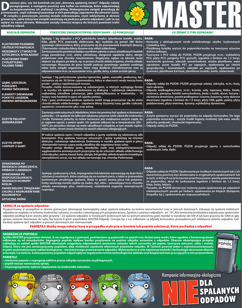D omowy piec, czy też kominek nie jest „domową spalarnią śmieci”. Odpady należy posegregować, a następnie powinny one trafiać na instalacje, które odpowiadają za bezpieczeństwo ich utylizacji i recykling. Niebezpieczne związki przenikają do pomieszczeń, część substancji pozostaje w nich powodując zagrożenie dla zdrowia i życia. W związku z powyższym, poniżej zostało zobrazowane, czym oddychamy w okresie grzewczym, jakie toksyczne związki uwalniają się podczas palenia odpadami i jaki to ma wpływ na nasze zdrowie. Wskazane zostały również miejsca do których powinien trafić szkodliwy odpad. RODZAJE ODPADÓW TOKSYCZNE ZWIĄZKI KTÓRYMI ODDYCHAMY - CO POWODUJĄ? Spalając 1 kg odpadów z PCV (polichlorku winylu): (plastikowe butelki, wiadra, folie, płytki PCV, przewody elektryczne, itp.) wydziela się ponad 280 litrów PLASTIKOWE POJEMNIKI gazowego chlorowodoru, który przyczynia się do powstawania kwaśnych deszczy. I BUTELKI PO NAPOJACH Chlorowodór uszkadza błony śluzowe oraz układ oddechowy. Zanieczyszczenia powietrza będące wynikiem palenia w piecu plastikowych butelek PRZEDMIOTY Z TWORZYW SZTUCZNYCH, WYKŁADZINY mogą powodować m.in. astmę oskrzelową, alergiczne zapalenia skóry, alergie pokarmowe oraz choroby nowotworowe. Negatywny wpływ na zdrowie może PLASTIKOWE TORBY objawić się dopiero po latach, np. w postaci chorób układu krążenia, chorób układu Z POLIETYLENU, nerwowego. Wrzucone do pieca butelki podczas powolnego spalania uwalniają FOLIOWE TORBY także lotne związki organiczne, które mają działanie chorobotwórcze oraz są odpowiedzialne m.in. za wysuszenie oczu, gardła, skóry, a także za bóle głowy. GĄBKI, USZCZELKI, PODESZWY, PIANKA TAPICERSKA ELEMENTY DREWNIANE POKRYTE LAKIEREM, DREWNO IMPREGNOWANE CO ZROBIĆ Z TYMI ODPADAMI? RADA: • Korzystaj z ekologicznych toreb wielokrotnego użytku (wykonanych z bawełny, lnu). • Plastikową butelkę wyrzuć do pojemnika/worka na tworzywa sztuczne (koloru żółtego). • Tworzywa z PCV oddaj do PSZOK: PSZOK przyjmuje m.in.: wykładziny PCV, płyty PCV, parapety PCV, gumolit, (zgodnie z limitem do 1,5 tony), wycieraczki gumowe, zderzaki samochodowe, wiadra plastikowe, węże ogrodowe, puste butelki PET po napojach, opakowania po chemii gospodarczej i kosmetykach, nakrętki po napojach, opakowania po żywności, plastikowe karnisze, plastikowe torebki, worki, reklamówki. Spalając 1 kg poliuretanów (pianka tapicerska, gąbki, uszczelki, podeszwy, itp.) wytwarza się ok. 50 litrów cyjanowodoru, który w obecności wody tworzy kwas RADA: • Odpady oddaj do PSZOK: PSZOK przyjmuje odzież, tekstylia, m.in.: buty, pruski – jedną z najsilniejszych trucizn. Ponadto meble konserwowane są substancjami, w których występują fenole stare ubrania. – w wyniku ich spalania produkowane są dioksyny – substancje rakotwórcze, • Odpady wielkogabarytowe, m.in.: krzesła, sofy, tapczany, łóżka, fotele, najbardziej szkodliwe substancje, jakie zidentyfikowano w środowisku – 10 materace, pierzyny, foteliki samochodowe, deski z mebli, drzwi, futryny / tysięcy razy bardziej trujące od cyjanku potasu. ościeżnice drewniane, panele podłogowe i ścienne, boazerię, ramy okienne Pyły i gazy emitowane podczas spalania mebli mogą przyczyniać się do wielu drewniane (zgodnie z limitem do 1,5 tony), płyty OSB, gąbki, palety, płyty chorób układu oddechowego – zapalenia błony śluzowej nosa, gardła i oskrzeli, paździerzowe, płyty wiórowe, dywany, wykładziny dywanowe. zapalenia i nowotworów płuc oraz astmy. Zawierają wiele sztucznych składników, które nie powinny być spalane w domowym RADA: palenisku – ich spalanie nie tylko jest zakazane, przynosi wiele szkód dla środowiska • Zużyte pampersy wyrzuć do pojemnika na odpady komunalne. Do tego i kotła. Ponieważ pieluchy są mokre konieczne jest zwiększone zużycie ciepła, by pojemnika wrzucamy – zużyte środki higieny osobistej (jak wata, waciki, je najpierw ogrzać, a potem spalić. Ich spalanie odbywa się w temperaturze 200 – pieluchy, podpaski, chusteczki higieniczne), 500oC do atmosfery dostaje się wiele szkodliwych związków, w tym metale ciężkie: • Odpady oddaj do PSZOK. nikiel, kadm, chrom znane również ze swoich własności alergizujących. ZUŻYTE PIELUCHY JEDNORAZOWE W trakcie spalania opon i innych odpadów z gumy wydziela się rakotwórczy alfa benzopiren. Przy spalaniu tworzyw sztucznych i gumy wydzielają się również dioksyny –substancje rakotwórcze. Emitowany w wyniku spalania opon w piecu RADA: chlorowodór tworzy z parą wodą szkodliwy dla organizmu kwas solny. • Odpady oddaj do PSZOK: PSZOK przyjmuje opony z samochodów Ponadto emisja tlenków azotu, dwutlenku siarki oraz wielopierścieniowych osobowych, koła, dętki. węglowodorów aromatycznych przyczynia się do schorzeń układu oddechowego (choroby płuc, astma, kaszel, katar, alergie, ból gardła), układu krążenia (miażdżyca, niewydolność serca), czy też układu nerwowego (np. choroby Parkinsona). ZUŻYTE OPONY I ODPADY Z GUMY OPAKOWANIA PO ŚRODKACH CHEMICZNYCH, FARBACH I LAKIERACH OPAKOWANIA PO ROZPUSZCZALNIKACH, ŚRODKACH OCHRONY ROŚLIN PAPIER BIELONY ZWIĄZKAMI CHLORU Z NADRUKIEM FARB KOLOROWYCH SZTUCZNA SKÓRA Spalając opakowania z farb, impregnatów lub lakierów wytwarzają się duże ilości substancji smolistych, które osadzają się na rusztach pieca, a także w przewodzie kominowym utrudniając spalanie. Może to grozić awarią pieca lub pożarem. Farby zawierają metale ciężkie np. kadm, rtęć, ołów – powodujące m.in. choroby układu nerwowego, płuc, niedorozwój, uszkodzenia organów wewnętrznych (wątroby). RADA: • Odpady oddaj do PSZOK: Opakowania po środkach chemicznych lub z ich zawartością powinny być dostarczane w oryginalnych opakowaniach lub w tych, w których są tymczasowo przechowywane: pianka poliuretanowa (w pojemniku), akryl do tynkowania (zgo