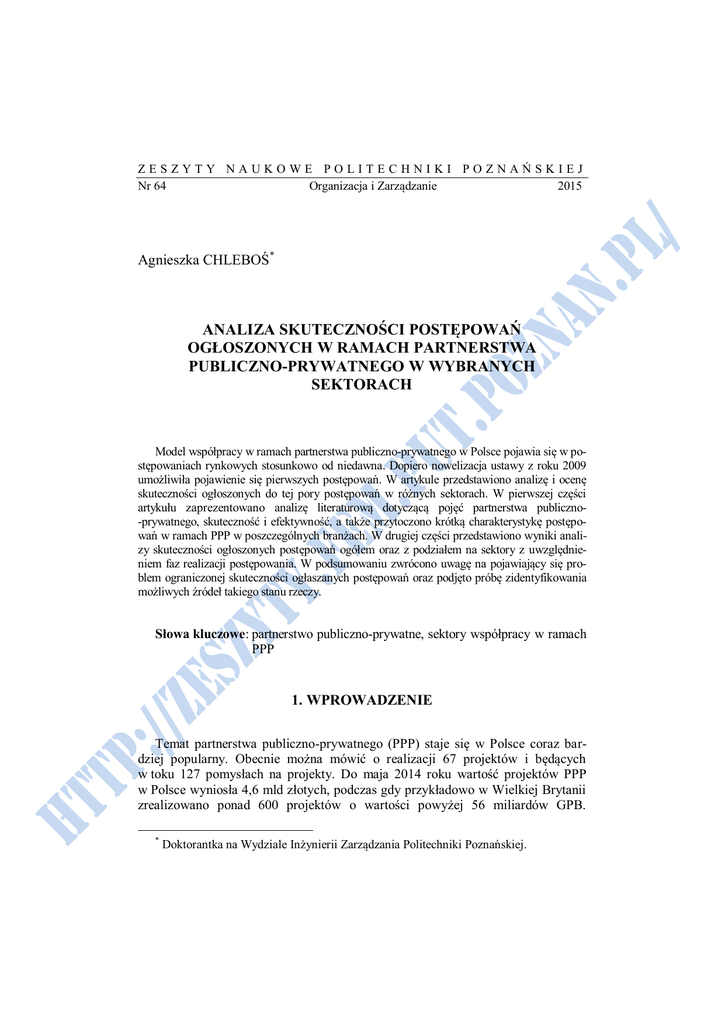 ZESZYTY NAUKOWE POLITECHNIKI POZNAŃSKIEJ Nr 64 Organizacja i Zarządzanie 2015 Agnieszka CHLEBOŚ * ANALIZA SKUTECZNOŚCI POSTĘPOWAŃ OGŁOSZONYCH W RAMACH PARTNERSTWA PUBLICZNO-PRYWATNEGO W WYBRANYCH SEKTORACH Model współpracy w ramach partnerstwa publiczno-prywatnego w Polsce pojawia się w postępowaniach rynkowych stosunkowo od niedawna. Dopiero nowelizacja ustawy z roku 2009 umożliwiła pojawienie się pierwszych postępowań. W artykule przedstawiono analizę i ocenę skuteczności ogłoszonych do tej pory postępowań w różnych sektorach. W pierwszej części artykułu zaprezentowano analizę literaturową dotyczącą pojęć partnerstwa publiczno-prywatnego, skuteczność i efektywność, a także przytoczono krótką charakterystykę postępowań w ramach PPP w poszczególnych branżach. W drugiej części przedstawiono wyniki analizy skuteczności ogłoszonych postępowań ogółem oraz z podziałem na sektory z uwzględnieniem faz realizacji postępowania. W podsumowaniu zwrócono uwagę na pojawiający się problem ograniczonej skuteczności ogłaszanych postępowań oraz podjęto próbę zidentyfikowania możliwych źródeł takiego stanu rzeczy. Słowa kluczowe: partnerstwo publiczno-prywatne, sektory współpracy w ramach PPP 1. WPROWADZENIE Temat partnerstwa publiczno-prywatnego (PPP) staje się w Polsce coraz bardziej popularny. Obecnie można mówić o realizacji 67 projektów i będących w toku 127 pomysłach na projekty. Do maja 2014 roku wartość projektów PPP w Polsce wyniosła 4,6 mld złotych, podczas gdy przykładowo w Wielkiej Brytanii zrealizowano ponad 600 projektów o wartości powyżej 56 miliardów GPB. * Doktorantka na Wydziale Inżynierii Zarządzania Politechniki Poznańskiej. 16 Agnieszka Chleboś Współpraca w ramach partnerstwa publiczno-prywatnego rozwija się w Polsce powoli. Przodują w tej dziedzinie województwa: małopolskie i śląskie (po 10 projektów), mazowieckie (9 projektów), pomorskie (8 projektów) i wielkopolskie (6 projektów) [19]. Z jednej strony partnerstwo publiczno-prywatne stwarza szansę na rozwój infrastruktury przez pozyskanie dodatkowych środków z sektora prywatnego, dzięki czemu podmiot publiczny nie ponosi wszystkich kosztów. Z drugiej strony pomimo wielu korzyści można także mówić o występowaniu pewnych trudności i zagrożeń. Podjęcie decyzji o wyborze najkorzystniejszej formy współpracy może stanowić problem dla podmiotu publicznego. Należy ocenić, czy bardziej odpowiednia będzie formuła standardowego postępowania w ramach Ustawy Prawo zamówień publicznych, czy też współpraca w ramach PPP, i na jaką formę się zdecydować dla drugiego z tych rozwiązań. Należy też dobrać kryteria pomocne w podjęciu najlepszej decyzji. Niekorzystną cechą PPP może być to, że postępowanie oparte na tej formule trwa zazwyczaj dużo dłużej, poza tym istotna staje się kwestia finansowania podmiotu prywatnego. Zatem powstaje pytanie, jaka forma współpracy pomiędzy podmiotami publicznymi i prywatnymi jest bardziej efektywna i jak to ocenić. Pojawia się również kwestia, czy można tu zastosować ogólny schemat, czy w zależności od branży wybór formy współpracy będzie się kształtował inaczej. W dalszej części zostanie podjęta próba oceny skuteczności stanu obecnego projektów PPP z podziałem na branże. 2. SKUTECZNOŚĆ I EFEKTYWNOŚĆ PARTNERSTWA PUBLICZNO-PRYWATNEGO 2.1. Definicja partnerstwa publiczno-prywatnego W rozporządzeniu Parlamentu Europejskiego i Rady zdefiniowano partnerstwo publiczno-prywatne (PPP) jako „formę współpracy między podmiotami publicznymi a sektorem prywatnym, których celem jest poprawa realizacji inwestycji w projekty infrastrukturalne lub inne rodzaje operacji realizujących usługi publiczne przez dzielenie ryzyka, wspólne korzystanie ze specjalistycznej wiedzy sektora prywatnego lub dodatkowe źródła kapitału” [12]. Zgodnie z polską Ustawą o partnerstwie publiczno-prywatnym przedmiotem partnerstwa publiczno-prywatnego jest „wspólna realizacja przedsięwzięcia oparta na podziale zadań i ryzyk pomiędzy podmiotem publicznym i partnerem prywatnym” [1]. W innych definicjach określa się PPP jako „przedsięwzięcie o charakterze użyteczności publicznej prowadzone przez współpracujące podmioty prywatne i pu- Analiza skuteczności postępowań ogłoszonych w ramach partnerstwa … 17 bliczne przy wzajemnym zaangażowaniu instytucjonalnym i kapitałowym oraz (mniej lub bardziej) solidarnym podziale korzyści i ryzyka z niego wynikających” [8]. Można zatem określić, że PPP nawiązuje do relacji zachodzących nie tylko pomiędzy władzami publicznymi a podmiotami gospodarczymi, ale także instytucjami otoczenia biznesowego czy organizacjami pozarządowymi [15]. Z prawnego punktu widzenia PPP to powierzenie podmiotowi prywatnemu zadań publicznych z zachowaniem odpowiedzialności za ich wykonanie przez sektor publiczny [2, 8]. Jednak zarówno podział ryzyka oraz odpowiedzialności, jak i finansowania jest różny w zależności od wybranego modelu postępowania. Podmiotem publicznym wg Ustawy o partnerstwie publiczno-prywatnym można nazwać „jednostkę sektora finansów publicznych w rozumieniu przepisów o finansach publicznych lub inną niż określona w lit. a osobę prawną, utworzoną w szczególnym celu zaspokajania potrzeb o charakterze powszechnym niemających charakteru przemysłowego ani handlowego, jeżeli podmioty, o których mowa w tym przepisie oraz w lit. a, pojedynczo lub wspólnie, bezpośrednio lub pośrednio przez inny podmiot”. Podmiotem prywatnym w ustawie nazwano „przedsiębiorcę lub przedsiębiorcę zagranicznego” [16]. Podsumowując, partnerstwo publiczno-prywatne opiera się na współpracy jednostek reprezentujących sektor publiczny oraz prywatny w celu wykonania zadań publicznych zgodnie z umową o charakterze komercyjnym. Głównym celem partnera publicznego jest możliwo