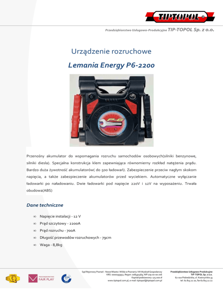 Urządzenie rozruchowe Lemania Energy P6-2200 Przenośny akumulator do wspomagania rozruchu samochodów osobowych(silniki benzynowe, silniki diesla). Specjalna konstrukcja klem zapewniająca równomierny rozkład natężenia prądu. Bardzo duża żywotność akumulatorów( do 500 ładowań). Zabezpieczenie przeciw nagłym skokom napięcia, a także zabezpieczenie akumulatorów przed wyciekiem. Automatyczne wyłączanie ładowarki po naładowaniu. Dwie ładowarki pod napięcie 220V i 12V na wyposażeniu. Trwała obudowa(ABS) Dane techniczne • Napięcie instalacji - 12 V • Prąd szczytowy - 2200A • Prąd rozruchu - 700A • Długość przewodów rozruchowych - 79cm • Waga - 8,8kg Sąd Rejonowy Poznań - Nowe Miasto i Wilda w Poznaniu VIII Wydział Gospodarczy KRS: 0000195952, Regon: 008491569, NIP:779-00-00-706 Kapitał podstawowy: 175.000 zł www.tiptopol.com.pl, e-mail: [email protected] Przedsiębiorstwo Usługowo-Produkcyjne TIP-TOPOL Sp. z o.o. 62-010 Pobiedziska, ul. Kostrzyńska 33 tel. 61 815 22 20, fax 61 815 22 22