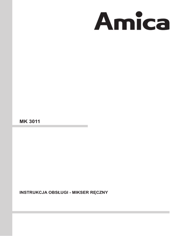 MK 3011 INSTRUKCJA OBSŁUGI - MIKSER RĘCZNY 1 2 4 5 6 3 1 2 3 4 5 2 SZANOWNY KLIENCIE, Urządzenie marki Amica to połączenie wyjątkowej łatwości obsługi i doskonałej efektywności. Po prze czytaniu niniejszej instrukcji, obsługa urządzenia nie będzie problemem. Prosimy Państwa o uważną lekturę instrukcji obsługi przed uruchomieniem urządzenia. Przestrzeganie zawartych w niej wskazówek uchroni Państwa przed niewłaściwym użytkowaniem. Instrukcję należy zachować i przechowywać tak, aby mieć ją zawsze pod ręką. Należy dokładnie przestrzegać instrukcji obsługi w celu uniknięcia nieszczęśliwych wypadków. Uwaga! Urządzenie przeznaczone jest wyłącznie do użytku domowego. Producent zastrzega sobie możliwość dokonywania zmian niewpływających na działanie urządzenia. spis treści Wskazówki dotyczące bezpieczeństwa użytkowania........................................4 Obsługa..................................................................................................................5 Porady dotyczące poszczególnych prędkości...................................................6 Czyszczenie i konserwacja..................................................................................6 Dane techniczne....................................................................................................7 Gwarancja, obsługa posprzedażna.....................................................................7 Masz wątpliwości? Nie wszystko, co przeczytałeś w instrukcji jest zrozumiałe? - zadzwoń do Centrum Serwisowego, gdzie uzyskasz wszechstronną pomoc. tel. 801 801 800 3 WSKAZÓWKI DOTYCZĄCE BEZPIECZEŃSTWA UŻYTKOWANIA Uwaga! Aby zminimalizować ryzyko powstania pożaru, porażenia prądem lub uszkodzenia ciała: lUważnie przeczytaj tą instrukcję przed użytkowaniem urządzenia. l Dzieci nie zdają sobie sprawy z niebezpieczeństw, które mogą powstać podczas używania urządzeń elektrycznych; dlatego trzymaj urządzenie poza zasięgiem dzieci. l Nie zanurzaj korpusu urządzenia w wodzie lub innych cieczach. Zanurzenie w wodzie może spowodować porażenie prądem elektrycznym. l W przypadku zalania wodą zewnętrznych elementów urządzenia, przed ponownym włącze niem urządzenia do sieci dokładnie je wysusz. Nie dotykaj mokrych powierzchni mających kontakt z podłączonym do zasilania urządzeniem, należy natychmiast odłączyć je od zasila nia. l Nie używaj urządzenia, jeżeli wykazuje ono jakiekolwiek oznaki uszkodzenia przewodu przy łączeniowego lub jeżeli urządzenie zostało upuszczone na podłogę. l Po użyciu zawsze wyciągaj wtyczkę z gniazdka a także w przypadku jakiegokolwiek niewła ściwego działania, przed czyszczeniem lub przed wymianą akcesoriów. l Przy wyciąganiu wtyczki z gniazdka ściennego nigdy nie ciągnij za przewód tylko za wtyczkę jednocześnie trzymając drugą ręką gniazdko sieciowe. l Urządzenie jest wykonane w II klasie ochrony przeciwporażeniowej. l Nie próbuj usuwać żadnych części obudowy. l Aby uniknąć uszkodzenia przewodu zasilającego nie umieszczaj go ponad ostrymi krawę dziami, ani w pobliżu gorących powierzchni. l Nie wystawiaj urządzenia na deszcz lub wilgoć i nie używaj urządzenia na zewnątrz. Nie obsługuj urządzenia mokrymi rękoma. l Jeżeli przewód sieciowy lub wtyczka ulegną uszkodzeniu, to powinny one być wymienione przez specjalistyczny zakład naprawczy w celu uniknięcia zagrożenia. lUżywanie akcesoriów, które nie zostały dostarczone wraz z produktem może doprowadzić do uszkodzenia urządzenia. lNigdy nie stawiaj urządzenia na gorących powierzchniach. lNależy zachować ostrożność przy myciu akcesoriów. lNigdy nie zostawiaj urządzenia podłączonego do sieci bez nadzoru. l Niniejszy sprzęt nie jest przeznaczony do użytkowania przez osoby (w tym dzieci) o ograni czonej zdolności fizycznej, czuciowej lub psychicznej, lub osoby o braku doświadczenia lub znajomości sprzętu, chyba że odbywa się to pod nadzorem lub zgodnie z instrukcją użyt kowania sprzętu, przekazaną przez osoby odpowiadające za ich bezpieczeństwo. Należy zwracać uwagę na dzieci, by nie bawiły się urządzeniem. lWyciągaj wtyczkę z gniazda sieciowe przed zmianą akcesoriów. l To urządzenie może być używane przez dzieci w wieku 8 lat i starsze, przez osoby o ogra niczonej zdolności fizycznej, czuciowej lub psychicznej oraz osoby o braku doświadczenia lub znajomości sprzętu, gdy są one nadzorowane lub zostały poinstruowane na temat korzystania z urządzenia w sposób bezpieczny i znają zagrożenia związana z użytkowa niem urządzenia. Dzieci nie powinny bawić się urządzeniem. Czyszczenie i konserwacja urządzenia nie powinna być wykonywania przez dzieci chyba że ukończyły 8 lat i są nadzo rowane przez odpowiednią osobę. l Powierzchnia na której jest użytkowane urządzenie powinna być wypoziomowana czysta i sucha. l Do włączenia / wyłączenia urządzenia służą przełączniki oznaczone w zależności od mo delu ON (włączony) / OFF (wyłączony) lub I (włączony) / O (wyłączony). l Nie używaj urządzenia w połączeniu z gotującą się żywnością. lW przypadku zablokowania elementów rozdrabniających / miksujących, przed usunięciem blokujących składników, wyciągnij wtyczkę z gniazdka. Zachowaj szczególną ostrożność. Elementy rozdrabniające są bardzo ostre. l Podczas pracy nie dotykaj żadnych elementów poza korpusem i/ lub pojemnikiem. Pozo stałe elementy podczas pracy mogą powodować zagrożenie dla życia i/ lub zdrowia. lPodczas pracy korzystaj tylko z jednego rodzaju dołączonych akcesoriów, nie używaj akce soriów o różnych funkcjach jednocześnie. lPodczas pracy na biegach 1-5 nie używaj urządzenia dłużej niż 3 minuty, podczas pracy na biegu turbo nie używaj urządzenia dłużej niż 1 minutę. Przed kolejnym użyciem poczekaj aż urządzenie ostygnie (aż jego temperatura zr