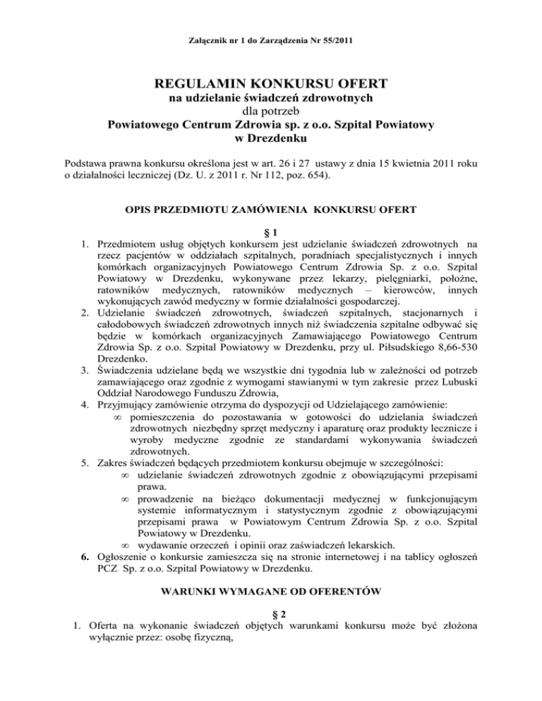 Załącznik nr 1 do Zarządzenia Nr 55/2011 REGULAMIN KONKURSU OFERT na udzielanie świadczeń zdrowotnych dla potrzeb Powiatowego Centrum Zdrowia sp. z o.o. Szpital Powiatowy w Drezdenku Podstawa prawna konkursu określona jest w art. 26 i 27 ustawy z dnia 15 kwietnia 2011 roku o działalności leczniczej (Dz. U. z 2011 r. Nr 112, poz. 654). OPIS PRZEDMIOTU ZAMÓWIENIA KONKURSU OFERT 1. 2. 3. 4. 5. 6. §1 Przedmiotem usług objętych konkursem jest udzielanie świadczeń zdrowotnych na rzecz pacjentów w oddziałach szpitalnych, poradniach specjalistycznych i innych komórkach organizacyjnych Powiatowego Centrum Zdrowia Sp. z o.o. Szpital Powiatowy w Drezdenku, wykonywane przez lekarzy, pielęgniarki, położne, ratowników medycznych, ratowników medycznych – kierowców, innych wykonujących zawód medyczny w formie działalności gospodarczej. Udzielanie świadczeń zdrowotnych, świadczeń szpitalnych, stacjonarnych i całodobowych świadczeń zdrowotnych innych niż świadczenia szpitalne odbywać się będzie w komórkach organizacyjnych Zamawiającego Powiatowego Centrum Zdrowia Sp. z o.o. Szpital Powiatowy w Drezdenku, przy ul. Piłsudskiego 8,66-530 Drezdenko. Świadczenia udzielane będą we wszystkie dni tygodnia lub w zależności od potrzeb zamawiającego oraz zgodnie z wymogami stawianymi w tym zakresie przez Lubuski Oddział Narodowego Funduszu Zdrowia, Przyjmujący zamówienie otrzyma do dyspozycji od Udzielającego zamówienie: • pomieszczenia do pozostawania w gotowości do udzielania świadczeń zdrowotnych niezbędny sprzęt medyczny i aparaturę oraz produkty lecznicze i wyroby medyczne zgodnie ze standardami wykonywania świadczeń zdrowotnych. Zakres świadczeń będących przedmiotem konkursu obejmuje w szczególności: • udzielanie świadczeń zdrowotnych zgodnie z obowiązującymi przepisami prawa. • prowadzenie na bieżąco dokumentacji medycznej w funkcjonującym systemie informatycznym i statystycznym zgodnie z obowiązującymi przepisami prawa w Powiatowym Centrum Zdrowia Sp. z o.o. Szpital Powiatowy w Drezdenku. • wydawanie orzeczeń i opinii oraz zaświadczeń lekarskich. Ogłoszenie o konkursie zamieszcza się na stronie internetowej i na tablicy ogłoszeń PCZ Sp. z o.o. Szpital Powiatowy w Drezdenku. WARUNKI WYMAGANE OD OFERENTÓW §2 1. Oferta na wykonanie świadczeń objętych warunkami konkursu może być złożona wyłącznie przez: osobę fizyczną, - wykonującą zawód medyczny w ramach indywidualnej praktyki lekarskiej, indywidualnej specjalistycznej praktyki lekarskiej, spółki cywilnej, spółki jawnej, spółki partnerskiej - wykonującą zawód medyczny w ramach indywidualnej praktyki pielęgniarskiej, indywidualnej specjalistycznej praktyki pielęgniarskiej, spółki cywilnej, spółki jawnej, spółki partnerskiej, - inną /magistra, licencjata, technika, specjalistki/ legitymującą się nabyciem fachowych kwalifikacji do udzielania świadczeń zdrowotnych w określonym zakresie oraz spełniający warunki określone w przepisach o działalności gospodarczej w zakresie ochrony życia ludzkiego. 2. Oferent przyjmuje warunek rozliczani finansowego po zakończeniu każdego miesiąca kalendarzowego, na podstawie wystawionej faktury (rachunku) wynikającej z umowy, płatnej w terminie do 25-go dnia każdego miesiąca za miesiąc poprzedni. WARUNKI JAKIE POWINIEN SPEŁNIAĆ OFERENT - WYMAGANE DOKUMENTY §3 1. Oferta powinna zawierać następujące dokumenty: • wypełniony formularz ofertowy (zgodnie z załącznikiem nr 1) • CV (wyłącznie oferenci, którzy dotychczas nie posiadali umów z Szpital Powiatowy w Drezdenku), • dokumenty potwierdzające kwalifikacje zawodowe osób, które będą udzielały świadczeń zdrowotnych w postaci: a) kopi dyplomu ukończenia szkoły medycznej, b) kopi dokumentów potwierdzających posiadaną specjalizację, kurs specjalistyczny, kurs kwalifikacyjny, c) kopi prawa wykonywania zawodu, • kopię wpisu do ewidencji działalności gospodarczej, • kopię decyzji o nadaniu NIP i REGON, • umowę obowiązkowego ubezpieczenia od odpowiedzialności cywilnej za szkody wyrządzone przy udzielaniu świadczeń zdrowotnych (okres ubezpieczenia nie może być krótszy nisz czas trwania umowy) dostarczoną w ciągu 30 dni od daty podpisania umowy wraz z dowodami opłacenia składki, • określenie dostępności i dyspozycyjności oferenta w zakresie świadczenia usługi, • akceptację okresu trwania umowy, • oświadczenie wymagane od oferentów stanowi załącznik nr 2 2. Warunek uzyskania wpisu do rejestru uważa się za zachowany, jeżeli Oferent przedstawi potwierdzenie przez właściwy urząd miasta lub gminy złożenia wniosku o wydanie zezwolenia na działalność gospodarczą. 3. Dopuszcza się złożenie kserokopii w/w dokumentów, które dla swojej ważności winny być potwierdzone za zgodność z oryginałem przez Oferenta. 4. Oryginały dokumentów dotyczących kwalifikacji do wglądu przed podpisaniem umowy. §4 1. W przypadku braku dokumentów i oświadczeń wskazanych w § 3 lub złożenie ich w niewłaściwej formie Zamawiający może wezwać Oferenta do usunięcia braków formalnych w ciągu 48 godzin pod rygorem odrzucenia ofert. 2. Brak formularza lub jego niewypełnienie skutkuje odrzuceniem oferty. ZASADY PRZYGOTOWANIA OFERTY §5 1. Oferenci ponoszą wszelkie koszty związane z przygotowaniem i złożeniem oferty. 2. Oferta powinna być sporządzona w języku polskim, w sposób czytelny i przejrzysty. 3. Ofertę należy złożyć w pojedynczej, zaklejonej kopercie, odpowiednio opisanej, w terminie i miejscu określonym w ogłoszeniu o konkursie ofert. 4. Zaleca się aby strony oferty były ponumerowane i podpisane przez Oferenta. 5. Oferta nie powinna zawierać żadnych dopisków między wierszami, zaś naniesione poprawki winny być parafowane przez Oferenta. TERMIN I MIEJSCE SKŁADANIA OFERT §6 1. Zasady opisania koperty zawierającą ofertę: a) Ofertę wraz z załącznika