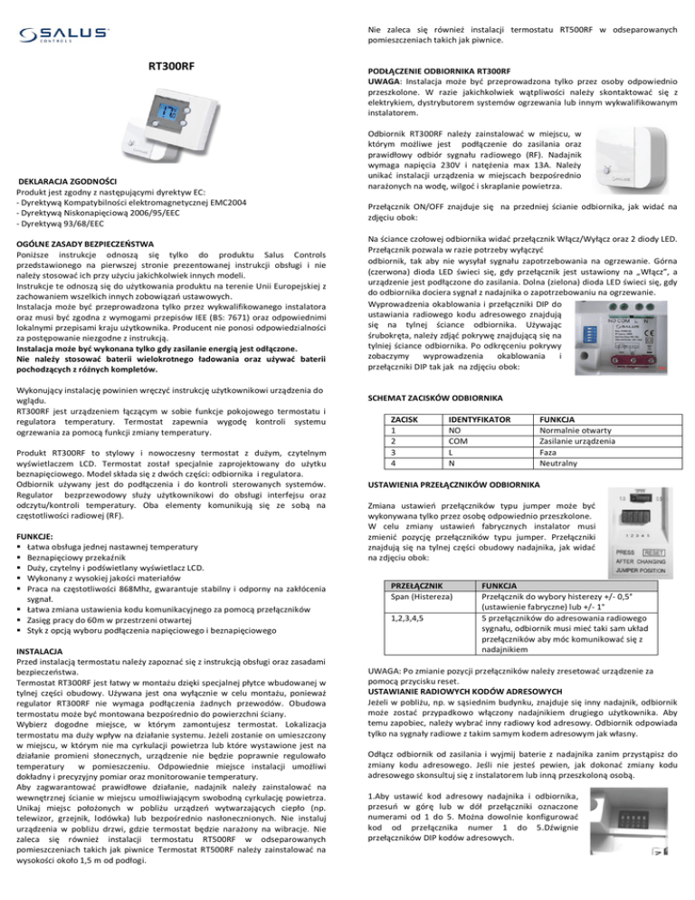 Nie zaleca się również instalacji termostatu RT500RF w odseparowanych pomieszczeniach takich jak piwnice. RT300RF DEKLARACJA ZGODNOŚCI Produkt jest zgodny z następującymi dyrektyw EC: - Dyrektywą Kompatybilności elektromagnetycznej EMC2004 - Dyrektywą Niskonapięciową 2006/95/EEC - Dyrektywą 93/68/EEC OGÓLNE ZASADY BEZPIECZEOSTWA Poniższe instrukcje odnoszą się tylko do produktu Salus Controls przedstawionego na pierwszej stronie prezentowanej instrukcji obsługi i nie należy stosowad ich przy użyciu jakichkolwiek innych modeli. Instrukcje te odnoszą się do użytkowania produktu na terenie Unii Europejskiej z zachowaniem wszelkich innych zobowiązao ustawowych. Instalacja może byd przeprowadzona tylko przez wykwalifikowanego instalatora oraz musi byd zgodna z wymogami przepisów IEE (BS: 7671) oraz odpowiednimi lokalnymi przepisami kraju użytkownika. Producent nie ponosi odpowiedzialności za postępowanie niezgodne z instrukcją. Instalacja może byd wykonana tylko gdy zasilanie energią jest odłączone. Nie należy stosowad baterii wielokrotnego ładowania oraz używad baterii pochodzących z różnych kompletów. Wykonujący instalację powinien wręczyd instrukcję użytkownikowi urządzenia do wglądu. RT300RF jest urządzeniem łączącym w sobie funkcje pokojowego termostatu i regulatora temperatury. Termostat zapewnia wygodę kontroli systemu ogrzewania za pomocą funkcji zmiany temperatury. Produkt RT300RF to stylowy i nowoczesny termostat z dużym, czytelnym wyświetlaczem LCD. Termostat został specjalnie zaprojektowany do użytku beznapięciowego. Model składa się z dwóch części: odbiornika i regulatora. Odbiornik używany jest do podłączenia i do kontroli sterowanych systemów. Regulator bezprzewodowy służy użytkownikowi do obsługi interfejsu oraz odczytu/kontroli temperatury. Oba elementy komunikują się ze sobą na częstotliwości radiowej (RF). FUNKCJE: Łatwa obsługa jednej nastawnej temperatury Beznapięciowy przekaźnik Duży, czytelny i podświetlany wyświetlacz LCD. Wykonany z wysokiej jakości materiałów Praca na częstotliwości 868Mhz, gwarantuje stabilny i odporny na zakłócenia sygnał. Łatwa zmiana ustawienia kodu komunikacyjnego za pomocą przełączników Zasięg pracy do 60m w przestrzeni otwartej Styk z opcją wyboru podłączenia napięciowego i beznapięciowego INSTALACJA Przed instalacją termostatu należy zapoznad się z instrukcją obsługi oraz zasadami bezpieczeostwa. Termostat RT300RF jest łatwy w montażu dzięki specjalnej płytce wbudowanej w tylnej części obudowy. Używana jest ona wyłącznie w celu montażu, ponieważ regulator RT300RF nie wymaga podłączenia żadnych przewodów. Obudowa termostatu może byd montowana bezpośrednio do powierzchni ściany. Wybierz dogodne miejsce, w którym zamontujesz termostat. Lokalizacja termostatu ma duży wpływ na działanie systemu. Jeżeli zostanie on umieszczony w miejscu, w którym nie ma cyrkulacji powietrza lub które wystawione jest na działanie promieni słonecznych, urządzenie nie będzie poprawnie regulowało temperatury w pomieszczeniu. Odpowiednie miejsce instalacji umożliwi dokładny i precyzyjny pomiar oraz monitorowanie temperatury. Aby zagwarantowad prawidłowe działanie, nadajnik należy zainstalowad na wewnętrznej ścianie w miejscu umożliwiającym swobodną cyrkulację powietrza. Unikaj miejsc położonych w pobliżu urządzeo wytwarzających ciepło (np. telewizor, grzejnik, lodówka) lub bezpośrednio nasłonecznionych. Nie instaluj urządzenia w pobliżu drzwi, gdzie termostat będzie narażony na wibracje. Nie zaleca się również instalacji termostatu RT500RF w odseparowanych pomieszczeniach takich jak piwnice Termostat RT500RF należy zainstalowad na wysokości około 1,5 m od podłogi. PODŁĄCZENIE ODBIORNIKA RT300RF UWAGA: Instalacja może byd przeprowadzona tylko przez osoby odpowiednio przeszkolone. W razie jakichkolwiek wątpliwości należy skontaktowad się z elektrykiem, dystrybutorem systemów ogrzewania lub innym wykwalifikowanym instalatorem. Odbiornik RT300RF należy zainstalowad w miejscu, w którym możliwe jest podłączenie do zasilania oraz prawidłowy odbiór sygnału radiowego (RF). Nadajnik wymaga napięcia 230V i natężenia max 13A. Należy unikad instalacji urządzenia w miejscach bezpośrednio narażonych na wodę, wilgod i skraplanie powietrza. Przełącznik ON/OFF znajduje się na przedniej ścianie odbiornika, jak widad na zdjęciu obok: Na ściance czołowej odbiornika widad przełącznik Włącz/Wyłącz oraz 2 diody LED. Przełącznik pozwala w razie potrzeby wyłączyd odbiornik, tak aby nie wysyłał sygnału zapotrzebowania na ogrzewanie. Górna (czerwona) dioda LED świeci się, gdy przełącznik jest ustawiony na „Włącz”, a urządzenie jest podłączone do zasilania. Dolna (zielona) dioda LED świeci się, gdy do odbiornika dociera sygnał z nadajnika o zapotrzebowaniu na ogrzewanie. Wyprowadzenia okablowania i przełączniki DIP do ustawiania radiowego kodu adresowego znajdują się na tylnej ściance odbiornika. Używając śrubokręta, należy zdjąd pokrywę znajdującą się na tylniej ściance odbiornika. Po odkręceniu pokrywy zobaczymy wyprowadzenia okablowania i przełączniki DIP tak jak na zdjęciu obok: SCHEMAT ZACISKÓW ODBIORNIKA ZACISK 1 2 3 4 IDENTYFIKATOR NO COM L N FUNKCJA Normalnie otwarty Zasilanie urządzenia Faza Neutralny USTAWIENIA PRZEŁĄCZNIKÓW ODBIORNIKA Zmiana ustawieo przełączników typu jumper może byd wykonywana tylko przez osobę odpowiednio przeszkolone. W celu zmiany ustawieo fabrycznych instalator musi zmienid pozycję przełączników typu jumper. Przełączniki znajdują się na tylnej części obudowy nadajnika, jak widad na zdjęciu obok: PRZEŁĄCZNIK Span (Histereza) 1,2,3,4,5 FUNKCJA Przełącznik do wybory histerezy +/- 0,5° (ustawienie fabryczne) lub +/- 1° 5 przełączników do adresowania radiowego sygnału, odbiornik musi mied taki s