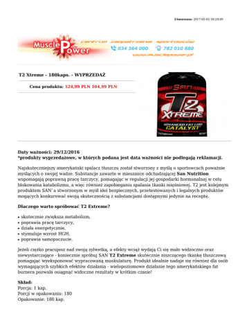Utworzono: 2017-03-02 18:29:09 T2 Xtreme - 180kaps. - WYPRZEDAŻ Cena produktu: 124,99 PLN 104,99 PLN Daty ważności: 29/12/2016 *produkty wyprzedażowe, w których podana jest data ważności nie podlegają reklamacji. Najskuteczniejszy amerykański spalacz tłuszczu został stworzony z myślą o sportowcach poważnie myślących o swojej wadze. Substancje zawarte w mieszance odchudzającej San Nutrition wspomagają poprawną pracę tarczycy, pomagając w regulacji jej gospodarki hormonalnej w celu blokowania katabolizmu, a więc również zapobieganiu spalania tkanki mięśniowej. T2 jest kolejmym produktem SAN`a stworzonym w myśl idei bezpiecznych, przetestowanych i legalnych produktów mogących konkurować swoją skutecznością z substancjami dostępnymi jedynie na receptę. Dlaczego warto spróbować T2 Extreme? ● ● ● ● ● skutecznie zwiększa metabolizm, poprawia pracę tarczycy, działa energetycznie, stymuluje wzrost HGH, poprawia samopoczucie. Jeżeli ciężko pracujesz nad swoją sylwetką, a efekty wciąż wydają Ci się mało widzoczne oraz niewystarczające - koniecznie spróbuj SAN T2 Extreme skutecznie niszczącego tkankę tłuszczową pomagając wyeksponować wypracowaną muskulaturę. Produkt idealnie nadaje się również dla osób wymagających szybkich efektów działania - wielopoziomowe działanie tego amerykańskiego fat burnera pozwala osiągnąć widoczne rezultaty w krótkim czasie! Skład: Porcja: 1 kap. Porcji w opakowaniu: 180 Opakowanie: 180 kap. Wartość odżywcza w 1 porcji 3,3-Diiodo-L-Thyronine 100mcg 3,5-Diiodo-L-Thyronine 100mcg Dawkowanie: 1 porcja dziennie. Nie przekraczać porcji 6 kap. na dobę. Adres: http://www.muscle.trustnet.pl/ Telefon: 34 36 43 000, 782 010 880 Email: [email protected]