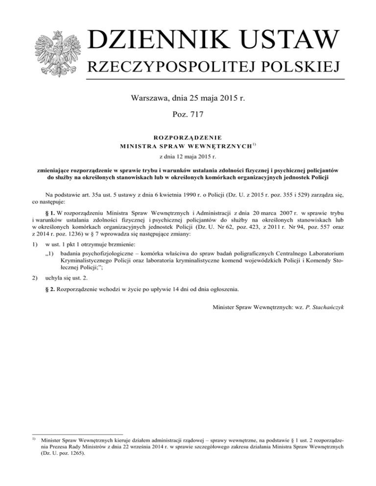 DZIENNIK USTAW RZECZYPOSPOLITEJ POLSKIEJ Warszawa, dnia 25 maja 2015 r. Poz. 717 RO ZPO R ZĄ D ZE N I E M INI S TR A SPR AW W E WN Ę TR ZN Y CH 1) z dnia 12 maja 2015 r. zmieniające rozporządzenie w sprawie trybu i warunków ustalania zdolności fizycznej i psychicznej policjantów do służby na określonych stanowiskach lub w określonych komórkach organizacyjnych jednostek Policji Na podstawie art. 35a ust. 5 ustawy z dnia 6 kwietnia 1990 r. o Policji (Dz. U. z 2015 r. poz. 355 i 529) zarządza się, co następuje: § 1. W rozporządzeniu Ministra Spraw Wewnętrznych i Administracji z dnia 20 marca 2007 r. w sprawie trybu i warunków ustalania zdolności fizycznej i psychicznej policjantów do służby na określonych stanowiskach lub w określonych komórkach organizacyjnych jednostek Policji (Dz. U. Nr 62, poz. 423, z 2011 r. Nr 94, poz. 557 oraz z 2014 r. poz. 1236) w § 7 wprowadza się następujące zmiany: 1) w ust. 1 pkt 1 otrzymuje brzmienie: „1) 2) badania psychofizjologiczne – komórka właściwa do spraw badań poligraficznych Centralnego Laboratorium Kryminalistycznego Policji oraz laboratoria kryminalistyczne komend wojewódzkich Policji i Komendy Stołecznej Policji;”; uchyla się ust. 2. § 2. Rozporządzenie wchodzi w życie po upływie 14 dni od dnia ogłoszenia. Minister Spraw Wewnętrznych: wz. P. Stachańczyk 1) Minister Spraw Wewnętrznych kieruje działem administracji rządowej – sprawy wewnętrzne, na podstawie § 1 ust. 2 rozporządzenia Prezesa Rady Ministrów z dnia 22 września 2014 r. w sprawie szczegółowego zakresu działania Ministra Spraw Wewnętrznych (Dz. U. poz. 1265).