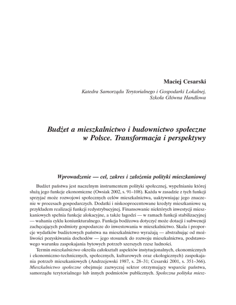 Maciej Cesarski Katedra Samorządu Terytorialnego i Gospodarki Lokalnej, Szkoła Główna Handlowa Budżet a mieszkalnictwo i budownictwo społeczne w Polsce. Transformacja i perspektywy Wprowadzenie — cel, zakres i założenia polityki mieszkaniowej Budżet państwa jest naczelnym instrumentem polityki społecznej, wypełnianiu której służą jego funkcje ekonomiczne (Owsiak 2002, s. 91–108). Każda w zasadzie z tych funkcji sprzyjać może rozwojowi społecznych celów mieszkalnictwa, uaktywniając jego znaczenie w procesach gospodarczych. Dodatki i niskooprocentowane kredyty mieszkaniowe są przykładem realizacji funkcji redystrybucyjnej. Finansowanie niektórych inwestycji mieszkaniowych spełnia funkcje alokacyjne, a także łagodzi — w ramach funkcji stabilizacyjnej — wahania cyklu koniunkturalnego. Funkcja bodźcowa dotyczyć może dotacji i subwencji zachęcających podmioty gospodarcze do inwestowania w mieszkalnictwo. Skala i proporcje wydatków budżetowych państwa na mieszkalnictwo wyrażają — abstrahując od możliwości pozyskiwania dochodów — jego stosunek do rozwoju mieszkalnictwa, podstawowego warunku zaspokajania bytowych potrzeb szerszych rzesz ludności. Termin mieszkalnictwo określa całokształt aspektów instytucjonalnych, ekonomicznych i ekonomiczno-technicznych, społecznych, kulturowych oraz ekologicznych) zaspokajania potrzeb mieszkaniowych (Andrzejewski 1987, s. 28–31; Cesarski 2001, s. 351–366). Mieszkalnictwo społeczne obejmuje zazwyczaj sektor otrzymujący wsparcie państwa, samorządu terytorialnego lub innych podmiotów publicznych. Społeczna polityka miesz- 30 Maciej Cesarski kaniowa utożsamiana jest najczęściej z redystrybucją dochodów na rzecz wspomagania konsumpcji usług mieszkaniowych przez mniej zamożne grupy ludności. Termin mieszkalnictwo socjalne używany jest w węższym znaczeniu na określenie zespołu przedsięwzięć rządowych i samorządowych w celu udostępnienia gospodarstwom domowych o niskich lub symbolicznych dochodach mieszkań o skromnym, niemniej współczesnym standardzie. Brakuje jednak w Polsce i Europie jednoznacznych definicji i kryteriów w tym zakresie (Guidelines on social housing…, 2006, s. 10–13; Poverty and exclusion…, 2007, s. 58–60). Historia współczesnego — ewoluującego od rewolucji przemysłowej — mieszkalnictwa, w tym zorientowanej społecznie polityki mieszkaniowej w państwach Europy Zachodniej świadczy o różnych celach, fazach, zależnościach i modelach w tym zakresie. Wskazuje jednak dwa generalne sposoby uogólniania dziejów mieszkalnictwa społecznego w formie modeli: masowego („uniwersalnego”) oraz rezydualnego („pozostałościowego”). Fazy w dziejach mieszkalnictwa społecznego uogólniane w tych modelach łączą się przy tym z kryzysami gospodarczymi w XX i XXI wieku 1. Generalnym przekazem historii mieszkalnictwa jest nauka, że państwa aspirujące do nowoczesnego rozwoju cywilizacyjnego muszą redukować ilościowy deficyt mieszkań jako elementarny wyznacznik i próg poprawy sytuacji mieszkaniowej decydującej o warunkach bytu szerokich rzesz ludności. Redukowanie to możliwe jest w efekcie wzmożonego, dotowanego z budżetu państwa, społecznego budownictwa zaspokajającego potrzeby mieszkaniowe umiarkowanie i słabo sytuowanej ludności (Andrzejewski, Donnison 1966, s. 10-56; Andrzejewski, Lujanen 1980, s. 5–42; Cesarski 2004, s. 419-434; Malpass 2008, s. 15–30; Cesarski 2010, s. 341–355). Uznaną za podstawową miarą rozwiązywania tego problemu jest ogólne zrównywanie się liczby mieszkań i gospodarstw domowych. Stan ten osiągnięty jest w zasadzie w rozwiniętych gospodarkach rynkowych Europy Zachodniej na przełomie lat 60. i 70. W gospodarkach tych dominuje wtedy model społecznego mieszkalnictwa typu masowego (uniwersalnego) w najbardziej dojrzałej, znanej kapitalizmowi, postaci. Na południowych obrzeżach ówczesnego europejskiego kapitalizmu, o specyficznym modelu polityki mieszkaniowej z pozostałościami feudalnymi, proces ograniczania przejawów kwestii mieszkaniowej jest znacznie wolniejszy (Andrzejewski 1974, s. 378–385, 1987, s. 32–60; Allen, Barlow, Leal, Maloutas, Padovani 2004, s. 15–8; Cesarski 2007, s. 267–277). Załamanie się wysokiego wzrostu ekonomicznego spotęgowane kryzysem naftowym z 1973 roku rozpoczyna w Europie Zachodniej wolnorynkowe, liberalne podejście do W literaturze anglojęzycznej używane są terminy: mass model of social housing (lub universalist model of social housing) oraz residual model of social housing. Model masowy polega na dążeniu państwa i innych instytucji publicznych do szerokiego wspomagania rozwoju zintegrowanej, zwykle wielorodzinnej zabudowy mieszkaniowej przeznaczanej dla słabo, a także średnio sytuowanej ludności pracowniczej. Pomoc w zdobyciu mieszkania traktowana jest tu jako wartość wykraczająca poza funkcje stricte mieszkaniowe. W modelu rezydualnym zakłada się przede wszystkim wspomaganie tych jednostek i grup społecznych, których nie stać na zakup mieszkania na rynku. Zob. Cesarski 2009, s. 39–49. 1 Budżet a mieszkalnictwo i budownictwo społeczne w Polsce… 31 rozwoju społeczno-gospodarczego, w tym do mieszkalnictwa. Zarysowuje się tendencja do przywracania znanego z lat przedwojennych rezydualnego („pozostałościowego”) modelu mieszkalnictwa społecznego jako rzekomo bardziej przystającego do „normalnego” kapitalizmu. Niemożność długookresowej kontroli nad siłami rynku, wąsko rozumiana ekonomika decydują o zbieżnej w państwach kapitalistycznych polityce o różnym nasileniu skierowanej na ten model i wzrastającą indywidualną własność domów i mieszkań. Rezydualny model mieszkalnictwa społecznego jest bowiem łatwiejszy do godzenia z mechanizmami rynku, zwłaszcza w okresie spadku dynamiki PKB, stagflacji oraz innych groźnych dla kapitalizmu zjawisk i procesów społeczno-gospodarczych, w tym nadmiernego 