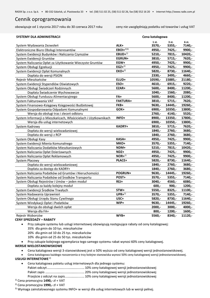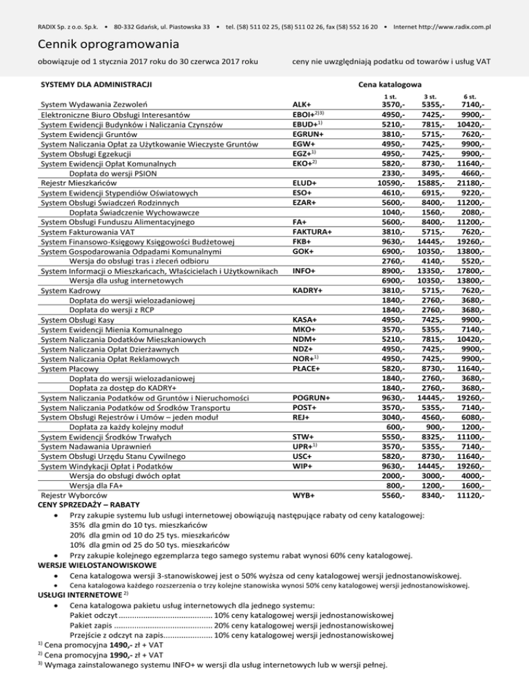 RADIX Sp. z o.o. Sp.k. • 80-332 Gdańsk, ul. Piastowska 33 • tel. (58) 511 02 25, (58) 511 02 26, fax (58) 552 16 20 • Internet http://www.radix.com.pl Cennik oprogramowania obowiązuje od 1 stycznia 2017 roku do 30 czerwca 2017 roku SYSTEMY DLA ADMINISTRACJI ceny nie uwzględniają podatku od towarów i usług VAT Cena katalogowa 1 st. 3 st. 6 st. System Wydawania Zezwoleń ALK+ 3570,5355,7140,2)3) EBOI+ 4950,7425,9900,Elektroniczne Biuro Obsługi Interesantów EBUD+1) 5210,7815,- 10420,System Ewidencji Budynków i Naliczania Czynszów EGRUN+ 3810,5715,7620,System Ewidencji Gruntów EGW+ 4950,7425,9900,System Naliczania Opłat za Użytkowanie Wieczyste Gruntów EGZ+1) 4950,7425,9900,System Obsługi Egzekucji EKO+2) 5820,8730,- 11640,System Ewidencji Opłat Komunalnych 2330,3495,4660,Dopłata do wersji PSION Rejestr Mieszkańców ELUD+ 10590,- 15885,- 21180,ESO+ 4610,6915,9220,System Ewidencji Stypendiów Oświatowych EZAR+ 5600,8400,- 11200,System Obsługi Świadczeń Rodzinnych 1040,1560,2080,Dopłata Świadczenie Wychowawcze System Obsługi Funduszu Alimentacyjnego FA+ 5600,8400,- 11200,FAKTURA+ 3810,5715,7620,System Fakturowania VAT FKB+ 9630,- 14445,- 19260,System Finansowo-Księgowy Księgowości Budżetowej GOK+ 6900,- 10350,- 13800,System Gospodarowania Odpadami Komunalnymi Wersja do obsługi tras i zleceń odbioru 2760,4140,5520,INFO+ 8900,- 13350,- 17800,System Informacji o Mieszkańcach, Właścicielach i Użytkownikach Wersja dla usług internetowych 6900,- 10350,- 13800,KADRY+ 3810,5715,7620,System Kadrowy 1840,2760,3680,Dopłata do wersji wielozadaniowej Dopłata do wersji z RCP 1840,2760,3680,KASA+ 4950,7425,9900,System Obsługi Kasy MKO+ 3570,5355,7140,System Ewidencji Mienia Komunalnego NDM+ 5210,7815,- 10420,System Naliczania Dodatków Mieszkaniowych NDZ+ 4950,7425,9900,System Naliczania Opłat Dzierżawnych NOR+1) 4950,7425,9900,System Naliczania Opłat Reklamowych PŁACE+ 5820,8730,- 11640,System Płacowy 1840,2760,3680,Dopłata do wersji wielozadaniowej Dopłata za dostęp do KADRY+ 1840,2760,3680,POGRUN+ 9630,- 14445,- 19260,System Naliczania Podatków od Gruntów i Nieruchomości POST+ 3570,5355,7140,System Naliczania Podatków od Środków Transportu System Obsługi Rejestrów i Umów – jeden moduł REJ+ 3040,4560,6080,Dopłata za każdy kolejny moduł 600,900,1200,STW+ 5550,8325,- 11100,System Ewidencji Środków Trwałych System Nadawania Uprawnień UPR+1) 3570,5355,7140,System Obsługi Urzędu Stanu Cywilnego USC+ 5820,8730,- 11640,WIP+ 9630,- 14445,- 19260,System Windykacji Opłat i Podatków Wersja do obsługi dwóch opłat 2000,3000,4000,Wersja dla FA+ 800,1200,1600,Rejestr Wyborców WYB+ 5560,8340,- 11120,CENY SPRZEDAŻY – RABATY Przy zakupie systemu lub usługi internetowej obowiązują następujące rabaty od ceny katalogowej: 35% dla gmin do 10 tys. mieszkańców 20% dla gmin od 10 do 25 tys. mieszkańców 10% dla gmin od 25 do 50 tys. mieszkańców Przy zakupie kolejnego egzemplarza tego samego systemu rabat wynosi 60% ceny katalogowej. WERSJE WIELOSTANOWISKOWE Cena katalogowa wersji 3-stanowiskowej jest o 50% wyższa od ceny katalogowej wersji jednostanowiskowej. Cena katalogowa każdego rozszerzenia o trzy kolejne stanowiska wynosi 50% ceny katalogowej wersji jednostanowiskowej. USŁUGI INTERNETOWE 2) Cena katalogowa pakietu usług internetowych dla jednego systemu: Pakiet odczyt .......................................... 10% ceny katalogowej wersji jednostanowiskowej Pakiet zapis ............................................ 20% ceny katalogowej wersji jednostanowiskowej Przejście z odczyt na zapis...................... 10% ceny katalogowej wersji jednostanowiskowej 1) Cena promocyjna 1490,- zł + VAT 2) Cena promocyjna 1990,- zł + VAT 3) Wymaga zainstalowanego systemu INFO+ w wersji dla usług internetowych lub w wersji pełnej. RADIX Sp. z o.o. Sp.k. • 80-332 Gdańsk, ul. Piastowska 33 • tel. (58) 511 02 25, (58) 511 02 26, fax (58) 552 16 20 • Internet http://www.radix.com.pl Cennik usług obowiązuje od 1 stycznia 2017 roku do 30 czerwca 2017 roku ceny nie uwzględniają podatku od towarów i usług VAT USŁUGI Szkolenie jednej osoby w siedzibie producenta Szkolenie zdalne Konsultacja serwisowa w siedzibie producenta Naprawa baz danych Przygotowanie dedykowanego szablonu wydruku Konsultacja serwisowa lub szkolenie w siedzibie użytkownika Konsultacja zdalna na życzenie użytkownika Przeniesienie bazy RADIX DOS Przeniesienie bazy RADIX SQL (np. z PostgreSQL na SQL Server) Scalenie baz RADIX Przeniesienie bazy obcej Przeniesienie bazy znanej Przeniesienie częściowe bazy obcej 74,- zł/godz.1) 107,- zł/godz. 148,- zł/godz. 590,- zł 97,- zł/godz., min. 1990,- zł 20% aktualnej ceny katalogowej systemu 97,- zł/godz., min. 990,- zł Do kosztów usług doliczany jest koszt dojazdu. Koszt dojazdu zależy od czasu dojazdu i jest przeliczany po cenie konsultacji w siedzibie użytkownika. Nadzór autorski nad wdrożeniem (ryczałt za 20 godz.) ............................................................. 2210,- zł Na 20-godzinny nadzór autorski nad wdrożeniem w siedzibie użytkownika leżącej w promieniu 60 km od siedziby producenta składają się: praca wykonywana w siedzibie użytkownika łącznie z dojazdem oraz praca wykonywana na jego rzecz w siedzibie producenta. Tryb sprawowania nadzoru autorskiego nad wdrożeniem w innych warunkach jest każdorazowo ustalany z użytkownikiem. Szkolenie ustawiczne w siedzibie użytkownika (jednostka 4 godz.) .......................................... 495,- zł Cechą wyróżniającą szkolenie ustawiczne od innych usług jest jego cykliczność wg harmonogramu ustalanego indywidualnie z użytkownikiem. Na czterogodzinną jednostkę szkoleniową składają się: sprawdzenie aktualności wersji oprogramowania zainstalowanego u użytkownika, sprawdzenie konfiguracji systemów oraz poprawności instalacji i aktualizacji, wskazanie nowych możliwości wprowadzonych w zaktualizowanych wersjach