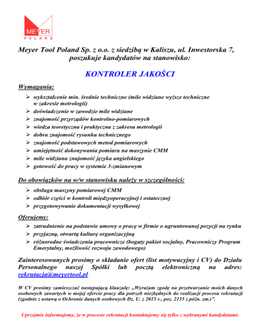 Meyer Tool Poland Sp. z o.o. z siedzibą w Kaliszu, ul. Inwestorska 7, poszukuje kandydatów na stanowisko: KONTROLER JAKOŚCI Wymagania: wykształcenie min. średnie techniczne (mile widziane wyższe techniczne w zakresie metrologii) doświadczenie w zawodzie mile widziane znajomość przyrządów kontrolno-pomiarowych wiedza teoretyczna i praktyczna z zakresu metrologii dobra znajomość rysunku technicznego znajomość podstawowych metod pomiarowych umiejętność dokonywania pomiaru na maszynie CMM mile widziana znajomość języka angielskiego gotowość do pracy w systemie 3-zmianowym Do obowiązków na w/w stanowisku należy w szczególności: obsługa maszyny pomiarowej CMM odbiór części w kontroli międzyoperacyjnej i ostatecznej przygotowywanie dokumentacji wysyłkowej Oferujemy: zatrudnienie na podstawie umowy o pracę w firmie o ugruntowanej pozycji na rynku przyjazną, otwartą kulturę organizacyjną różnorodne świadczenia pracownicze (bogaty pakiet socjalny, Pracowniczy Program Emerytalny, możliwość rozwoju zawodowego) Zainteresowanych prosimy o składanie ofert (list motywacyjny i CV) do Działu Personalnego naszej Spółki lub pocztą elektroniczną na adres: [email protected] W CV prosimy zamieszczać następującą klauzulę: „Wyrażam zgodę na przetwarzanie moich danych osobowych zawartych w mojej ofercie pracy dla potrzeb niezbędnych do realizacji procesu rekrutacji (zgodnie z ustawą o Ochronie danych osobowych Dz. U. z 2015 r., poz. 2135 z późn. zm.)”. Uprzejmie informujemy, że w procesie rekrutacji kontaktujemy się tylko z wybranymi kandydatami.