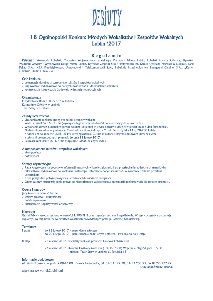18 Ogólnopolski Konkurs Młodych Wokalistów i Zespołów Wokalnych Lublin ‘2017 Regulamin Patronat: Wojewoda Lubelski, Marszałek Województwa Lubelskiego, Prezydent Miasta Lublin, Lubelski Kurator Oświaty, Dyrektor Wydziału Oświaty i Wychowania Urząd Miasta Lublin, Dyrektor Zespołu Szkół Plastycznych im. Kamila Cypriana Norwida w Lublinie, Bank Pekao S.A., KZA Przedsiębiorstwo Automatyki i Telekomunikacji S.A., Lubelskie Przedsiębiorstwo Energetyki Cieplnej S.A., „Kurier Lubelski”, Radio Lublin S.A. Cele konkursu . prezentacje dorobku artystycznego solistów i zespołów wokalnych . inspirowanie wykonawców do dalszych poszukiwań i udoskonalenie warsztatu . konfrontacje i aktywizacje środowisk twórczych i edukacyjnych Organizatorzy Młodzieżowy Dom Kultury nr 2 w Lublinie Kuratorium Oświaty w Lublinie Teatr Stary w Lublinie Zasady uczestnictwa . . . . Uczestnikami konkursu mogą być soliści i zespoły wokalne Wiek uczestników 15 - 21 lat (wymagana legitymacja lub dowód potwierdzający datę urodzenia) Wykonanie dwóch piosenek w języku polskim lub jednej w języku polskim a drugiej w języku kraju z Unii Europejskiej. Nadesłanie na adres organizatora: Młodzieżowy Dom Kultury nr 2, ul. Bernardyńska 14 a, 20-950 Lublin; z dopiskiem na kopercie „DEBIUTY”: karty zgłoszenia, CD lub minidiscu z nagraniami dwóch piosenek wraz z tekstami prezentowanych piosenek do dnia 15 lutego 2017 r. . Laureaci konkursu z 2016 r. nie mogą brać udziału w edycji 2017. Akompaniament solistów i zespołów wokalnych: . akompaniator . półplayback Sprawy organizacyjne . Rada Artystyczna na podstawie informacji zawartych w karcie zgłoszenia i po przesłuchaniu nadesłanych materiałów zakwalifikuje wykonawców do konkursu finałowego. Informacja dotycząca udziału w koncercie zostanie przesłana uczestnikom . Koszt przejazdu i pobytu pokrywają uczestnicy lub instytucje delegujące . Organizatorzy zastrzegają sobie prawo do nieodpłatnego wykorzystania prezentacji konkursowych dla potrzeb promocji. Ocena i nagrody Jury konkursu oceniać będzie: . walory głosowe i muzykalność . dobór repertuaru . interpretacje i ogólny wyraz artystyczny Nagrody: Grand Prix - nagroda rzeczowa o wartości 1.500 PLN oraz nagrody specjalne i wyróżnienia. Wszyscy uczestnicy otrzymują dyplomy i wezmą udział w warsztatach wokalnych prowadzonych przez p. Grażynę Łobaszewską. Terminarz I etap: do 15 lutego 2017 – przesyłanie zgłoszeń do 20 lutego 2017 – przesłuchania nadesłanych zgłoszeń - kwalifikacja do II etapu II etap: 22 marzec 2017 - warsztaty wokalne prowadzi Grażyna Łobaszewska 23 marzec 2017 - Koncert Finałowy konkursu (10:00-15:00) Wręczanie Nagród godz. 16:00 (miejsce: Teatr Stary w Lublinie ul. Jezuicka 18) Informacje dodatkowe: sekretariat konkursu w godz. 9:00-16:00 : Dorota Baranowska, tel. 81/53 177 70, 81/53 208 53; fax 81/53 177 79 [email protected] więcej na: www.mdk2.lublin.pl 18 Ogólnopolski Konkurs Młodych Wokalistów i Zespołów Wokalnych Lublin ‘2017 K A R T A Z G Ł O S Z E N I A 1. Imię, nazwisko i wiek wykonawcy / zespół wokalny(Prosimy podać dane każdego wykonawcy) ....................................................................................................................................... ....................................................................................................................................... ....................................................................................................................................... ....................................................................................................................................... 2. Tytuły utworów (autor, kompozytor): 1. ........................................................................................................................................ ....................................................................................................................................... 2. ........................................................................................................................................ ........................................................................................................................................ 3. Adres do korespondencji, telefon, e-mail: ........................................................................................................................................ ............................................................................................. powiat ................................ 4. Nazwa, adres, telefon, e-mail placówki delegującej: ........................................................................................................................................ .............................................................................................. powiat ............................... 5. Imię i nazwisko nauczyciela (opiekuna) ................................................................................... 6. Wymagania techniczne ........................................................................................................ 7. Rodzaj akompaniamentu ...................................................................................................... Własny* drugiej osoby* półplayback* A’Capella* 8. Informacje o wykonawcy, zespole (dla konferansjera): ……………………………………………………………………………………………………………………… ……………………………………………………………………………………………………………………… ........................................................................................................................................ Potwierdzam znajomość regulaminu konkursu i zobowiązuję się do przestrzegania ustaleń organizatora. ............................