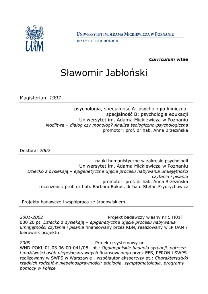 Curriculum vitae Sławomir Jabłoński Magisterium 1997 psychologia, specjalność A: psychologia kliniczna, specjalność B: psychologia edukacji Uniwersytet im. Adama Mickiewicza w Poznaniu Modlitwa – dialog czy monolog? Analiza teologiczno-psychologiczna promotor: prof. dr hab. Anna Brzezińska Doktorat 2002 nauki humanistyczne w zakresie psychologii Uniwersytet im. Adama Mickiewicza w Poznaniu Dziecko z dysleksją – epigenetyczne ujęcie procesu nabywania umiejętności czytania i pisania promotor: prof. dr hab. Anna Brzezińska recenzenci: prof. dr hab. Barbara Bokus, dr hab. Stefan Frydrychowicz Projekty badawcze i współpraca ze środowiskiem 2001-2002 Projekt badawczy własny nr 5 H01F 030 20 pt. Dziecko z dysleksją – epigenetyczne ujęcie procesu nabywania umiejętności czytania i pisania finansowany przez KBN, realizowany w IP UAM / kierownik projektu 2009 Projektu systemowy nr WND-POKL-01.03.06-00-041/08 nt.: Ogólnopolskie badania sytuacji, potrzeb i możliwości osób niepełnosprawnych finansowanego przez EFS, PFRON i SWPS realizowany w SWPS w Warszawie - współautor ekspertyzy pt.: Charakterystyki rzadkich rodzajów niepełnosprawności: etiologia, symptomatologia, programy pomocy w Polsce 2010-2014 projekt badawczy nr N N106 047839 pt. Konstrukcja narzędzi do psychologicznej diagnozy gotowości do uczenia się dzieci w wieku od 3 do 11 roku życia finansowany przez MNiSW, realizowany w IP UAM / kierownik projektu Staże zagraniczne i wizyty studyjne 1998 USA: Washington, Waterford, Columbus, 5-29.10.1998. CIVITAS: International Civic Education Exchange IV, organizatorzy: American Federation of Teachers, Michigan Center for Civic Education through Law Mershon Center at Ohio State University Centrum Edukacji Obywatelskiej w Warszawie forma udziału: członek zespołu opracowującego autorski program kształcenia blokowego dla przedmiotu Historia i Społeczeństwo dla klas IV-VI 2009 Niemcy: Berlin, 30.08-06.09. 2009. Praktyki studenckie – program wymiany studentów Instytutu Psychologii Uniwersytetu Humboldta w Berlinie i Instytutu Psychologii Adama Mickiewicza w Poznaniu finansowany przez Niemiecką Centralę Wymiany Akademickiej. forma udziału: opiekun grupy polskich studentów, uczestnik szkolenia pt. Podstawy neuroobrazowania procesów poznawczych z wykorzystaniem potencjałów wywołanych (30 godzin) w Katedrze Psychologii Biologicznej i Psychofizjologii Instytutu Psychologii w Uniwersytecie Humboldta. 2014 Czechy: Brno, 10-12.04.2014. Projekt nr CZ.1.07/2.2.00/28.0239 pt. Targeted innovation in education in areas of applied psychology to support diversification and internalization of these discipline realizowany w latach 2013-2015 przez Wydział Sztuki Uniwersytetu Masaryka i finansowany w ramach Programu Operacyjnego Education for Competitiveness, priorytet 2.2 Higher education ze środków Europejskiego Funduszu Społecznego (85%) oraz budżetu Republiki Czeskiej (15%). forma udziału: wykład otwarty pt. Assessment of school readiness: inhibitory control and written speech; warsztaty nt Introduction to socio-cultural perspective of literacy development. Historia zatrudnienia 2002 – do chwili obecnej adiunkt, IP UAM 1997-1998 młodszy asystent, Centrum Leczniczo-Rehabilitacyjno-Opiekuńcze, Wojewódzka Poradnia Neurologii Wieku Rozwojowego, Specjalistyczny Zespół Opieki Zdrowotnej nad Matką i Dzieckiem w Poznaniu Funkcje uniwersyteckie 2011 – 2012 dla Studentów UAM Konsultant/Tutor Procesu Studiowania 2011 – do chwili obecnej Wydziałowy instruktor w zakresie nowego podejścia do budowy programów studiów (Ekspert KRK i nadzór pedagogiczny nad doktorantami) 2010 – do chwili obecnej Pełnomocnik Dyrektora Instytutu Psychologii UAM ds. Studiów Niestacjonarnych 2010-2014 Psychologia (tryb zaoczny) członek Komisji Rekrutacyjnej na Kierunek: 2010 członek Komisji Rekrutacyjnej na Kierunek: Psychologia (tryb dzienny, drugi fakultet) 2008 – do chwili obecnej Psychologii UAM członek (z wyboru) Rady Instytutu 2003, 2009 sekretarz Komisji Rekrutacyjnej na Kierunek: Psychologia (tryb dzienny) 1999-2002, 2005-2008 Wydziału Nauk Społecznych UAM członek (z wyboru) Rady Nagrody i wyróżnienia 2002 Wyróżnienie obrony pracy doktorskiej przez Radę Naukową Instytutu Psychologii UAM 2011 Nagroda zespołowa II stopnia za osiągnięcia w pracy dydaktycznej przyznana przez JM Rektora UAM Ważniejsze publikacje i monografie Czetwertyńska, G., Gawin, D., Jabłoński, S., Merta, T., Mędrzecki, W., Pacewicz, A., Strzemieczny, J. (1999; 2001 – wyd. II). „A to historia!” Program nauczania przedmiotu „historia i społeczeństwo” w klasach IV-VI szkoły podstawowej i przykłady lekcji (numer dopuszczenia MENiS: DKW-4014-58/99). Warszawa: Centrum Edukacji Obywatelskiej, Nowa Era. Appelt, K., Jabłoński, S., Smykowski, B., Wojciechowska, J., Ziółkowska, B. (2010). Konstruowanie i ewaluacja projektów. Poprawa funkcjonowania osób z ograniczeniem sprawności i ich środowisk. Warszawa: Wydawnictwo Naukowe Scholar. Jabłoński, S. (2002). Written speech development: a cultural-historical approach to the process of reading and writing ability acquisition. Psychology of Language and Communication, 6 (2), 53-64. Jabłoński, S. (2003). Rozwój mowy pisanej u dzieci w wieku 3 do 11 lat. Czasopismo Psychologiczne, 2, 219-230. Jabłoński, S., Kaczmarek, I., Kaliszewska-Czeremska, K., Brzezińska, A. I. (2012). Pomiar kontroli hamowania testem sortowania kart dla dzieci. Edukacja. Studia. Badania. Innowacje, 1 (117), 44-60. Jabłoński, S., Kaczmarek, I., Kaliszewska-Czeremska, K., Zakrzewska, M. (2013). Sortowanie kart jako metoda badania giętkości poznawczej u dzieci w wieku 3-8 lat. Edukacja. Studia. Badania. Innowacje, 1 (121), 54-72. Jabłoński, S., Wojciechowska, J. (2013). Wizja szkoły XXI wieku – kluczowe kompetencje nauczyciela a nowa funkcja edukacji. Studia Edukacyjne, 27, 43-63. Jabłoński, S. (2013). Inhibitory control and literacy