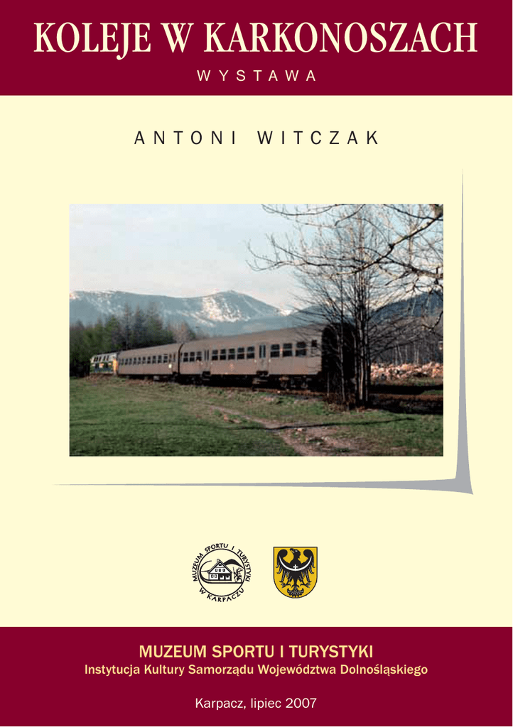 KOLEJE W KARKONOSZACH W Y S T A W A A N TO N I W I TCZA K MUZEUM SPORTU I TURYSTYKI Instytucja Kultury Samorządu Województwa Dolnośląskiego Karpacz, lipiec 2007 KOLEJE W KARKONOSZACH Pierwsze połączenie kolejowe uruchomiono w Anglii w 1825 r., a już 22 maja 1842 r. otwarto linię kolejową na Śląsku; z Wrocławia do Oławy. Był to pierwszy odcinek „Kolei Górnośląskiej”. Rok później ruszył pociąg „Kolei Wrocławsko–Świebodzkiej” w kierunku Sudetów do Świebodzic. Jej celem było dotarcie do Wałbrzycha (1853) i rozbudowa linii w rejonie Przedgórza Sudeckiego. Od roku 1844 zaczęło funkcjonować połączenie z Legnicą zbudowane przez Spółkę „Kolei Dolnośląsko – Marchijskiej” W roku 1848 stolica Dolnego Śląska posiadała już łączność z; Berlinem, Dreznem, Pragą, Wiedniem, Krakowem, Szczecinem i Warszawą. W roku 1862 zapadła decyzja o budowie pierwszorzędnej linii kolejowej, skracającej połączenie Berlina z Wiedniem; ze Zgorzelca przez Lubań, Gryfów, Jelenią Górę, Wałbrzych do Kłodzka. Budowa tego traktu kolejowego była trudna i kosztowna ze względu na jej górski przebieg i konieczność pokonania licznych przeszkód terenowych. Już w roku 1865 dotarł pierwszy pociąg ze Zgorzelca do Rybnicy, oddalonej w linii prostej od najstarszego kurortu w Sudetach – Cieplic Śląskich o 6 km. Po zbudowaniu kamiennego wieloprzęsłowego mostu nad Bobrem, u wylotu Borowego Jaru, otrzymała Jelenia Góra w dniu 20 sierpnia 1866 r. pierwsze połączenie kolejowe. Rok później ukończono trasę: Wałbrzych–Jelenia Góra (15.08.1867 r.), a w roku 1879 całą linię, która z późniejszymi liniami bocznicowymi otrzymała nazwę „Śląskiej Kolei Górskiej”. Powstanie stacji kolejowej w Jeleniej Górze umożliwiło w nieodległej przyszłości rozpoczęcie budowy linii kolejowych w Karkonosze. Kierunki i przebieg tras wyznaczył rozwijający się w Kotlinie Jeleniogórskiej przemysł oraz położenie znanych stacji klimatycznych – Karpacza i Szklarskiej Poręby. Kolej w kotlinie miała zapewnić tani transport towarów i surowców, a jednocześnie obsłużyć lokalny i dalekobieżny ruch pasażerski. Pierwszą inwestycją była budowa połączenia Jelenia Góra –Mysłakowice–Kowary (14,8 km), ukończona 15.05.1882 r. Następnie linię kolejową przedłużono do Kamiennej Góry (25,1 km), wykuwając trzeci co do długości tunel (1011 m) na Dolnym Śląsku pod Przełęczą Kowarską, prowadząc ją na wysokich nasypach serpentynami. Oddano ją do użytku w 1905 r. Służyła ona m.in. do transportu rudy żelaza bezpośrednio z kopalni, przy której usytuowano stację kolejową Kowary Górne i dolomitu z okolic Pisarzowic. W roku 1895 prywatna spółka buduje pierwszy odcinek linii drugorzędnej z Mysłakowic do Miłkowa (3,7 km) i dalej bardzo stromy odcinek do Karpacza o długości 3,1 km i pochyleniu toru 49 promili. Otwarcie połączenia z Jelenią Górą nastąpiło już 1 lipca 1895 r. Obsługiwała ona ruch towarowy z trzech papierni, a przede wszystkim umożliwiała dotarcie w Karkonosze turystom i wczasowiczom. Stacja końcowa położona była na wysokości 535 m npm. Dzięki temu Karpacz otrzymuje połączenia kolejowe poprzez Zgorzelec i Wrocław z ważniejszymi miastami Europy. Przyjeżdżają pociągi bezpośrednio z Berlina oraz pociągi sezonowe z narciarzami. W latach 70–tych XIX wieku funkcjonuje codziennie połączenie z Dreznem. W roku 1888 rozpoczęto prace przy budowie linii kolejowej do Szklarskiej Poręby, największego wówczas ośrodka wczasowego w Karkonoszach. Powstał drugi dworzec – Jelenia Góra Zachodnia z bocznicą do fabryki celulozy. W dniu 1 lipca 1891 r. dotarł pierwszy pociąg do uzdrowiska Cieplice Śląskie, a 20 grudnia tego roku do Piechowic. Zbudowano specjalnie parowozownię i wieżę ciśnień. Przez 11 lat znajdowała się tu stacja końcowa i zaplecze techniczne dla budowy typowo górskiego odcinka trasy do Szklarskiej Poręby Górnej i dalej do Jakuszyc (24 km). Budowa linii z łukami o promieniu 190 m i spadkach do 26 promili wymagała usypania wysokich nasypów i wykucia głębokich przekopów oraz poprowadzenie jej serpentynami. Przed stacją w Szklarskiej Porębie Dolnej powstał na łuku trasy tunel. Różnica wysokości pomiędzy stacjami tego odcinka wyniosła ponad 500 m. W dniu 25 czerwca 1902 r. otwarto połączenie kolejowe z Jelenią Górą, a trzy miesiące później połączenie z kolejami po czeskiej stronie Karkonoszy: stacja Tkacze–Horni Polubny nad Harrachowem. Linia posiadała liczne bocznice towarowe do zakładów przemysłowych usytuowanych na całej trasie jej przebiegu. Wykorzystywano ją do transportu drewna i kwarcu z Gór Izerskich, maszyn papierniczych produkowanych w Cieplicach i zaopatrzenia fabryk w węgiel oraz surowce. ANTONI WITCZAK ANTONI WITCZAK Na początku XX wieku zapadła decyzja budowy zapory i elektrowni wodnej w dolinie Bobru koło Pilchowic, po wielkiej powodzi w Kotlinie Jeleniogórskiej w 1897 r. Zbiegła się ona w czasie z decyzją budowy linii kolejowej Jelenia Góra – Lwówek, stanowiącej część trasy do Żagania (105 km) przez Zebrzydową i Bory Dolnośląskie. Najtrudniejszy technicznie, bo przebiegający przez pagórkowaty teren Pogórza Izerskiego był odcinek z Siedlęcina do Lwówka. W latach 1904–1906 zbudowano odcinek z Jeleniej Góry do Siedlęcina. Wykorzystywano go do transportu maszyn, materiałów i urządzeń dla rozpoczętej już inwestycji hydrotechnicznej. Nad powstającym jeziorem zaporowym wzniesiono wysoki most stalowy, lokalizując za nim przystanek Pilchowice–Zapora. Na dalszym 10 kilometrowym odcinku trasy z Siedlęcina do Wlenia wykuto 3 tunele, wniesiono kamienny wiadukt i most na Bobrze w Nielestnie. W roku 1909 oddano do użytku cały 33 kilometrowy, najbardziej malowniczy odcinek trasy do Lwówka Śląskiego, kończąc tym samym ostatnią inwestycję kolejową w Kotlinie Jeleniogórskiej. Nie