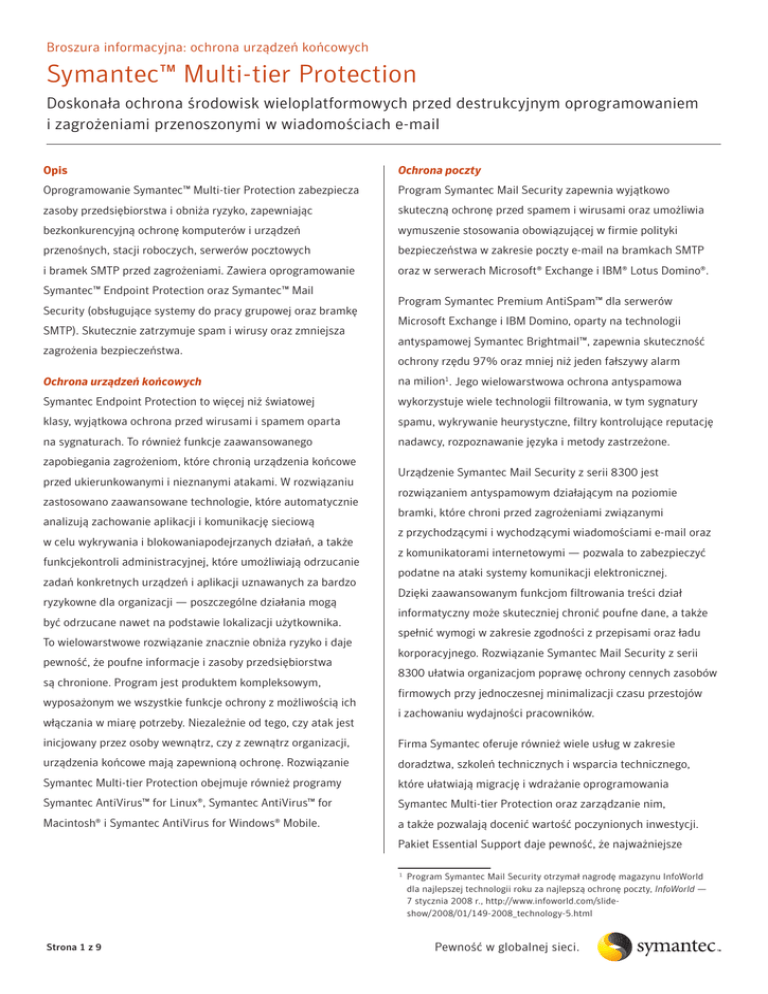 Broszura informacyjna: ochrona urządzeń końcowych Symantec™ Multi-tier Protection Doskonała ochrona środowisk wieloplatformowych przed destrukcyjnym oprogramowaniem i zagrożeniami przenoszonymi w wiadomościach e-mail Opis Ochrona poczty Oprogramowanie Symantec™ Multi-tier Protection zabezpiecza Program Symantec Mail Security zapewnia wyjątkowo zasoby przedsiębiorstwa i obniża ryzyko, zapewniając skuteczną ochronę przed spamem i wirusami oraz umożliwia bezkonkurencyjną ochronę komputerów i urządzeń wymuszenie stosowania obowiązującej w firmie polityki przenośnych, stacji roboczych, serwerów pocztowych bezpieczeństwa w zakresie poczty e-mail na bramkach SMTP i bramek SMTP przed zagrożeniami. Zawiera oprogramowanie oraz w serwerach Microsoft® Exchange i IBM® Lotus Domino®. Symantec™ Endpoint Protection oraz Symantec™ Mail Security (obsługujące systemy do pracy grupowej oraz bramkę SMTP). Skutecznie zatrzymuje spam i wirusy oraz zmniejsza zagrożenia bezpieczeństwa. Program Symantec Premium AntiSpam™ dla serwerów Microsoft Exchange i IBM Domino, oparty na technologii antyspamowej Symantec Brightmail™, zapewnia skuteczność ochrony rzędu 97% oraz mniej niż jeden fałszywy alarm Ochrona urządzeń końcowych na milion1. Jego wielowarstwowa ochrona antyspamowa Symantec Endpoint Protection to więcej niż światowej wykorzystuje wiele technologii filtrowania, w tym sygnatury klasy, wyjątkowa ochrona przed wirusami i spamem oparta spamu, wykrywanie heurystyczne, filtry kontrolujące reputację na sygnaturach. To również funkcje zaawansowanego nadawcy, rozpoznawanie języka i metody zastrzeżone. zapobiegania zagrożeniom, które chronią urządzenia końcowe przed ukierunkowanymi i nieznanymi atakami. W rozwiązaniu zastosowano zaawansowane technologie, które automatycznie analizują zachowanie aplikacji i komunikację sieciową w celu wykrywania i blokowaniapodejrzanych działań, a także funkcjekontroli administracyjnej, które umożliwiają odrzucanie zadań konkretnych urządzeń i aplikacji uznawanych za bardzo ryzykowne dla organizacji — poszczególne działania mogą być odrzucane nawet na podstawie lokalizacji użytkownika. To wielowarstwowe rozwiązanie znacznie obniża ryzyko i daje pewność, że poufne informacje i zasoby przedsiębiorstwa są chronione. Program jest produktem kompleksowym, wyposażonym we wszystkie funkcje ochrony z możliwością ich włączania w miarę potrzeby. Niezależnie od tego, czy atak jest Urządzenie Symantec Mail Security z serii 8300 jest rozwiązaniem antyspamowym działającym na poziomie bramki, które chroni przed zagrożeniami związanymi z przychodzącymi i wychodzącymi wiadomościami e-mail oraz z komunikatorami internetowymi — pozwala to zabezpieczyć podatne na ataki systemy komunikacji elektronicznej. Dzięki zaawansowanym funkcjom filtrowania treści dział informatyczny może skuteczniej chronić poufne dane, a także spełnić wymogi w zakresie zgodności z przepisami oraz ładu korporacyjnego. Rozwiązanie Symantec Mail Security z serii 8300 ułatwia organizacjom poprawę ochrony cennych zasobów firmowych przy jednoczesnej minimalizacji czasu przestojów i zachowaniu wydajności pracowników. inicjowany przez osoby wewnątrz, czy z zewnątrz organizacji, Firma Symantec oferuje również wiele usług w zakresie urządzenia końcowe mają zapewnioną ochronę. Rozwiązanie doradztwa, szkoleń technicznych i wsparcia technicznego, Symantec Multi-tier Protection obejmuje również programy które ułatwiają migrację i wdrażanie oprogramowania Symantec AntiVirus™ for Linux®, Symantec AntiVirus™ for Symantec Multi-tier Protection oraz zarządzanie nim, Macintosh® i Symantec AntiVirus for Windows® Mobile. a także pozwalają docenić wartość poczynionych inwestycji. Pakiet Essential Support daje pewność, że najważniejsze 1 Strona 1 z 9 Program Symantec Mail Security otrzymał nagrodę magazynu InfoWorld dla najlepszej technologii roku za najlepszą ochronę poczty, InfoWorld — 7 stycznia 2008 r., http://www.infoworld.com/slideshow/2008/01/149-2008_technology-5.html Pewność w globalnej sieci. Broszura informacyjna: ochrona urządzeń końcowych Symantec™ Multi-tier Protection zasoby przedsiębiorstwa są chronione przez całą dobę. Kompleksowa ochrona — rozwiązanie Symantec Organizacjom, które powierzają zadania monitorowania Multi-tier Protection łączy w sobie najlepsze technologie i zarządzania związane z bezpieczeństwem zewnętrznym w celu powstrzymania zagrożeń bezpieczeństwa (nawet firmom, firma Symantec oferuje również usługi Managed tych pochodzących od najbardziej podstępnych nowych Security Services zapewniające ochronę w czasie rzeczywistym. i nieznanych włamywaczy), tak aby nie dostały się do Uwaga: Rozwiązanie Symantec Mail Security z serii 8300 występuje w postaci urządzenia fizycznego lub wirtualnego o tych samych funkcjach. Pakiet Symantec Multi-tier Protection zawiera licencje na urządzenia wirtualne i fizyczne. Sprzęt jest sprzedawany osobno. sieci. Oprogramowanie wykrywa i blokuje destrukcyjne oprogramowanie w czasie rzeczywistym, w tym wirusy, robaki, konie trojańskie, programy typu „spyware”, „adware” i „rootkit” oraz boty. Główne zalety Bezpieczeństwo Najlepsze w branży gromadzenie i analizowanie informacji na temat rodzajów zagrożeń — dzięki globalnej sieci wywiadowczej firmy Symantec™ mechanizmy ochrony tej firmy umożliwiają niezrównany przegląd wszystkich rodzajów Ochrona przed zagrożeniami — technologia prewencyjnego skanowania zagrożeń TruScan™ wyjątkowo dokładnie analizuje zarówno prawidłowe, jak i nieprawidłowe zachowania nieznanych aplikacji. Zwiększa to skuteczność wykrywania zagrożeń i zmniejsza liczbę fałszywych alarmów bez potrzeby tworzenia konfiguracji opartych na regułach. zagrożeń pochodzących z Internetu. Wynikami analizy są aktywna ochrona przed