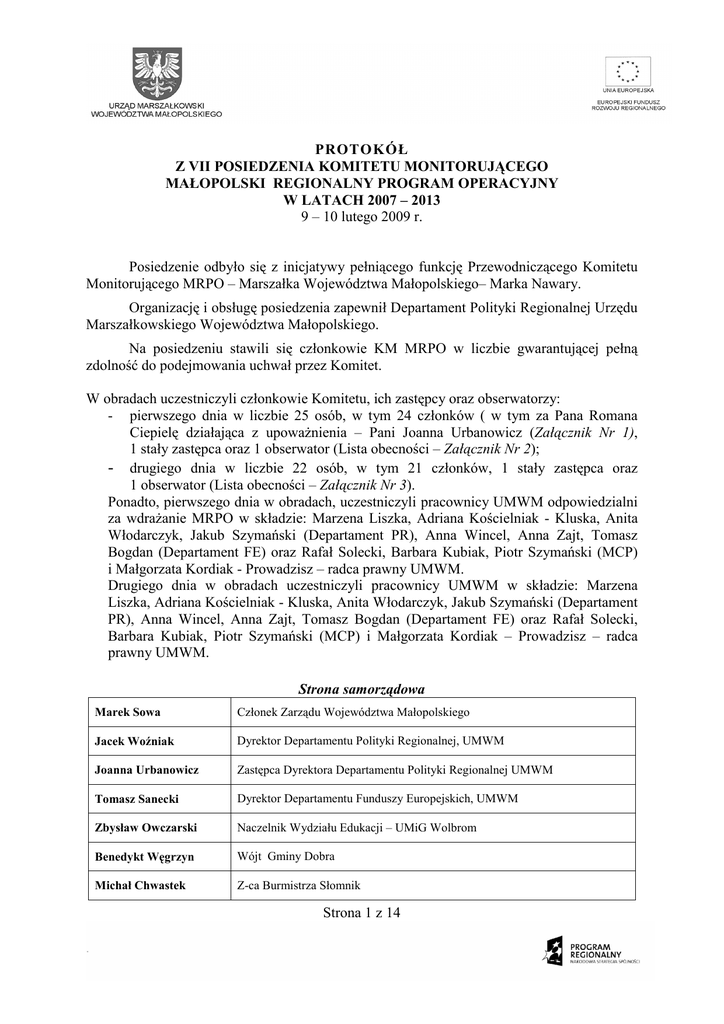 PROTOKÓŁ Z VII POSIEDZENIA KOMITETU MONITORUJĄCEGO MAŁOPOLSKI REGIONALNY PROGRAM OPERACYJNY W LATACH 2007 – 2013 9 – 10 lutego 2009 r. Posiedzenie odbyło się z inicjatywy pełniącego funkcję Przewodniczącego Komitetu Monitorującego MRPO – Marszałka Województwa Małopolskiego– Marka Nawary. Organizację i obsługę posiedzenia zapewnił Departament Polityki Regionalnej Urzędu Marszałkowskiego Województwa Małopolskiego. Na posiedzeniu stawili się członkowie KM MRPO w liczbie gwarantującej pełną zdolność do podejmowania uchwał przez Komitet. W obradach uczestniczyli członkowie Komitetu, ich zastępcy oraz obserwatorzy: - pierwszego dnia w liczbie 25 osób, w tym 24 członków ( w tym za Pana Romana Ciepielę działająca z upowaŜnienia – Pani Joanna Urbanowicz (Załącznik Nr 1), 1 stały zastępca oraz 1 obserwator (Lista obecności – Załącznik Nr 2); - drugiego dnia w liczbie 22 osób, w tym 21 członków, 1 stały zastępca oraz 1 obserwator (Lista obecności – Załącznik Nr 3). Ponadto, pierwszego dnia w obradach, uczestniczyli pracownicy UMWM odpowiedzialni za wdraŜanie MRPO w składzie: Marzena Liszka, Adriana Kościelniak - Kluska, Anita Włodarczyk, Jakub Szymański (Departament PR), Anna Wincel, Anna Zajt, Tomasz Bogdan (Departament FE) oraz Rafał Solecki, Barbara Kubiak, Piotr Szymański (MCP) i Małgorzata Kordiak - Prowadzisz – radca prawny UMWM. Drugiego dnia w obradach uczestniczyli pracownicy UMWM w składzie: Marzena Liszka, Adriana Kościelniak - Kluska, Anita Włodarczyk, Jakub Szymański (Departament PR), Anna Wincel, Anna Zajt, Tomasz Bogdan (Departament FE) oraz Rafał Solecki, Barbara Kubiak, Piotr Szymański (MCP) i Małgorzata Kordiak – Prowadzisz – radca prawny UMWM. Strona samorządowa Marek Sowa Członek Zarządu Województwa Małopolskiego Jacek Woźniak Dyrektor Departamentu Polityki Regionalnej, UMWM Joanna Urbanowicz Zastępca Dyrektora Departamentu Polityki Regionalnej UMWM Tomasz Sanecki Dyrektor Departamentu Funduszy Europejskich, UMWM Zbysław Owczarski Naczelnik Wydziału Edukacji – UMiG Wolbrom Benedykt Węgrzyn Wójt Gminy Dobra Michał Chwastek Z-ca Burmistrza Słomnik Strona 1 z 14 Ewa Przybyło Burmistrz Miasta Rabka – Zdrój Grzegorz Ostrzołek Pełnomocnik Prezydenta Miasta Krakowa ds. Funduszy Europejskich Ryszard Nowak Prezydent Miasta Nowy Sącz Jan Golonka Starosta Nowosądecki Wiesław Krajewski Starosta Dąbrowski Strona rządowa Agnieszka Boniewicz Departament Rozwoju Gospodarki, Ministerstwo Gospodarki Iwona Stąsiek Dyrektor Wydziału IPC, Małopolski Urząd Wojewódzki Partnerzy społeczni i gospodarczy Wojciech Grzeszek Przewodniczący NSZZ „Solidarność” Zarządu Regionu Małopolska Piotr Tengowski Izba Rzemieślnicza w Nowym Sączu Jerzy Wrzecionek Małopolski Związek Pracodawców Zdzisław Mąka Zastępca Prezesa Małopolskiej Izby Rzemiosła i Przedsiębiorczości w Krakowie Paweł Kukla Prezes Sądeckiej Izby Gospodarczej prof. dr hab. Piotr Tworzewski prof. zw. dr hab. inŜ. Jerzy Lis Prorektor ds. Rozwoju UJ Prorektor ds. Współpracy i Rozwoju, AGH dr hab. Jacek Leśkow Prorektor ds. Naukowych, WyŜsza Szkoła Biznesu - National-Louis University w Nowym Sączu Piotr Rymarowicz Fundacja Wspierania Inicjatyw Ekologicznych Bolesław Łączyński Małopolska Izba Rolnicza Obserwatorzy Anita Klecha Komisja Europejska Małgorzata Kordiak Radca prawny UMWM Strona 2 z 14 I. Powitanie uczestników VII posiedzenia KM MRPO. Na wstępie Członek Zarządu Województwa Małopolskiego Marek Sowa w imieniu Przewodniczącego Komitetu Monitorującego – Marszałka Województwa Małopolskiego Marka Nawary przywitał wszystkich zebranych na VII posiedzeniu Komitetu ( UpowaŜnienie Załącznik Nr 4). II. Przyjęcie porządku obrad przez KM MRPO. Przedstawiony przez Pana M. Sowę porządek w pierwszym dniu posiedzenia (Załącznik Nr 5) przedstawiał się następująco: 9 lutego 2009 – poniedziałek 11.00 – 11.30 Powitanie uczestników KM MRPO Otwarcie VII posiedzenia KM MRPO Przyjęcie porządku obrad KM MRPO 11.30 – 12.00 Prezentacja wniosków z raportu ewaluacyjnego „Ocena kryteriów wyboru projektów oraz mechanizmu wstępnej kwalifikacji projektów w ramach MRPO na lata 2007 – 2013” Informacja w sprawie Okresowego planu ewaluacji MRPO na rok 2009 12.00 – 13.30 Prezentacja kryteriów wyboru do Działań 4.3A i 4.3B Dyskusja Przyjęcie wniosków w sprawie zmiany kryteriów Głosowanie 13.30 – 14.30 Obiad 14.30 – 16.30 Prezentacja kryteriów wyboru do Działań 6.2B Dyskusja Przyjęcie wniosków w sprawie zmiany kryteriów Głosowanie Prezentacja kryteriów wyboru do Działań 7.2 i 7.3 Dyskusja Przyjęcie wniosków w sprawie zmiany kryteriów Głosowanie 16.30 – 17.00 Przerwa kawowa 17.00 – 18.30 Prezentacja kryteriów wyboru do Działań 2.1A i 4.1A Dyskusja Przyjęcie wniosków w sprawie zmiany kryteriów Głosowanie 19.00 Kolacja Strona 3 z 14 Pan M. Sowa zaprezentował harmonogram VII posiedzenia KM MRPO zwracając się jednocześnie do członków Komitetu o wprowadzenie do programu zmiany polegającej na przeniesieniu na dzień 10 lutego 2009 roku - prezentacji kryterium wyboru dla Działania 4.1A, która była planowana na pierwszy dzień obrad. Z uwagi na brak wniosków w/w przedmiocie porządek obrad z zaproponowanymi zmianami został przyjęty przez aklamację. Po przyjęciu programu Pan Marek Sowa zaproponował członkom Komitetu przedstawienie stanu wdraŜania i po akceptacji dokonał prezentacji nt. Małopolski Regionalny Program Operacyjny na lata 2007 – 2013- aktualny stan wdraŜania (prezentacja Załącznik Nr 6). Następnie Pan Jacek Woźniak, na prośbę prowadzącego obrady, dokonał prezentacji badania ewaluacyjnego nt. Ocena kryteriów wyboru projektów oraz mechanizm wstępnej kwalifikacji projektów w ramach Małopolskiego Regionalnego Programu Operacyjnego na lata 2007 – 2013 (prezentacja Załącznik Nr 7). Pan Marek Sowa podziękował za 