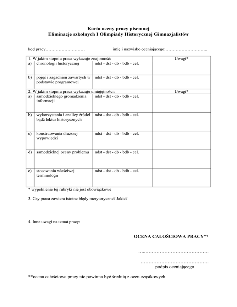 Karta oceny pracy pisemnej Eliminacje szkolnych I Olimpiady Historycznej Gimnazjalistów kod pracy……………………… imię i nazwisko oceniającego:……………………….. 1. W jakim stopniu praca wykazuje znajomość: a) chronologii historycznej ndst - dst - db - bdb - cel. b) Uwagi* pojęć i zagadnień zawartych w ndst - dst - db - bdb - cel. podstawie programowej 2. W jakim stopniu praca wykazuje umiejętności: a) samodzielnego gromadzenia ndst - dst - db - bdb - cel. informacji b) wykorzystania i analizy źródeł bądź lektur historycznych ndst - dst - db - bdb - cel. c) konstruowania dłuższej wypowiedzi ndst - dst - db - bdb - cel. d) samodzielnej oceny problemu ndst - dst - db - bdb - cel. e) stosowania właściwej terminologii ndst - dst - db - bdb - cel. Uwagi* * wypełnienie tej rubryki nie jest obowiązkowe 3. Czy praca zawiera istotne błędy merytoryczne? Jakie? 4. Inne uwagi na temat pracy: OCENA CAŁOŚCIOWA PRACY** …..…………………………………. ……………………………………. podpis oceniającego **ocena całościowa pracy nie powinna być średnią z ocen cząstkowych