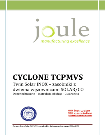 January 1, 2015 [Twin Solar INOX – zasobniki z dwiema wężownicami SOLAR/CO] CYCLONE TCPMVS Twin Solar INOX – zasobniki z dwiema wężownicami SOLAR/CO Dane techniczne – instrukcja obsługi - Gwarancja Cyclone Twin Solar TCPMVS – zasobniki z dwiema wężownicami SOLAR/CO Cyclone TCPMVS [TWIN SOLAR INOX – ZASOBNIKI Z DWIEMA WĘŻOWNICAMI SOLAR/CO] GWARANCJA : 1. Firma Joule Sp z o.o. udziela gwarancji prawidłowego działania urządzeń na okres: a) 10 lat gwarancji na pojemnościowy podgrzewacz wody TCPMVS b) 2 lata gwarancji na elementy wyposażenia zbiornika tj. Grzałka oraz zawór bezpieczeństwa montowane fabrycznie, Występuje dwuletnia gwarancja na element grzewczy (grzałkę) . Gwarancją nie objęte są zniszczenia elementu grzejnego poprzez związki chemiczne zawarte w wodzie, prądy błądzące oraz twardość wody oraz korozji elektrolitycznej tzn. rozszycie rurki.. Gwarancją objęte są tylko wady oraz usterki powstałe z winy producenta. 2. W okresie gwarancyjnym użytkownikowi przysługuje prawo do bezpłatnych napraw uszkodzeń powstałych z winy producenta. 3. Firma Joule Sp z o.o. zwolniona jest z odpowiedzialności z tytułu gwarancji na wadliwe działanie urządzenia powstałe w wyniku użytkowania niezgodnego z Instrukcją Obsługi, za wykonanie napraw i przeróbek przez osoby nie upoważnione oraz za inne uszkodzenia powstałe nie z winy producenta. Gwarancji nie podlegają usterki spowodowane czynnikami zewnętrznymi od producenta niezależnymi, takimi jak stopień mineralizacji (twardość) wody. Najwyższe dopuszczalne objętę gwarancją na zbiornik stężenie związków chemicznych/mineralnych (mg/l) w wodzie zasilającej zasobnik to : 1. 2. 3. 4. 5. 6. 7. całkowita ilość wszelkich rozpuszczonych w wodzie substancji – 600mg/l chlorki – 250 mg/l magnez – 10 mg/l PH wody w przedziale – 6,5 – 9,5 sód – 150 mg/l całkowita twardość wody – CaCO3 – max 250 mg/l siarczany – 200 mg/l GWARANCJA TA NIE OBEJMUJE: - żadnych wtórnych strat wynikających z uszkodzenia lub awarii zasobnika, - jeśli stwierdzi się nieszczelność na powierzchni blachy oraz na spawach spowodowane agresywnymi związkami chemicznymi, - efektu przyrostu kamienia, - zniszczeń oraz uszkodzeń zbiornika wywołanych związkami chemicznymi zawartymi w wodzie oraz twardością wody. - uszkodzeń wynikających z użytkowania niezgodnego z ogólnie przyjętymi zasadami tego typu urządzeń, niezgodnego z przeznaczeniem i zaleceniami Producenta zawartymi w Instrukcji Obsługi - uszkodzeń powstałych z winy Użytkownika - produktów, w których stwierdzono ingerencję osób nieupoważnionych, polegającą na przeróbkach, samodzielnych naprawach, zmianach konstrukcyjnych, - uszkodzeń powstałych na skutek braku zasilania energii elektrycznej - uszkodzeń powstałych na skutek przepięć, burz, powodzi, pożarów i podobnych zdarzeń losowych - uszkodzeń powstałych wskutek niewłaściwej instalacji i montażu - elementów eksploatacyjnych lub zużytych w sposób naturalny Gwarancją nie są objęte: - wycieki z zaworu bezpieczeństwa z powodu: a) Wysokiego ciśnienia w sieci wodociągowej (powyżej 6 bara) b) Zainstalowania zasobnika bez naczynia przeponowego, c) Zainstalowania reduktora ciśnienia wody bez równoczesnego zainstalowania naczynia wzbiorczego przeponowego. d) Użytkowania naczynia przeponowego bez sprężonego powietrza. 2|s tr o na Cyclone TCPMVS [TWIN SOLAR INOX – ZASOBNIKI Z DWIEMA WĘŻOWNICAMI SOLAR/CO] - uszkodzenia wynikłe z niewłaściwego transportu lub przechowywania. - uszkodzenia przez mróz. - uszkodzenia w wyniku działania siły wyższej lub zdarzeń losowych. 4. Wady ujawnione w okresie gwarancji będą usuwane w terminie 14 dni od daty zgłoszenia usterki, a gwarancja ulega przedłużeniu o okres od dnia zgłoszenia usterki do dnia wykonania naprawy. W przypadku stwierdzenia przez przedstawiciela producenta braku możliwości naprawy zgłoszonej wady wyrobu u klienta, wymiennik jest naprawiany w siedzibie producenta, a na czas naprawy klient może otrzymać urz adzenie zastępcze. 5. Zgłoszenia reklamacyjne należy kierować do firmy, która sprzedała zbiornik. 6. Nabywcy przysługuje prawo wymiany urządzenia na nowe lub zwrot kosztów w przypadku stwierdzenia wady fabrycznej niemożliwej do usunięcia. 7. Uprawnienia z tytułu gwarancji mogą być realizowane jedynie po przedstawieniu ważnej Karty Gwarancyjnej. Firma instalacyjna montująca urządzenie wpisuję na karcie gwarancyjnej datę montażu. Początkiem okresu gwarancyjnego jest data montażu, a w przypadku jej braku data sprzedaży, z zastrzeżeniem okresów podanych w punkt 1 Karta Gwarancyjna niewypełniona, wypełniona tylko częściowo lub nosząca ślady poprawek jest nieważna. 8. W przypadku bezpodstawnego wezwania serwisu do naprawy gwarancyjnej powstałe koszty ponosi użytkownik. 9. Do podstawowych zabiegów konserwacyjnych należy: utrzymanie wymiennika w czystości, sprawdzanie co miesiąc prawidłowego działania zaworu bezpieczeństwa, wg zaleceń wytwórcy zaworu, 10. Producent nie bierze odpowiedzialności za szkody wyrządzone osobom lub rzeczom, które mogłyby powstać przez niewłaściwe zastosowanie i eksploatację urządzenia, jego błędny montaż lub niezastosowanie się do zaleceń producenta. 11. Szczegółowe uprawnienia nabywcy i gwaranta określają przepisy Kodeksu Cywilnego. Materiał użyty do produkcji zasobników Joule – stal nierdzewna Duplex Materiał użyty do produkcji króćców oraz wężownic – stal nierdzewna 316L Pamiętaj gwarancja nie będzie uznana bez przeprowadzonego przeglądu po pierwszym roku użytkowania wymiennika. Przegląd należy wykonać najpóźniej 15 dni po pierwszym roku użytkowania. Przegląd przeprowadzany jest na koszt właściciela zasobnika. Przegląd wykonuje autoryzowany serwis Joule. Do czynności związanych z przeglądem należy sprawdzenie zasobnika pod względem szczelności zbiornika (brak
