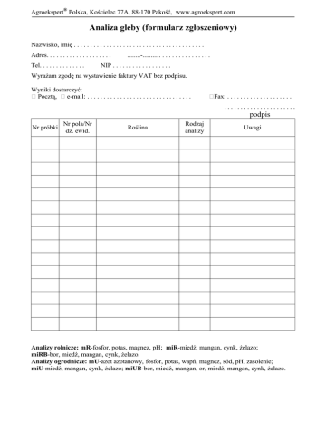 ® Agroekspert Polska, Kościelec 77A, 88-170 Pakość, www.agroekspert.com Analiza gleby (formularz zgłoszeniowy) Nazwisko, imię . . . . . . . . . . . . . . . . . . . . . . . . . . . . . . . . . . . . . . . . Adres. . . . . . . . . . . . . . . . . . . . Tel. . . . . . . . . . . . . . ........-........... . . . . . . . . . . . . . . . NIP . . . . . . . . . . . . . . . . . . Wyrażam zgodę na wystawienie faktury VAT bez podpisu. Wyniki dostarczyć: Pocztą, e-mail: . . . . . . . . . . . . . . . . . . . . . . . . . . . . . . . . Fax: . . . . . . . . . . . . . . . . . . . . ...................... podpis Nr próbki Nr pola/Nr dz. ewid. Roślina Rodzaj analizy Uwagi Analizy rolnicze: mR-fosfor, potas, magnez, pH; miR-miedź, mangan, cynk, żelazo; miRB-bor, miedź, mangan, cynk, żelazo. Analizy ogrodnicze: mU-azot azotanowy, fosfor, potas, wapń, magnez, sód, pH, zasolenie; miU-miedź, mangan, cynk, żelazo; miUB-bor, miedź, mangan, or, miedź, mangan, cynk, żelazo.