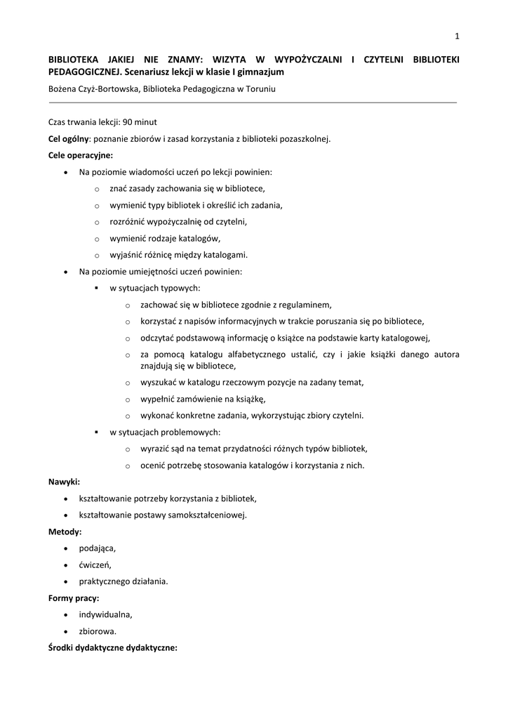 1 BIBLIOTEKA JAKIEJ NIE ZNAMY: WIZYTA W WYPOŻYCZALNI I CZYTELNI BIBLIOTEKI PEDAGOGICZNEJ. Scenariusz lekcji w klasie I gimnazjum Bożena Czyż-Bortowska, Biblioteka Pedagogiczna w Toruniu Czas trwania lekcji: 90 minut Cel ogólny: poznanie zbiorów i zasad korzystania z biblioteki pozaszkolnej. Cele operacyjne: • • Na poziomie wiadomości uczeń po lekcji powinien: o znać zasady zachowania się w bibliotece, o wymienić typy bibliotek i określić ich zadania, o rozróżnić wypożyczalnię od czytelni, o wymienić rodzaje katalogów, o wyjaśnić różnicę między katalogami. Na poziomie umiejętności uczeń powinien: w sytuacjach typowych: o zachować się w bibliotece zgodnie z regulaminem, o korzystać z napisów informacyjnych w trakcie poruszania się po bibliotece, o odczytać podstawową informację o książce na podstawie karty katalogowej, o za pomocą katalogu alfabetycznego ustalić, czy i jakie książki danego autora znajdują się w bibliotece, o wyszukać w katalogu rzeczowym pozycje na zadany temat, o wypełnić zamówienie na książkę, o wykonać konkretne zadania, wykorzystując zbiory czytelni. w sytuacjach problemowych: o wyrazić sąd na temat przydatności różnych typów bibliotek, o ocenić potrzebę stosowania katalogów i korzystania z nich. Nawyki: • kształtowanie potrzeby korzystania z bibliotek, • kształtowanie postawy samokształceniowej. Metody: • podająca, • ćwiczeń, • praktycznego działania. Formy pracy: • indywidualna, • zbiorowa. Środki dydaktyczne dydaktyczne: 2 regulamin biblioteki, regulamin czytelni, informacja wizualna, druki biblioteczne (karta biblioteczna, deklaracja, kieszonka czytelnika), tablica informacyjna do katalogu rzeczowego, plansza ze schematem UKD, wzory kart katalogowych, rejestr osób korzystających z czytelni, katalogi, słowniki, leksykony, encyklopedie, książki. Przebieg lekcji: Zaproszenie uczniów do wypożyczalni. Stworzenie atmosfery sprzyjającej wzajemnej akceptacji i pracy. Oswojenie z nieznanym wnętrzem. 1. Część wstępna (uczniowie odpowiadają na pytania) • Znaczenie słowa biblioteka - zbiór książek, gmach, instytucja, seria wydawnicza, mebel, • Czym zajmuje się biblioteka ? • o gromadzi i uzupełnia zbiory zgodnie z funkcją biblioteki, o magazynuje zbiory, rozmieszcza i konserwuje, o opracowuje zbiory, o udziela porad informacyjno-bibliograficznych. Rodzaje bibliotek (uczniowie informują z jakich bibliotek korzystali do tej pory, nauczyciel porządkuje ich wypowiedzi i wymienia typy bibliotek oraz przykłady takich bibliotek w miejscu zamieszkania). o biblioteki powszechne (publiczne) dla dorosłych i dzieci, o biblioteki szkolne i pedagogiczne, o biblioteki naukowe (uczelniane, towarzystw naukowych), o fachowe i kościelne. 2. Część główna Na lekcji uczniowie dowiedzą się, jakie zbiory gromadzi biblioteka pedagogiczna, kto może z niej korzystać, na jakich zasadach i w jaki sposób wypożyczyć książkę. REGULAMIN Uczniowie: zapoznają się z regulaminem i po jego przeczytaniu odpowiadają na następujące pytania: • kto może zapisać się do biblioteki ? - (nauczyciele, pracownicy naukowi, studenci, uczniowie klas maturalnych), • co jest warunkiem zapisu ? - (okazanie dowodu osobistego lub legitymacji, wypełnienie deklaracji [okazanie druku deklaracji i omówienie sposobu wypełnienia]), • ile książek można wypożyczyć i na jak długi okres ? • co określa regulamin ? - (prawa i obowiązki czytelników). Nauczyciel zwraca uwagę uczniów na fakt, że każda biblioteka posiada własny regulamin i zawsze należy zapoznać się z nim przy zapisie do nowej biblioteki. Nauczyciel zwraca uwagę uczniów na kary regulaminowe. Uczniowie porównują warunki regulaminu biblioteki pedagogicznej z zasadami wypożyczeń w bibliotece szkolnej i osiedlowej. WYPOWYCZANIE KSI WEK Uczniowie odpowiadają na pytanie, w jaki sposób wypożyczają książki w swoich bibliotekach. Odbywa się to zazwyczaj poprzez poproszenie o książkę bibliotekarza lub poprzez wybór książki na półce. Biblioteka pedagogiczna posiada liczne zbiory i nie ma wolnego dostępu do półek. Nauczyciel kieruje uwagę uczniów na zamówienia [rewersy] i katalogi. ZAMAWIANIE KSI WEK [REWERS] 3 Uczniowie: wskazują wzory wypełniania rewersów, zwracają uwagę na informacje dotyczące dokładnego i czytelnego wypełniania tych druków oraz wymieniają szczegóły, które muszą się znaleźć na zamówieniu (numer karty bibliotecznej czytelnika lub jego nazwisko, sygnatura książki, autor, tytuł książki, podpis czytelnika i data).Odpowiadają na pytanie: Co to jest sygnatura ? - (znak miejsca książki na półce) i - Gdzie można odnaleźć sygnaturę książki ? - (karta katalogowa). KATALOGI Nauczyciel: wskazuje wyposażenie wypożyczalni. Uczniowie, korzystając z napisów informacyjnych, wymieniają znajdujące się w niej katalogi (alfabetyczny, rzeczowy, czasopism i wydawnictw ciągłych). Nauczyciel: - Kiedy korzystamy z katalogu alfabetycznego ? - (Jeśli znany jest autor i tytuł książki). Jako ćwiczenie uczniowie otrzymują zadanie wyszukania w katalogu alfabetycznym następujących nazwisk: Czajkowska, Ćwiklińska, Dickens, Gombrowicz, Szekspir, Shakespeare. Przykłady te ilustrują trudności, które mogą się pojawić przy przeszukiwaniu tego katalogu (znajomość kolejności liter w alfabecie polskim, znajomość prawidłowej pisowni nazwisk polskich i obcych, ilość kart katalogowych z tym samym nazwiskiem, układ odsyłaczy i kart głównych). Uczniowie oglądają wzory kart głównych z jednym, dwoma i trzema nazwiskami autorów oraz wzory kart odsyłaczowych. Nauczyciel: - Kiedy korzystamy z katalogu rzeczowego ? - (Przy poszukiwaniu literatury na określony temat). Nauczyciel wyjaśnia, jaki katalog został zastosowany zarówno w bibliotece pedagogicznej, jak i w bibliotece szkolnej. Plansza ze schematem UKD i tablica informacyjna do katalogu ułatwia 