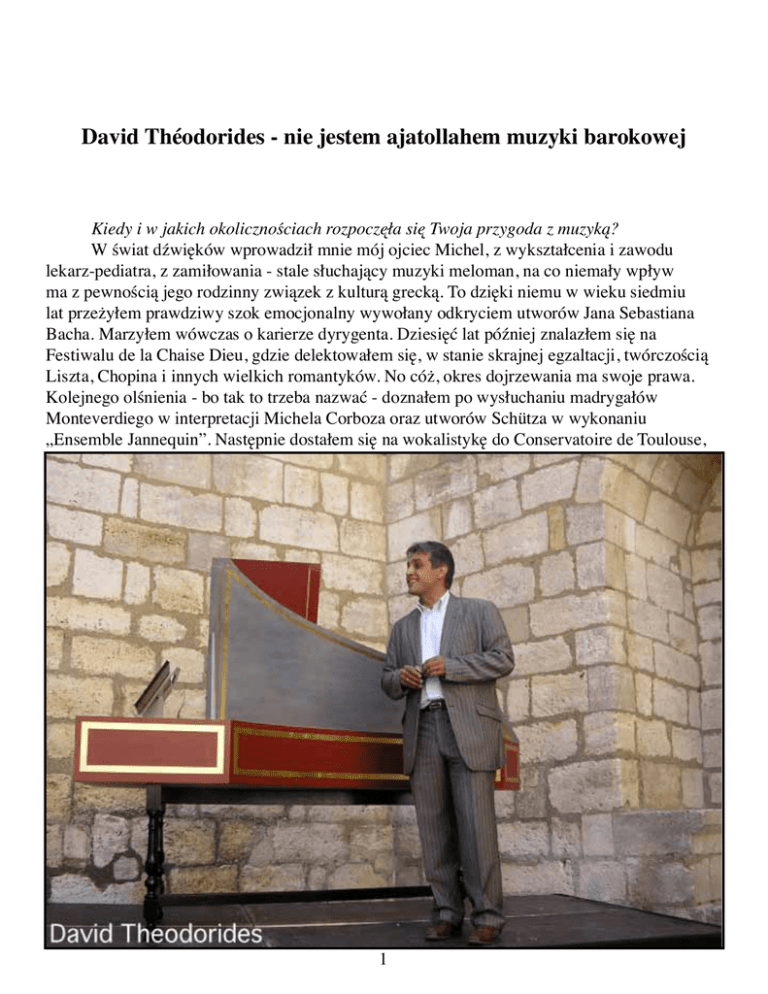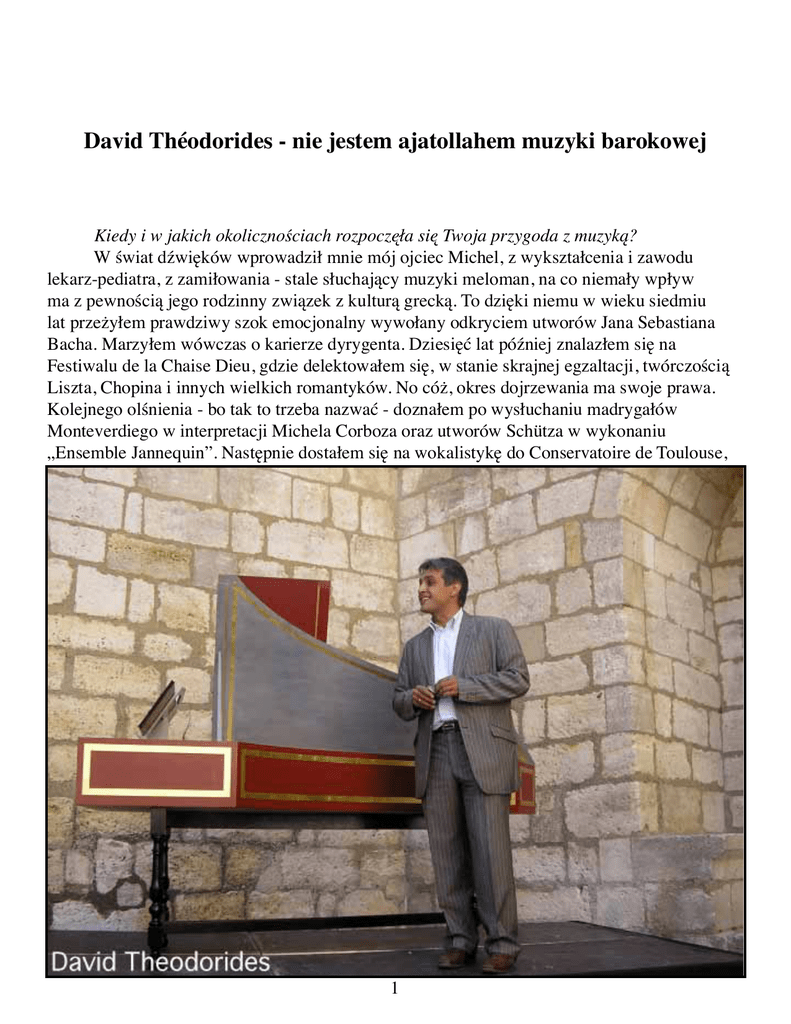 David Théodorides - nie jestem ajatollahem muzyki barokowej Kiedy i w jakich okolicznościach rozpoczęła się Twoja przygoda z muzyką? W świat dźwięków wprowadził mnie mój ojciec Michel, z wykształcenia i zawodu lekarz-pediatra, z zamiłowania - stale słuchający muzyki meloman, na co niemały wpływ ma z pewnością jego rodzinny związek z kulturą grecką. To dzięki niemu w wieku siedmiu lat przeżyłem prawdziwy szok emocjonalny wywołany odkryciem utworów Jana Sebastiana Bacha. Marzyłem wówczas o karierze dyrygenta. Dziesięć lat później znalazłem się na Festiwalu de la Chaise Dieu, gdzie delektowałem się, w stanie skrajnej egzaltacji, twórczością Liszta, Chopina i innych wielkich romantyków. No cóż, okres dojrzewania ma swoje prawa. Kolejnego olśnienia - bo tak to trzeba nazwać - doznałem po wysłuchaniu madrygałów Monteverdiego w interpretacji Michela Corboza oraz utworów Schütza w wykonaniu „Ensemble Jannequin”. Następnie dostałem się na wokalistykę do Conservatoire de Toulouse, 1 a jednocześnie studiowałem prawo szykując się do praktyki adwokackiej. Decydującym momentem okazało się spotkanie z José van Damem, który namówił mnie na wyłączne poświęcenie się muzyce i przez długi okres otaczał serdeczną i fachową opieką. Później przeniosłem się do Conservatoire de Paris, gdzie w Departamencie Muzyki Dawnej miałem okazję czerpać z doświadczenia takich mistrzów jak Jean Tubéry, Keneth Weiss czy Edward Cook. Przez wiele lat prowadziłem działalność koncertową śpiewając między innymi pod batutą Williama Christie. A jak doszło do powstania Festiwalu „Sinfonia en Périgord”? Mój ojciec organizował początkowo w Périgueux rozmaite koncerty, ale były to wydarzenia jednorazowe, nie podporządkowane żadnej przewodniej myśli artystycznej. W pewnym momencie wpadliśmy wspólnie na pomysł powołania do życia festiwalu z prawdziwego zdarzenia, osadzonego w ramach czasowych obejmujących trzy kolejne weekendy, przy czym każdy z nich był poświęcony muzyce innego okresu: barokowej, klasycznej, romantycznej. W wieku dwudziestu lat zapragnąłem jednak zrealizować z ojcem bardziej ambitny i eksplorujący wyłącznie muzykę barokową projekt. W ten sposób w 1991 roku powołaliśmy do życia „Sinfonia en Périgord”, manifestację stanowiącą dla mnie wielką życiową przygodę, której punktem wyjścia jest połączenie moich muzycznych pasji z synowską miłością. W pewnym sensie ten Festiwal jest naszym dzieckiem... Domyślam się, że nie chodziło Ci o stworzenie jednego festiwalu więcej - we Francji jest ich już ponad 1200 - lecz o wcielenie w życie Twoich artystycznych pragnień, przemyśleń i koncepcji. Na jakim zatem fundamencie zbudowana jest ta kierowana już od pięciu lat wyłącznie przez Ciebie manifestacja? Na przekonaniu o tym, że muzyka barokowa jest za sprawą swego klimatu, formy, języka dźwiękowego, a także poprzez permanentne dążenie do szukania nowych środków wyrazu i łamania wszelkich kodów muzyką wolności, niezwykle bliską percepcji i mentalności współczesnego słuchacza. Chcę pokazać jej kreatywność i żywiołowość proponując publiczności przeżycie wstrząsów emocjonalnych i nowych doświadczeń, czasem nawet za cenę brutalnego burzenia skostniałych nawyków przeciętnego odbiorcy, pod warunkiem, że okaże mi on minimum zaufania i zechce się otworzyć na nowe doznania. Prowadzę zresztą ze słuchaczami ciągły dialog, wsłuchuję się w to, co mają do powiedzenia i proponuję na tyle zróżnicowane programy, że każdy może w nich znaleźć coś dla siebie. Działam pod wpływem świata, który mnie otacza, ale także ulegam mojej intuicji. Nie chcę być ajatollahem muzyki barokowej i uważam, że zarówno odbiorcy, jak i muzycy mają prawo do bycia sobą, do zachowania swojej osobowości. Przecież w życiu i na scenie muzyk pozostaje wciąż tą samą osobą. Chcę przez to powiedzieć, iż moim podstawowym obowiązkiem jest prezentowanie muzyki żywej, albowiem festiwal nie jest chłodnią konserwującą gotowe produkty, a muzyka nie może się nikomu kojarzyć z nieruchomym pomnikiem, który oglądamy unosząc lekko chroniący go pokrowiec. Wszakże mamy tu do czynienia ze stale odnawiającym się językiem. 2 3 Wydaje się, że w przeciwieństwie do szefów innych festiwali muzyki barokowej nie jesteś otoczony specjalizującymi się w tym zakresie muzykologami. Rzeczywiście tak jest. Pewnie dlatego, że z racji młodego wieku nie należę do pokolenia muzyków, którzy w latach 60. i 70. ulegali towarzyszącej powszechnemu zainteresowaniu się muzyką barokową presji badań muzykologicznych. Nie podważam ich zasadności, ale też nie czuję się ich więźniem, bardziej mnie pasjonuje żywy kontakt z wykonawcami, wszak muzykowanie to nie praca uniwersytecka. Wystarczająco dużo cierpiałem podczas studiów na uczelniach muzycznych, w których na ogół obowiązywał jeden, słuszny i niepodważalny wzór interpretacyjny danego utworu. Walczę z elitaryzmem, jestem za stawianiem wysokich wymagań artystycznych, natomiast przeciwko jakiemukolwiek ograniczaniu czy zamykaniu w schematach. Próbuję zdjąć muzykę z nieosiągalnego dla wielu osób piedestału, uczynić z niej sztukę popularną, codzienną, dostępną - jednym słowem wytworzyć pomiędzy muzyką i publicznością relację intymnej bliskości i zażyłości. Temu między innymi służy przenoszenie koncertów do nietypowych, może dla niektórych zaskakujących miejsc, jak na przykład wypełnione resztkami rzymskich ruin muzeum Vesunna. A dlaczego to jest dla Ciebie takie ważne? Dlatego, że muzyka jest według mnie najpełniejszą i najbardziej metafizyczną formą sztuki zdolną do podejmowania prób udzielania odpowiedzi na podstawowe pytania, jakie człowiek może sobie zadawać, dotyczące jego pochodzenia, sensu życia, etyki, przyszłości. Chyba ws