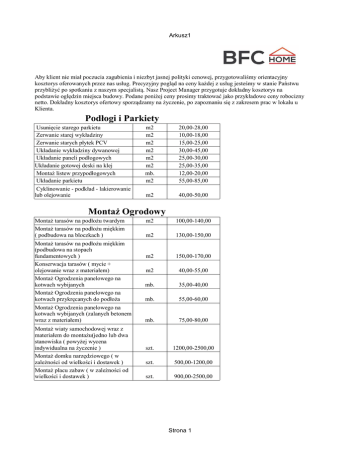 Arkusz1 Aby klient nie miał poczucia zagubienia i niezbyt jasnej polityki cenowej, przygotowaliśmy orientacyjny kosztorys oferowanych przez nas usług. Precyzyjny pogląd na ceny każdej z usług jesteśmy w stanie Państwu przybliżyć po spotkaniu z naszym specjalistą. Nasz Project Manager przygotuje dokładny kosztorys na podstawie oględzin miejsca budowy. Podane poniżej ceny prosimy traktować jako przykładowe ceny robocizny netto. Dokładny kosztorys ofertowy sporządzamy na życzenie, po zapoznaniu się z zakresem prac w lokalu u Klienta. Podłogi i Parkiety Usunięcie starego parkietu Zerwanie starej wykładziny Zerwanie starych płytek PCV Układanie wykładziny dywanowej Układanie paneli podłogowych Układanie gotowej deski na klej Montaż listew przypodłogowych Układanie parkietu Cyklinowanie - podkład - lakierowanie lub olejowanie m2 m2 m2 m2 m2 m2 mb. m2 20,00-28,00 10,00-18,00 15,00-25,00 30,00-45,00 25,00-30,00 25,00-35,00 12,00-20,00 55,00-85,00 m2 40,00-50,00 Montaż Ogrodowy Montaż tarasów na podłożu twardym Montaż tarasów na podłożu miękkim ( podbudowa na bloczkach ) Montaż tarasów na podłożu miękkim (podbudowa na stopach fundamentowych ) Konserwacja tarasów ( mycie + olejowanie wraz z materiałem) Montaż Ogrodzenia panelowego na kotwach wybijanych Montaż Ogrodzenia panelowego na kotwach przykręcanych do podłoża Montaż Ogrodzenia panelowego na kotwach wybijanych (zalanych betonem wraz z materiałem) Montaż wiaty samochodowej wraz z materiałem do montażu(jedno lub dwa stanowiska ( powyżej wycena indywidualna na życzenie ) Montaż domku narzędziowego ( w zależności od wielkości i dostawek ) Montaż placu zabaw ( w zależności od wielkości i dostawek ) m2 100,00-140,00 m2 130,00-150,00 m2 150,00-170,00 m2 40,00-55,00 mb. 35,00-40,00 mb. 55,00-60,00 mb. 75,00-80,00 szt. 1200,00-2500,00 szt. 500,00-1200,00 szt. 900,00-2500,00 Strona 1