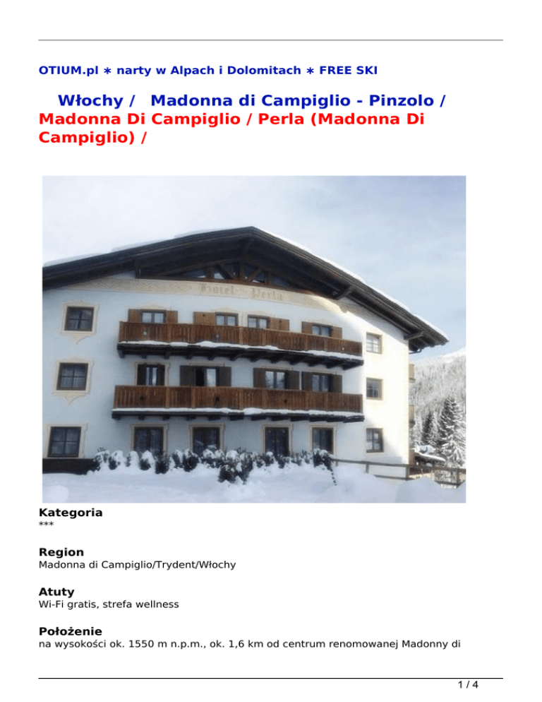 OTIUM.pl ∗ narty w Alpach i Dolomitach ∗ FREE SKI Włochy / Madonna di Campiglio - Pinzolo / Madonna Di Campiglio / Perla (Madonna Di Campiglio) / Kategoria *** Region Madonna di Campiglio/Trydent/Włochy Atuty Wi-Fi gratis, strefa wellness Położenie na wysokości ok. 1550 m n.p.m., ok. 1,6 km od centrum renomowanej Madonny di 1/4 Campiglio w Dolinie Val Rendena we włoskim Trydencie Wyciągi narciarskie do najbliższego wyciągu Colarin ok. 300 m (połączenie z Madonna di Campiglio i Pinzolo), do wyciągów w Madonna di Campiglio - Cinque Laghi i Spinale ok. 1,5 km. Uwaga! Wyciągi Puza dai Fo' - Patascoss łączące Pinzolo z Madonna di Campiglio (łącznie ok. 150 km tras narciarskich - Skiarea Campiglio Dolomiti di Brenta - Pinzolo, Madonna di Campiglio, Folgarida, Marilleva). Przystanek skibusa (za opłatą, ok. 10 euro/tydz.) znajduje się ok. 300 m od hotelu Wyposażenie recepcja, bar, restauracja, winda, przechowalnia sprzętu narciarskiego, garaż (za opłatą 15 euro/noc). Hotel posiada 3 piętra Internet tak (Wi-Fi - gratis, w wyznaczonych miejscach) Karty kredytowe tak (Visa, Mastercard) Sport i relaks strefa wellness (za opłatą - 5 euro/os./wejście, czynna w godz. 17.00-21.00) - sauna, jacuzzi Szkolenie narciarskie Madonna di Campiglio w terminach 14.01-26.02.2017 proponujemy (dodatkowo płatne) 6-dniowe grupowe szkolenia narciarskie na różnych poziomach zaawansowania dla dzieci od 4 lat, młodzieży i dorosłych - 2,5 h dziennie i dla jeżdżących w stopniu min. podstawowym dzieci 6-12 lat 4,5 h dziennie (Uwaga! w regionie Madonna di Campiglio nie prowadzimy szkoleń na poziomie 0). Fakultatywna dopłata przy rezerwacji. Szczegóły i ceny na stronie www Szkolenia narciarskie - info Pokoje (ok. 20-40 m<sup>2</sup>), hotel dysponuje 22 pokojami dwuosobowymi z możliwością jednej lub dwóch dostawek. Łazienka z WC, suszarka do włosów; TV-sat., telefon Wyżywienie śniadania w formie bufetu oraz 3-daniowe ciepłe kolacje podawane przez kelnera (wybór z menu). Napoje do kolacji dodatkowo płatne Kolacja Sylwestrowa obowiązkowo płatna przy rezerwacji 80 euro/os., w PLN wg kursu sprzedaży EUR z dnia rezerwacji Pieski tak (na zapytanie, za opłatą - 10 euro/dzień) 2/4 Kategoria lokalna *** Świadczenia 7 noclegów, wyżywienie 2 x dziennie wg opisu, ubezpieczenie Signal Iduna - Bezpieczne Podróże (w tym rekreacyjne uprawianie narciarstwa zjazdowego, biegowego lub snowboardu na oznakowanych trasach zjazdowych) - KL, KR, NNW i bagażu, opieka włoskiego kontrahenta Uwaga Zalecamy dodatkowe ubezpieczenie OC/SS (w tym sprzęt sportowy) Signal Iduna - 35 zł/os./pobyt Obowiązkowa opłata na miejscu taksa klimatyczna ok. 1-2,5 euro/os./dzień Zakwaterowanie przyjazd - od godz. 14.00, wyjazd - do godz. 10.00 Autokar przejazd komfortowym autokarem (klimatyzacja, WC, bar, video), warunki przewozu, cennik, program i rozkład jazdy na stronie organizatora Zniżki (na dostawkach) i dopłaty dzieci do 2,9 lat - gratis (możliwość wypożyczenia łóżeczka dla dziecka do 1,9 lat - za opłatą 15 euro/dzień), dzieci 3 - 16,9 lat na 3-cim łóżku - gratis, dzieci 3-16,9 lat na 4-tym łóżku - 50% zniżki, od 17 lat - 30% zniżki. Zniżki dla dzieci w terminach Free Ski wg cen w systemie. Dopłata za ubezpieczenie od kosztów rezygnacji 2,4% Oferta Free Ski w terminach 18.03-01.04.2017 karnet 6-dniowy Superskirama Adamello Brenta w cenie! Uwaga! Wszystkie karnety odbiera się w kasach w Madonna di Campiglio. Nie ma możliwości odbioru karnetów w kasach w Pinzolo Uwaga Na podstawie Vouchera we wszystkich kasach w Madonna di Campiglio zniżka 5% dla Klientów Otium na karnety typu Madonna di Campiglio lub Skiarea Campiglio Dolomiti di Brenta (Madonna, Pinzolo, Folgarida-Marilleva, Pejo). Uwaga! Zniżka nie obowiązuje w kasach w Pinzolo. Dzieci do 8 lat - gratis (1 karnet dla dziecka gratis na 1 karnet dla osoby dorosłej) Promocje Niezmienność ceny - dla rezerwacji potwierdzonych do 30.11.2016 3/4 data skąd pobyt opis cena / os 04.03.2017 nie dotyczy 7 dni Pokój: Pokój 2 osobowy Wyżywienie: śniadania+obiadokolacje 1440 zł / os 11.03.2017 nie dotyczy 7 dni Pokój: Pokój 2 osobowy Wyżywienie: śniadania+obiadokolacje 1725 zł / os 18.03.2017 nie dotyczy 7 dni Pokój: Pokój 2 osobowy Wyżywienie: śniadania+obiadokolacje 2280 zł / os 25.03.2017 nie dotyczy 7 dni Pokój: Pokój 2 osobowy Wyżywienie: śniadania+obiadokolacje 2040 zł / os OTIUM POLSKA SP. Z O.O. 30-150 KRAKÓW UL. ARMII KRAJOWEJ 12 lok. 11 tel./fax +48-12.4469214, 12.4469215, 12.4469216, 12.4469217 Zapraszamy poniedziałek-piątek w godzinach 10.00-18.00 (soboty 10.00-14.00 od połowy listopada do połowy kwietnia) E-mail: [email protected] Strona Internetowa: www.otium.pl 4/4 Powered by TCPDF (www.tcpdf.org)