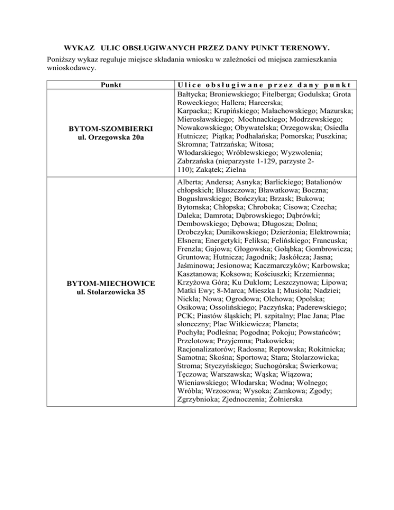 WYKAZ ULIC OBSŁUGIWANYCH PRZEZ DANY PUNKT TERENOWY. Poniższy wykaz reguluje miejsce składania wniosku w zależności od miejsca zamieszkania wnioskodawcy. Punkt BYTOM-SZOMBIERKI ul. Orzegowska 20a BYTOM-MIECHOWICE ul. Stolarzowicka 35 Ulice obsługiwane przez dany punkt Bałtycka; Broniewskiego; Fitelberga; Godulska; Grota Roweckiego; Hallera; Harcerska; Karpacka;; Krupińskiego; Małachowskiego; Mazurska; Mierosławskiego; Mochnackiego; Modrzewskiego; Nowakowskiego; Obywatelska; Orzegowska; Osiedla Hutnicze; Piątka; Podhalańska; Pomorska; Puszkina; Skromna; Tatrzańska; Witosa; Włodarskiego; Wróblewskiego; Wyzwolenia; Zabrzańska (nieparzyste 1-129, parzyste 2110); Zakątek; Zielna Alberta; Andersa; Asnyka; Barlickiego; Batalionów chłopskich; Bluszczowa; Bławatkowa; Boczna; Bogusławskiego; Bończyka; Brzask; Bukowa; Bytomska; Chłopska; Chroboka; Cisowa; Czecha; Daleka; Damrota; Dąbrowskiego; Dąbrówki; Dembowskiego; Dębowa; Długosza; Dolna; Drobczyka; Dunikowskiego; Dzierżonia; Elektrownia; Elsnera; Energetyki; Feliksa; Felińskiego; Francuska; Frenzla; Gajowa; Głogowska; Gołąbka; Gombrowicza; Gruntowa; Hutnicza; Jagodnik; Jaskółcza; Jasna; Jaśminowa; Jesionowa; Kaczmarczyków; Karbowska; Kasztanowa; Koksowa; Kościuszki; Krzemienna; Krzyżowa Góra; Ku Duklom; Leszczynowa; Lipowa; Matki Ewy; 8-Marca; Mieszka I; Musioła; Nadziei; Nickla; Nowa; Ogrodowa; Olchowa; Opolska; Osikowa; Ossolińskiego; Paczyńska; Paderewskiego; PCK; Piastów śląskich; Pl. szpitalny; Plac Jana; Plac słoneczny; Plac Witkiewicza; Planeta; Pochyła; Podleśna; Pogodna; Pokoju; Powstańców; Przelotowa; Przyjemna; Ptakowicka; Racjonalizatorów; Radosna; Reptowska; Rokitnicka; Samotna; Skośna; Sportowa; Stara; Stolarzowicka; Stroma; Styczyńskiego; Suchogórska; Świerkowa; Tęczowa; Warszawska; Wąska; Wiązowa; Wieniawskiego; Włodarska; Wodna; Wolnego; Wróbla; Wrzosowa; Wysoka; Zamkowa; Zgody; Zgrzybnioka; Zjednoczenia; Żołnierska BYTOM-CENTRUM ul. Strzelców Bytomskich 21 Adamka; Akacjowa; Aleja Legionów (parzyste 2–12, nieparzyste 1-49); Al. Legionów (nr parzyste od 14, nr nieparzyste od 51; Alojzjanów; Apteczna; Arki Bożka; Armii Krajowej; Astrów; Axentowicza; Baczyńskiego; Batorego; Bema; Braci Śniadeckich; Bratków; Brzezińska; Chełmońskiego; Chorzowska; Chopina; Chrobrego; Chrzanowskiego; Czarnieckiego; Cicha; Cybisa; Cyryla i Metodego; Czajkowskiego; Didura; Drzymały; Dworcowa; Dworska; Estreichera; Fabryczna; Falista; Fałata; Floriańska; Gallusa; Glinki; Gliwicka; Głowackiego; Głęboka; Grabowa; Grottgera; Górnośląska; Gwarecka; Jagiellońska; Jainty; Jałowcowa; Janasa; Jaronia; Jaworowa; Jochymczyka; Jodłowa; Józefczaka; K. Miarki (do nr 15); Karlika; Kasperka; Kasprowicza; K. Miarki (nr parzyste od 16, nieparzyste od 19); Katowicka; Kazimierza Wielkiego; Kędzierzyńska; Kingi; Klonowa; Kolejowa; Kolonia Zygmunt; Kolonia Zgorzelec Kochanowskiego; Kołłątaja; Kołobrzeska; Konstytucji (od 63-126); Konstytucji (parzyste do nr 72, nieparzyste do nr 57); Konwalii; Kopalniana; Korfantego (do nr 16); Korfantego (parzyste od nr 18, nieparzyste od nr 21); Kossaka; Kościelna; Koziołka; Kraszewskiego; Krakowska; Krańcowa; Krawiecka; Królowej Jadwigi; Krótka; Krucza; Kruszcowa; Krzywoustego; Krzyżowa; Kwiatowa; Kwietniewskiego; Lelewela; Lenartowicza; Ligęzy; Ligonia; Ludowa; Łużycka; Łagiewnicka; Łanowa; Łączna; Malczewskiego; Małgorzatki; Mariacka; Matejki (parzyste do nr 20, nieparzyste do nr 17); Matejki (nr parzyste od 22, nieparzyste od 19); Mickiewicza; Miechowicka; Miętkiewicza; Mikołaja; Miodowa; Młodzieżowa; Młyńska; Moniuszki; Morcinka; Murarska; Musialika; Myśliwca; Nawrota; Niemcewicza; Obozowa; Odrzańska; Ogródki działkowe Zawadzkiego; Ogródki działkowe przy ul. Staffa; Okulickiego; Olejniczaka; Olimpijska; Olszewskiego; Oświęcimska; Orkana; Orląt Lwowskich; Orzeszkowej; Ostatnia; Palińskiego; Pasteura; Piekarska; Pilotów; Piłkarska; Piłsudskiego (parzyste od 1–55, nieparzyste od 2-50); Piastów Bytomskich; Piecucha; Piłsudskiego (parzyste od 52, nieparzyste od 57); Pionierów; Plac Akademicki; Plac Grunwaldzki; Pl. Barbary Konopnickiej; Plac na Bobrku; Plac Koścuszki; Plac Rodła; Plac Sikorskiego; Plac Wojska Polskiego; Plac Słowiański; Pocztowa; Pod Brzozami; Podgórna; Popiełuszki; Powstańców Warszawskich nr 1-58; Powstańców Warszawskich od 60; Powstańców Śląskich; Północna; Prusa; Przemysłowa; Pszczyńska; Pułaskiego; BYTOM-CENTRUM ul. Strzelców Bytomskich 21 BYTOM-STROSZEK ul. Szymały 122b Prokopa; Prosta; Racławicka; Rodziewiczówny; Rajska; Rataja; Reja; Rejtana; Reymonta; Robotnicza; Romanowskiego; Rostka Różana; Rudna; Rudzkiego; Rycerska; Rynek; Rzeźnicza; Sandomierska; Sądowa; Schenka; Siemianowicka; Siemiradzkiego; Sienna; Składowa; Skłodowskiej–Curie; Solskiego; Słoneczna; Szkolna; Smolenia do nr 24; Smolenia od 25; Smółki; Sokoła; Spacerowa; Stalmacha; Stalowa; Stara Cynkownia; Staromiejska; Stokrotek; Staffa; Stawowa; Strażacka; Strzelców Bytomskich nr 1-69; Szafranka; Szczęść Boże; Szyby Rycerskie; Szymanowskiego; Ściegiennego; Św. Piotra; Św. Marka; Świętochłowicka; Świętojańska; Tarnogórska; Techniczna; Tomasza; Towarowa; Towarzyska; Tramwajarzy; Tulipanów; Tuwima; Ułańska; Ustronie; Wallisa; Wałowa; Warzywna; Webera; Wesoła; Witczaka (nr parzyste do 54, nieparzyste do 39); Witczaka (nieparzyste od 49 parzyste od 56); Wolskiego; Worpie; Woźniaka; Wrocławska; Wyczółkowskiego; Wyspiańskiego Wytrwałych; Zabrzańska (parzyste od nr 116, nieparzyste od nr 133); Zapolskiej; Zielińskiego; Zielona; Zygmunta Starego; Żeromskiego; Żwirki i Wigury, Żwirowa; Żółkiewskiego; Żołnierza Polskiego; 11-go Listopada; 9-go Maja; Blachówka; Celna; Dąbrowa Miejska; Długa; Drzewna; Edwarda Rydza Śmigłego; Galmanowa; Górnicza; Graniczna; Gwarków Tarnogórskich; Herdy; Hlonda; Holeczków; Jagodowa; Kadłubka; Kokota; Komisji Edukacji Narodowe
