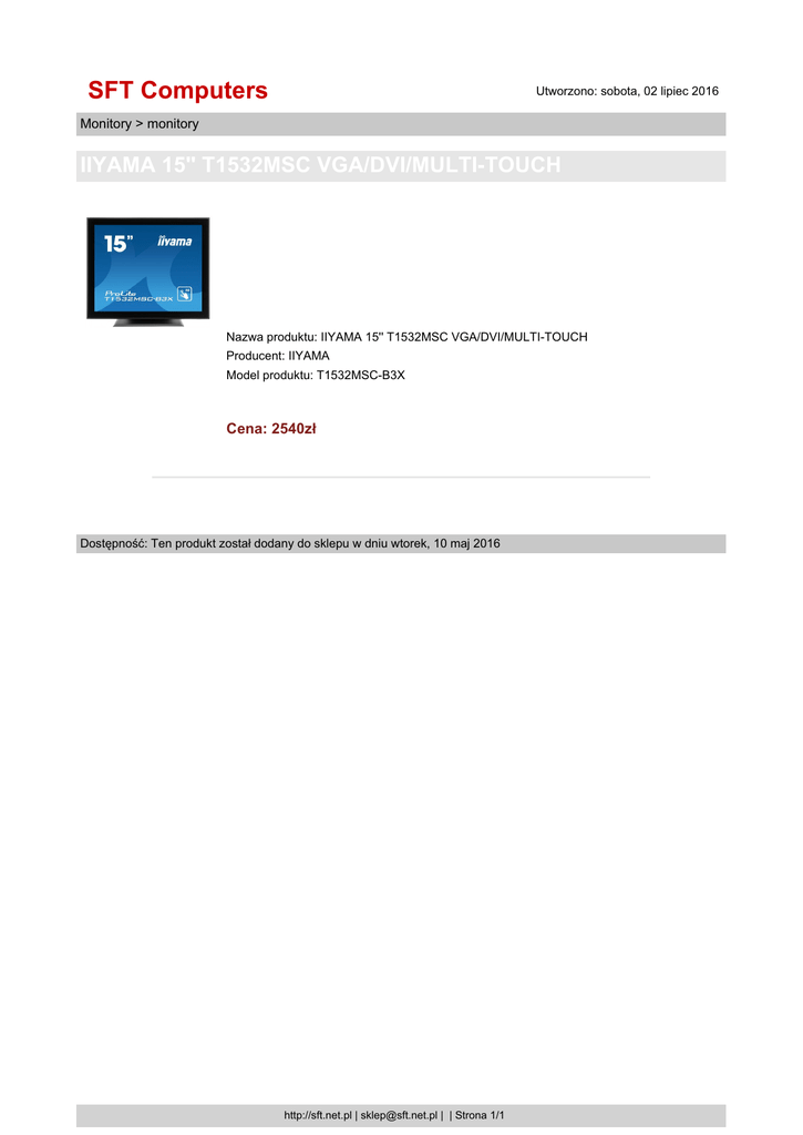 SFT Computers Utworzono: sobota, 02 lipiec 2016 Monitory > monitory IIYAMA 15'' T1532MSC VGA/DVI/MULTI-TOUCH Nazwa produktu: IIYAMA 15'' T1532MSC VGA/DVI/MULTI-TOUCH Producent: IIYAMA Model produktu: T1532MSC-B3X Cena: 2540zł Dostępność: Ten produkt został dodany do sklepu w dniu wtorek, 10 maj 2016 http://sft.net.pl | [email protected] | | Strona 1/1