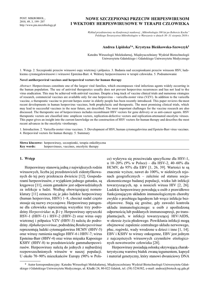 POST. MIKROBIOL., 2010, 49, 3, 199207 http://www.pm.microbiology.pl NOWE SZCZEPIONKI PRZECIW HERPESWIRUSOM I WEKTORY HERPESWIRUSOWE W TERAPII CZ£OWIEKA Wyk³ad przedstawiony na Konferencji naukowej Mikrobiologia 100 lat po Robercie Kochu Polskiego Towarzystwa Mikrobiologów w Warszawie w dniach 3031 sierpnia 2010 r. Andrea Lipiñska1*, Krystyna Bieñkowska-Szewczyk1 Katedra Wirusologii Molekularnej, Miêdzyuczelniany Wydzia³ Biotechnologii Uniwersytetu Gdañskiego i Gdañskiego Uniwersytetu Medycznego 1. Wstêp. 2. Szczepionki przeciw wirusowi ospy wietrznej i pó³paca. 3. Badania nad szczepionkami przeciw wirusom HSV, ludzkiemu cytomegalowirusowi i wirusowi Epsteina-Barr. 4. Wektory herpeswirusowe w terapii cz³owieka. 5. Podsumowanie Novel antiherpesviral vaccines and herpesviral vectors for human therapy Abstract: Herpesviruses constitute one of the largest viral families, which encompasses viral infectious agents widely occurring in the human population. The use of antiviral therapeutics usually does not prevent herpesvirus recurrences and has not lead to th e virus eradication. This may be achieved with antiviral vaccines. Despite a long track of vaccine clinical trials and numerous strategies of research, commercial vaccines are available only for one herpesvirus varicella-zoster virus (VZV). In addition to the varicella vaccine, a therapeutic vaccine to prevent herpes zoster in elderly people has been recently introduced. This paper reviews the most recent developments in human herpesvirus vaccines, both prophylactic and therapeutic. The most promising clinical trials, which may lead to successful vaccines in the near future, are described. The most important challenges for the vaccine research are also discussed. The therapeutic use of herpesviruses includes recombinant HSV vectors for gene delivery or as anti-cancer agents. HSV therapeutic vectors are classified into: amplicon vectors, replication-defective vectors and replication-attenuated oncolytic viruses. This paper gives an insight into the current knowledge on the construction of HSV vectors for human therapy and describes the most recent advances in the oncolytic virotherapy. 1. Introduction. 2. Varicella-zoster virus vaccines. 3. Development of HSV, human cytomegalovirus and Epstein-Barr virus vaccines. 4. Herpesviral vectors for human therapy. 5. Summary S³owa kluczowe: herpeswirusy, szczepionki, terapia onkolityczna Key words: herpesviruses, vaccines, oncolytic therapy 1. Wstêp Herpeswirusy stanowi¹ jedn¹ z najwiêkszych rodzin wirusowych, liczba jej przedstawicieli zidentyfikowanych do tej pory przekracza dwiecie [12]. Gospodarzami herpeswirusów, z wyj¹tkiem jednego gatunku, s¹ krêgowce [11], osiem gatunków jest odpowiedzialnych za infekcje u ludzi. Wed³ug obowi¹zuj¹cej nomenklatury [11] oznacza siê je jako ludzkie herpeswirusy (human herpesvirus, HHV) 18, chocia¿ nadal czêsto stosuje siê nazwy zwyczajowe. Herpeswirusy patogenne dla cz³owieka reprezentuj¹ wszystkie trzy podrodziny Herpesviridae: ", $ i (. Herpeswirusy opryszczki HSV-1 (HHV-1) i HSV-2 (HHV-2) oraz wirus ospy wietrznej i pó³paca VZV (HHV-3) nale¿¹ do podrodziny Alphaherpesvirinae, podrodzinê Betaherpesvirinae reprezentuj¹ ludzki cytomegalowirus HCMV (HHV-5) oraz wirusy rumienia nag³ego HHV-6 i HHV-7; wirus Epsteina-Barr (HHV-4) oraz wirus miêsaka Kaposiego KSHV (HHV-8) to przedstawiciele gammaherpeswirusów. Herpeswirusy nale¿¹ do jednych z najbardziej rozpowszechnionych wirusów w naszej populacji. U oko³o 7090% mieszkañców Europy (90% w Pols- ce) wykrywa siê przeciwcia³a specyficzne dla HSV-1, u 1020% (9% w Polsce) dla HSV-2, 4060% dla HCMV, do 95% dla EBV [1, 26, 39]. Wartoci te s¹ znacznie wy¿sze, nawet do 100%, w niektórych rejonach geograficznych zale¿nie od statusu socjoekonomicznego badanej populacji, wieku lub infekcji towarzysz¹cych, np. u nosicieli wirusa HIV [2, 26]. Ludzkie herpeswirusy powoduj¹ u osób z prawid³owo funkcjonuj¹cym uk³adem immunologicznym choroby zwykle o przebiegu ³agodnym lub wrêcz infekcje bezobjawowe. Staj¹ siê grone, gdy zawodzi kontrola uk³adu immunologicznego: u osób z upoledzon¹ odpornoci¹ lub poddanych immunosupresji, po transplantacjach, w infekcji towarzysz¹cej HIV/AIDS, w okresie ¿ycia p³odowego. Powik³ania infekcji mog¹ obejmowaæ zapalenie centralnego uk³adu nerwowego, p³uc, rogówki, wady wrodzone u dzieci i inne [1, 14]. EBV i KSHV to wirusy onkogenne, EBV jest jednym z najczêstszych wirusowych czynników etiologicznych nowotworów cz³owieka [28]. Herpeswirusy posiadaj¹ os³onkê okrywaj¹c¹ charakterystyczn¹ warstwê bia³ek zwan¹ tegumentem, kapsyd i materia³ genetyczny, który stanowi dwuniciowy DNA * Autor korespondencyjny: Katedra Wirusologii Molekularnej, Miêdzyuczelniany Wydzia³ Biotechnologii Uniwersytetu Gdañskiego i Gdañskiego Uniwersytetu Medycznego, ul. K³adki 24, 80-822 Gdañsk, tel. (58) 5236382, e-mail: [email protected] 200 ANDREA LIPIÑSKA, KRYSTYNA BIEÑKOWSKA-SZEWCZYK o d³ugoci do 235 tys. pz [35]. W os³once zakotwiczone s¹ m.in. glikoproteiny wirusowe, odpowiedzialne za wnikanie wirionów do komórek i stanowi¹ce g³ówny cel przeciwcia³ neutralizuj¹cych. Ekspresja genów herpeswirusowych to proces wieloetapowy i cile kontrolowany, odbywa siê w sposób kaskadowy w trzech g³ównych fazach: natychmiastowo-wczesnej (", immediate-early, IE), wczesnej ($, early, E) i pónej ((, late, L) [35, 45]. W trakcie infekcji powstaje stosunkowo du¿o bia³ek, z których znakomita czêæ indukuje siln¹ odpowied immunologiczn¹. Po infekcji pierwotnej herpeswirusy przechodz¹ w stan utajenia latencji w komórkach nerwowych (HSV, VZV), limfocytach (HHV-6/7, EBV, KHSV), monocytach/makrofagach (CMV, HHV-6), komórkach uk³adu siateczkowo-ródb³onkowego wêz³ów ch³onnych i komórkach ródb³onka têtnic (HCMV), gdzie w okrelonych warunkach dochodzi do ich reaktywacji [3, 14, 38]. Podczas latencji zachodzi ograniczona ekspresj