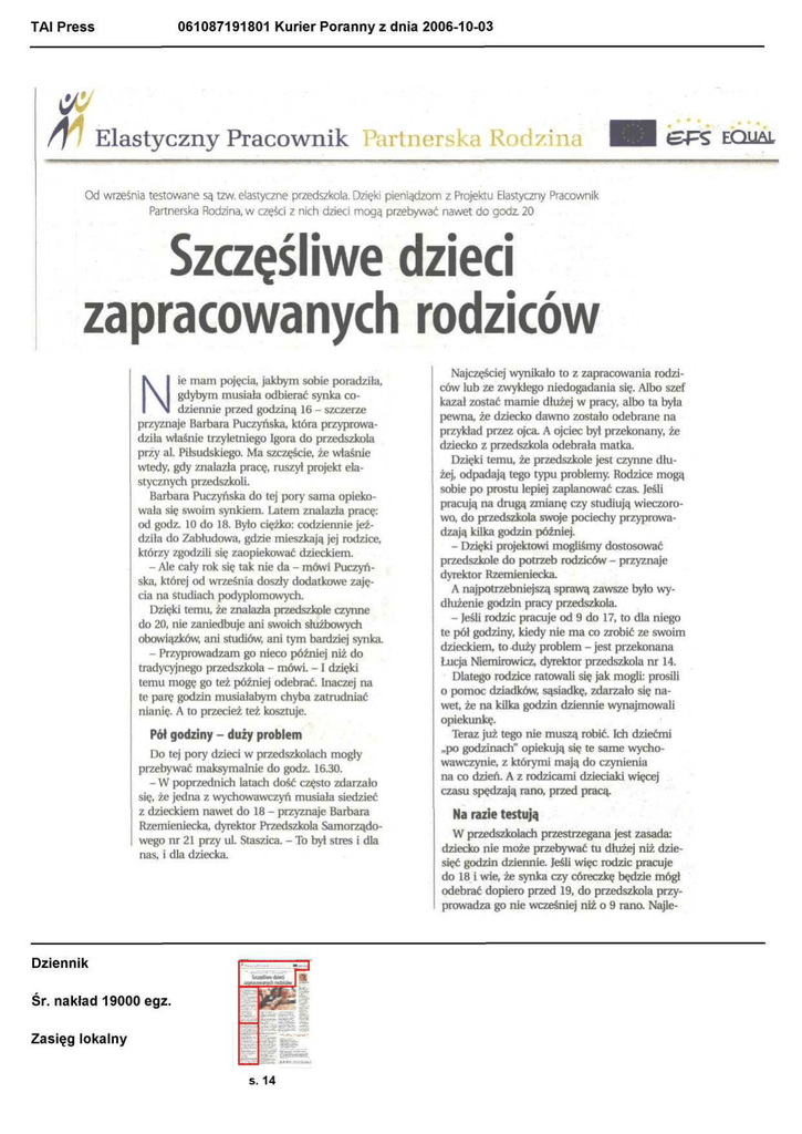061087191801 Kurier Poranny z dnia 2006-10-03 TAI Press W rj Elastyczny Pracownik Partnerska Rodzina l ePS EOLIAL Od września testowane są tzw. elastyczne przedszkola. Dzięki pieniądzom z Projektu Elastyczny Pracownik Partnerska Rodzina, w części z nich dzieci mogą przebywać nawet do godz. 20 Szczęśliwe dzieci zapracowanych rodziców N ie mam pojęcia, jakbym sobie poradziła, gdybym musiała odbierać synka codziennie przed godziną 16 - szczerze przyznaje Barbara Puczyńska, która przyprowadziła właśnie trzyletniego Igora do przedszkola przy al. Piłsudskiego. Ma szczęście, że właśnie wtedy, gdy znalazła pracę, ruszy! projekt elastycznych przedszkoli. Barbara Puczyńska do tej pory sama opiekowała się swoim synkiem. Latem znalazła pracę: od godz. 10 do 18. Było ciężko: codziennie jeździła do Zabłudowa, gdzie mieszkają jej rodzice, którzy zgodzili się zaopiekować dzieckiem. - Ale cały rok się tak nie da - mówi Puczyńska, której od września doszły dodatkowe zajęcia na studiach podyplomowych. Dzięki temu, że znalazła przedszkole czynne do 20, nie zaniedbuje ani swoich służbowych obowiązków, ani studiów, ani tym bardziej synka. - Przyprowadzam go nieco później niż do tradycyjnego przedszkola - mówi. - I dzięki temu mogę go też później odebrać. Inaczej na te parę godzin musiałabym chyba zatrudniać nianię. A to przecież też kosztuje. Pół godziny - duży problem Do tej pory dzieci w przedszkolach mogły przebywać maksymalnie do godz. 16.30. - W poprzednich latach dość często zdarzało się, że jedna z wychowawczyń musiała siedzieć z dzieckiem nawet do 18 - przyznaje Barbara Rzemieniecka, dyrektor Przedszkola Samorządowego nr 21 przy ul. Staszica. - To był stres i dla nas, i dla dziecka. Dziennik Śr. nakład 19000egz. Zasięg lokalny s. 14 Najczęściej wynikało to z zapracowania rodziców lub ze zwykłego niedogadania się. Albo szef kazał zostać mamie dłużej w pracy, albo ta była pewna, że dziecko dawno zostało odebrane na przykład przez ojca A ojciec był przekonany, że dziecko z przedszkola odebrała matka. Dzięki temu, że przedszkole jest czynne dłużej, odpadają tego typu problemy. Rodzice mogą sobie po prostu lepiej zaplanować czas. Jeśli pracują na drugą zmianę czy studiują wieczorowo, do przedszkola swoje pociechy przyprowadzają kUka godzin później. - Dzięki projektowi mogliśmy dostosować przedszkole do potrzeb rodziców - przyznaje dyrektor Rzemieniecka. A najpotrzebniejszą sprawą zawsze było wydłużenie godzin pracy przedszkola. - Jeśli rodzic pracuje od 9 do 17, to dla niego te pół godziny, kiedy nie ma co zrobić ze swoim dzieckiem, to duży problem - jest przekonana Łucja Niemirowicz, dyrektor przedszkola nr 14. Dlatego rodzice ratowali się jak mogli: prosili o pomoc dziadków, sąsiadkę, zdarzało się nawet, że na kilka godzin dziennie wynajmowali opiekunkę. Teraz już tego nie muszą robić. Ich dziećmi „po godzinach" opiekują się te same wychowawczynie, z którymi mają do czynienia na co dzień. A z rodzicami dzieciaki więcej czasu spędzają rano, przed pracą. Na razie testują W przedszkolach przestrzegana jest zasada: dziecko nie może przebywać tu dłużej niż dziesięć godzin dziennie. Jeśli więc rodzic pracuje do 18 i wie, że synka czy córeczkę będzie mógł odebrać dopiero przed 19, do przedszkola przyprowadza go nie wcześniej niż o 9 rano. Najle- TAI Press 061087191802 Kurier Poranny z dnia 2006-10-03 piej, żeby zgłosił to dzień wcześniej. Wtedy przedszkolna intendentka wie, ile trzeba przygotować kolacji. Opłata za kolację to jedyny dodatkowy koszt, który ponoszą rodzice. Resztę pokrywa Projekt Elastyczny Pracownik Partnerska Rodzina. Każdego dnia w każdym z testowanych przedszkoli zostaje dłużej sześcioro-dziesięcioro maluchów. W sumie w przedszkolu przy ul. Staszica jest ich 21. To jedna czwarta wszystkich uczęszczających tu dzieci. - Rodzice dopiero się przyzwyczajają do tej formy opieki. Niby wiedzą, że jest taka możliwość, ale sprawdzają, czy wypada zostawić dłużej dziecko w przedszkolu. Czy jeśli to zrobią, to nie przylgnie do nich etykieta złej matki czy złego ojca - mówi dyrektor Rzemieniecka. Ale są tacy, którzy są przekonani, że to dobre rozwiązanie. - Chcą do nas przepisać swoje dzieci z innych przedszkoli, które nie biorą udziału w projekcie - przyznaje Barbara Rzemieniecka. Tylko rok. l co dalej? Skąd pomysł na to, żeby wydłużyć czas pracy przedszkoli? Pracownicy Projektu Elastyczny Pracownik Partnerska Rodzina już dwukrotnie przeprowadzili badania wśród pracujących rodziców. Rozdali ankiety w przedszkolach, z rodzicami spotkali się też w Fikolandzie. Pytali w nich o doświadczenia i oczekiwania rodziców wobec publicznej organizacji opieki nad dziećmi, które najbardziej sprzyjają godzeniu życia zawodowego i rodzinnego. Wywiad został skierowany do 500 rodziców dzieci w wieku do siedmiu lat, które uczęszczają do publicznych żłobków i przedszkoli. Przeprowadzone badanie potwierdziło, że zapotrzebowanie na wydłużenie pracy przedszkoli jest - i to spore: Potrzebuje tego około 30-40 proc. białostockich rodziców. Niestety, na kilkadziesiąt białostockich placówek w projekcie bierze udział tylko siedem przedszkoli i dwa żłobki. - O ich wytypowanie poprosiliśmy Urząd Miasta, z którym współpracujemy przy realizacji Projektu - mówi Małgorzata Żynel, która w Projekcie Elastyczny Pracownik Partnerska Rodzina zajmuje się właśnie przedszkolami. Dziennik Śr. nakład 19000egz. Zasięg lokalny s. 14 Są to przedszkola, które opiekują się dużą liczbą dzieci, rozsiane po całym Białymstoku. Każde z nich na dodatkowe godziny może wydać w ciągu roku około 100 tyś. złotych. To pieniądze z Projektu przeznaczone na wynagrodzenie pracowników, zakup dodatkowych zabawek czy pomocy dydaktycznych i na opłacenie na przykład prądu czy 
