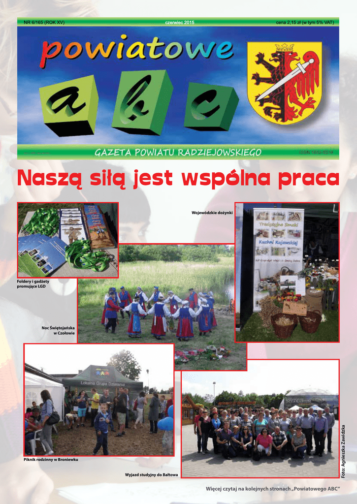 Naszą siłą jest wspólna praca Wojewódzkie dożynki Foldery i gadżety promujące LGD Piknik rodzinny w Broniewku Wyjazd studyjny do Bałtowa Foto: Agnieszka Zawidzka Noc Świętojańska w Czołowie Więcej czytaj na kolejnych stronach „Powiatowego ABC” Wieści samorządowe Ustalenia w sprawie dworca PKS Z inicjatywy starosty radziejowskiego Jarosława Kołtuniaka odbyło się spotkanie dotyczące przywrócenia poczekalni dworca PKS w Radziejowie. W dyskusji udział wzięli: Sławomir Bykowski – burmistrz miasta Radziejowa, Sławomir Bogucki – burmistrz miasta i gminy Piotrków Kujawski, Marek Szuszman – wójt gminy Radziejów, Włodzimierz Gorzycki – sekretarz miasta Radziejowa, a także radny Sejmiku Województwa Kujawsko-Pomorskiego Stanisław Pawlak oraz prezes Zarządu Kujawsko-Pomorskiego Transportu Samochodowego we Włocławku – Tomasz Fic. Lokalne władze wyraziły swoje zaniepokojenie brakiem poczekalni autobusowej. Prowizoryczny kontener ma zbyt małą powierzchnię, by pomieścić dużą liczbę osób. Przedłużająca się budowa wykończeniowa budynku dworca wzbudza duży niepokój rodziców, nauczycieli i mieszkańców powiatu. Efektem tego spotkania była deklaracja prezesa Zarządu Kujawsko-Pomorskiego Transportu Samochodowego, że do jesieni 2015 r. zostanie oddana do użytku poczekalnia autobusowa dworca PKS w Radziejowie. Tekst/Foto: nadesłane Nowy dyrektor Powiatowego Urzędu Pracy w Radziejowie Od 5 czerwca br. nowym dyrektorem miejscowego „pośredniaka” została powołana Małgorzata Jeryś, która okazała się najlepsza podczas majowego konkursu na to stanowisko. (Od prawej) Stanisław Pawlak, Marek Szuszman, Jarosław Kołtuniak Ruszyła filia radziejowskiej szkoły muzycznej Szkoła Muzyczna I stopnia w Radziejowie od 15 lat nieustannie się rozwija. Świadczy o tym zarówno regularnie rosnąca ilość uczniów, jak i nowe instrumenty, na których można się uczyć. W odpowiedzi na oczekiwania rodziców, uczniów oraz władz – po długich staraniach – 21 maja 2015 r. zostało podpisane porozumienie pomiędzy Starostwem Powiatowym w Radziejowie a Urzędem Gminy w Wierzbinku o utworzeniu Fili Szkoły Muzycznej w Wierzbinku. Utworzenie filii przełoży się bezpośrednio na rozwój kultury muzycznej w regionie, a także ułatwi dzieciom i młodzieży dostęp do nauki. Małgorzata Jeryś, nowa szefowa radziejowskiego urzędu Pracy Nowa szefowa związana jest zawodowo z radziejowskim urzędem pracy od 1997 roku. Wówczas rozpoczynała karierę na stanowisku referenta, zaś przez ostatnie pół roku pełniła obowiązki dyrektora. Ponadto jest absolwentką Wydziału Prawa UMK w Toruniu, a studia podyplomowe z zakresu pośrednictwa pracy ukończyła w Wyższej Szkole Psychologii Społecznej w Warszawie. Jest mieszkanką Radziejowa. Poza obowiązkami zawodowymi pasjonuje się przyrodą i roślinami ozdobnymi. Tekst/Foto: Mirosław Kowalski (Od prawej) Jarosław Kołtuniak, starosta radziejowski i Paweł Szczepankiewicz, wójt Wierzbinka podpisują porozumienie Tekst: [źródło] http://smradziejow.edu.pl/?p=1094 Foto: Starostwo Powiatowe w Radziejowie Informacje 1 Uczennica Publicznej Szkoły Podstawowej w Krzywosądzy laureatką konkursu „Obrona Cywilna wokół nas” W okresie od 27 lutego do 3 kwietnia br. został przeprowadzony gminny etap konkursu „Obrona Cywilna wokół nas” pod hasłem „Bezpieczeństwo ma pierwszeństwo”, zorganizowanego przez wojewodę kujawsko-pomorskiego. W gminnym etapie wzięło udział dziesięcioro uczniów ze szkół podstawowych z terenu gminy Dobre. Gminna komisja konkursowa po dokonaniu oceny nadesłanych prac plastycznych, postanowiła wyróżnić pięć z nich. Wyróżnione prace zostały następnie zgłoszone do wojewódzkiego etapu konkursu. Decyzją wojewódzkiej komisji konkursowej w grupie szkół podstawowych III miejsce zdobyła Wiktoria Roszak, uczennica II klasy Publicznej Szkoły Podstawowej w Krzywosądzy. 8 czerwca 2015 r. w gmachu Kujawsko-Pomorskiego Urzędu Wojewódzkiego w Bydgoszczy miało miejsce uroczyste wręczenie dyplomów i nagród laureatom, którego dokonali: wojewoda kujawsko-pomorski – Ewa Mes oraz dyrektor Wydziału Bezpieczeństwa i Zarządzania Kryzysowego w Bydgoszczy – Lech Wesołowski. Wyróżniona praca zgodnie z decyzją wojewódzkiej komisji konkursowej została przesłana na konkurs centralny do Komendy Głównej Państwowej Straży Pożarnej w Warszawie. Laureatce serdecznie gratulujemy i życzymy sukcesu w dalszym etapie konkursu. Tekst: Tomasz Brzeziński Foto: Maciej Grabowski Nagrodzona uczennica z Ewą Mes i Lechem Wesołowskim Nowy sprzęt dla szpitala W miesiącu maju 2015 r. zakończona została realizacja zawartej 10 grudnia 2014 r. pomiędzy Województwem Kujawsko-Pomorskim a Samodzielnym Publicznym Zakładem Opieki Zdrowotnej w Radziejowie Umowa Nr SP-II.9211.1.4.2014.3041.17.2014 na dofinansowanie ze środków PFRON wyposażenia obiektu służącego rehabilitacji osób niepełnosprawnych w sprzęt rehabilitacyjny w ramach „Programu wyrównywania różnic między regionami II” – obszar A, dotyczącej w szczególności realizacji zadania pn. „Doposażenie SP ZOZ w Radziejowie w sprzęt rehabilitacyjny służący rehabilitacji osób niepełnosprawnych”. Całkowita wartość projektu wyniosła: 268 114,91zł. Dofinansowanie ze środków Państwowego Funduszu Osób Niepełnospraw- nych: 143 577,41 zł. Wkład własny Beneficjenta (SP ZOZ w Radziejowie) 124 537,50 zł. Termin realizacji projektu: grudzień 2014 r. – maj 2015 r. W wyniku realizacji projektu zakupiono: • aparat do terapii pourazowej, limfatycznej i naczyniowej Bodyflow – szt. 1, • bieżnia treningowa – szt. 1, • urządzenie do krioterapii + zbiornik – kpl. 1, • aparat 2-kanałowy do elektroterapii – szt. 1, • łóżka rehabilitacyjne z szafką przyłóżkową – szt. 31, • wózek do przewożenia pacjentów w pozycji leżącej – szt. 1, • lampa Biot