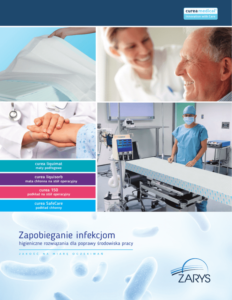 curea liquimat maty podłogowe curea liquisorb mata chłonna na stół operacyjny curea 150 podkład na stół operacyjny curea SafeCare podkład chłonny Zapobieganie infekcjom higieniczne rozwiązania dla poprawy środowiska pracy j a k o ś ć n a m i a r ę o c z e k i w a ń maty podłogowe Maty zapewniają suche podłoże podczas operacji, wspierając w ten sposób zachowanie bezpiecznego środowiska pracy. mo liquimat standard cia liquimat basic wość cię żli mata podłogowa mata podłogowa superchłonna mata, na której podczas operacji stoi personel medyczny posiada antypoślizgową powierzchnię spodnią zapewnia suche podłoże podczas operacji zwiększa poziom bezpieczeństwa w środowisku pracy chłonność: 1 l płynów dzięki niezwykle chłonnemu rdzeniowi absorbuje i trwale zatrzymuje duże ilości płynów spływających na podłogę podczas operacji właściwości chłonne zarówno spodniej, jak i górnej części, umożliwiają dwustronną aplikację bardzo cienka umożliwia bezpieczne i higieniczne zatrzymanie płynu w rdzeniu zwiększa poziom bezpieczeństwa w środowisku pracy podczas operacji skraca czas przygotowania stanowiska pracy, umożliwiając tym samym zwiększenie wydajności i zmniejszenie kosztów chłonność: 7 l wody lub 2,5 l roztworu soli fizjologicznej rozmiar 116cm x 76cm rozmiar 75cm x 36cm nr katalogowy produkt rozmiar wkład chłonny opakowanie LMB11600760-622 liquimat basic 116cm x 76cm - 50 szt. LMS07500360-623 liquimat standard 75cm x 36cm 68cm x 30cm 100 szt. mata chłonna na stół operacyjny Sterylna mata, niezależnie od położenia, zatrzymuje płyny wewnątrz szybko i bezpiecznie. idealna do procedur z dużą ilością płynów właściwości chłonne zarówno spodniej, jak i górnej części, umożliwiają dwustronną aplikację pozwala na bezpieczne i higieniczne zatrzymanie krwi oraz innych płynów niezależnie od położenia chłonie płyny szybko i niezawodnie zwiększa ochronę pacjenta oraz stołu przed kontaminacją absorpcja: 8 l wody lub 3,1 l roztworu soli fizjologicznej sterylna - możliwość bezpośredniego kontaktu z pacjentem rozmiar 60cm x 38cm nr katalogowy rozmiar wkład chłonny opakowanie LS06000380-625 60cm x 38cm 52cm x 30cm 50 szt. funkcjonalność, która chroni podkład na stół operacyjny Podkład na stół operacyjny umożliwiający przenoszenie pacjenta dzięki niezwykłej wytrzymałości materiału. Idealne rozwiązanie w codziennej pracy na bloku operacyjnym. io cn n lią a fo wia łatwy umożli tran spo rt p ac specjalna wars twa ta jen wz m o aby wysoka jakość stała się standardem Oddychający materiał Rozmiar całkowity: 210cm x 80cm Powierzchnia chłonna: 200cm x 60cm Warstwa wierzchnia, z którą kontakt ma pacjent, wykonana z gładkiej i delikatnej dla skóry włókniny PP. Powierzchnia chłonna wzmocniona folią odporną na rozdarcia, umożliwiającą transport pacjenta o wadze do 150 kg. Marginesy z dwóch stron podkładu zapewniają pewny chwyt podczas przenoszenia. Hydrofobowa, oddychająca warstwa spodnia spełnia funkcję bariery dla drobnoustrojów. zenia do ć przenos możliwoś Opatentowany absorbent SuperCore® zatrzymuje płyny oraz redukuje zapach. 150kg proste oraz wszechstronne rozwiązanie w codziennej pracy szpitala zapewnia pacjentowi suche środowisko oraz zapobiega przedostaniu się płynów na podłogę mocna i odporna na rozerwania konstrukcja umożliwia bezpieczne przenoszenie pacjentów zwiększa ochronę pacjenta oraz personelu przed zanieczyszczeniem krew oraz inne płyny zostają wchłonięte oraz bezpiecznie zamknięte w rdzeniu dzięki opatentowanemu absorbentowi SuperCore® zastosowanie: chirurgia, neurochirurgia, ginekologia, ortopedia, urologia, oddziały ratunkowe i wiele innych sprawia, że wymagająca praca w salach operacyjnych jest łatwiejsza zalety produktu: oszczędność poprawa poziomu higieny wielofunkcyjność mniej odpadów ekonomiczne rozwiązanie jeden produkt o szerokiej skali zastosowań w salach operacyjnych pacjent może być przenoszony oraz zabezpieczony podczas operacji z użyciem jednego produktu nr katalogowy rozmiar wkład chłonny opakowanie OPTA210080010-CPBTBS-638 210cm x 80cm 200cm x 60cm 20 szt. lepsza ochrona dzięki wiązaniu bakterii* Curea SafeCare podkład chłonny Bakterie i płyny ustrojowe to ryzykowne połączenie, które może mieć istotny wpływ na zdrowie pacjentów. Dzięki zastosowaniu technologii SuperCore® ryzyko to zostaje znacznie zmniejszone. zastosowanie: absorbcja i zatrzymanie płynów wszystkie obszary szpitala odporny na rozrywanie również w trudnych warunkach domy opieki dostępny w wersji oddychającej lub foliowanej hospicja opatentowana technologia SuperCore® zapewnia większą chłonność niż tradycyjne produkty zakłady opieki paliatywnej zapewnia lepsze samopoczucie pacjentów umożliwiając suchy i spokojny sen przepuszczalność powietrza i zapobieganie powstawaniu odleżyn wydajne wchłanianie i zatrzymywanie płynów bakterie (w tym MRSA) zostają zatrzymane w podkładzie przyjemna dla skóry, gładka powierzchnia redukcja zapachu nr katalogowy rozmiar wkład chłonny rodzaj opakowanie SC-6060-BTBS 60cm x 60cm 60cm x 60cm oddychający 112 szt. SC-6060-PE 60cm x 60cm 60cm x 60cm foliowany 112 szt. SC-9060-BTBS 60cm x 90cm 60cm x 90cm oddychający 70 szt. SC-9060-PE 60cm x 90cm 60cm x 90cm foliowany 112 szt. SC-18060-BTBS 60cm x 180cm 60cm x 90cm oddychający/z możliwością podwinięcia 56 szt. siła praktycznych rozwiązań w w w . z a r y s . c o m . p l Zapobieganie infekcjom, czyli higieniczne rozwiązania dla poprawy środowiska pracy w w w . z a r y s . c o m . p l W czasie zabiegów inwazyjnych dochodzi do uwolnienia dużej ilości płynów fizjologicznych oraz innych potencjalnie skażonych, które stanowią czynnik ryzyka infekcji szpitalnych. Nowe materiały absorbujące można stosować wszędzie tam, gdzie występują płyny zagrażające pracy lub bezpieczeństwu wszystkich 