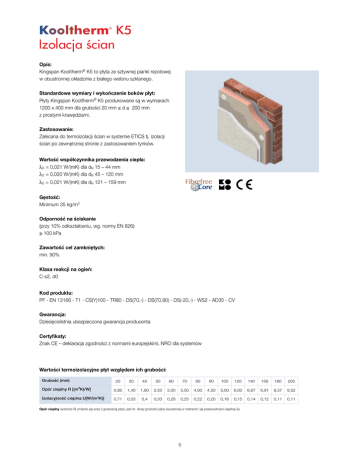 Kooltherm K5 Izolacja ścian ® Opis: Kingspan Kooltherm® K5 to płyta ze sztywnej pianki rezolowej w obustronnej okładzinie z białego welonu szklanego. Standardowe wymiary i wykończenie boków płyt: Płyty Kingspan Kooltherm® K5 produkowane są w wymiarach 1200 x 400 mm dla grubości 20 mm ≤ d ≤ 200 mm z prostymi krawędziami. Zastosowanie: Zalecana do termoizolacji ścian w systemie ETICS tj. izolacji ścian po zewnętrznej stronie z zastosowaniem tynków. Wartość współczynnika przewodzenia ciepła: λD = 0,021 W/(mK) dla dN 15 – 44 mm λD = 0,020 W/(mK) dla dN 45 – 120 mm λD = 0,021 W/(mK) dla dN 121 – 159 mm Gęstość: Minimum 35 kg/m3 Odporność na ściskanie (przy 10% odkształceniu, wg. normy EN 826): ≥ 100 kPa Zawartość cel zamkniętych: min. 90% Klasa reakcji na ogień: C-s2, d0 Kod produktu: PF - EN 13166 - T1 - CS(Y)100 - TR80 - DS(70,-) - DS(70,90) - DS(-20,-) - WS2 - AD35 - CV Gwarancja: Dziesięcioletnia ubezpieczona gwarancja producenta Certyfikaty: Znak CE – deklaracja zgodności z normami europejskimi, NRO dla systemów Wartości termoizolacyjne płyt względem ich grubości: Grubość (mm) 20 30 40 50 60 70 80 90 100 120 140 159 180 200 Opór cieplny R [(m K)/W] 0,95 1,40 1,90 2,50 3,00 3,50 4,00 4,50 5,00 6,00 6,67 6,91 8,57 9,52 Izolacyjność cieplna U[W/(m2K)] 0,71 0,53 0,4 0,33 0,28 0,25 0,22 0,20 0,16 0,15 0,14 0,12 0,11 0,11 2 Opór cieplny (wartość R) zmienia się wraz z grubością płyty; jest to iloraz grubości płyty (wyrażonej w metrach) i jej przewodności cieplnej (λ). 5