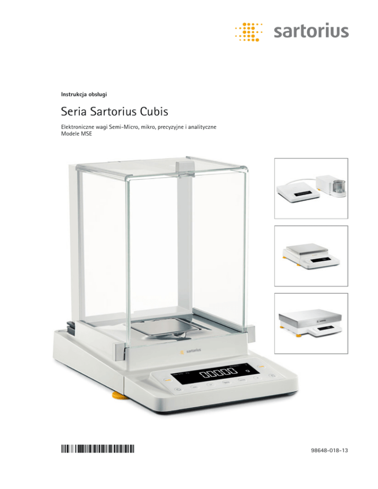 Instrukcja obsługi Seria Sartorius Cubis Elektroniczne wagi Semi-Micro, mikro, precyzyjne i analityczne Modele MSE 98648-018-13 Spis treści Spis treści Wskazówki do niniejszej instrukcji . . . . . . . . . . . . . . . . . . . . 3 Wskazówki dotyczące bezpieczeństwa . . . . . . . . . . . . . . . . . 4 Użytkowanie zgodne z przeznaczeniem . . . . . . . . . . . . . . . . 6 Opis urządzenia . . . . . . . . . . . . . . . . . . . . . . . . . . . . . . . . . . . . 7 Uruchomienie . . . . . . . . . . . . . . . . . . . . . . . . . . . . . . . . . . . . . . 9 Rozpakowanie urządzenia . . . . . . . . . . . . . . . . . . . . . . . . . . 9 Wskazówki dotyczące ustawiania. . . . . . . . . . . . . . . . . . . . 9 Montaż . . . . . . . . . . . . . . . . . . . . . . . . . . . . . . . . . . . . . . . . . 11 Transport wagi . . . . . . . . . . . . . . . . . . . . . . . . . . . . . . . . . . . 17 Warunki przechowywania i transportowania. . . . . . . . . . . 17 Podłączanie do sieci . . . . . . . . . . . . . . . . . . . . . . . . . . . . . . . 18 Czas rozgrzewania . . . . . . . . . . . . . . . . . . . . . . . . . . . . . . . . 19 Zabezpieczenie przed kradzieżą . . . . . . . . . . . . . . . . . . . . . 20 Możliwości przebudowy. . . . . . . . . . . . . . . . . . . . . . . . . . . . 21 Ważenie podszalkowe . . . . . . . . . . . . . . . . . . . . . . . . . . . . . 26 Przeprowadzenie kabla przy ręcznej osłonie wiatrowej wag analitycznych. . . . . . . . . . . . . . . . . 28 Eksploatacja . . . . . . . . . . . . . . . . . . . . . . . . . . . . . . . . . . . . . . . 29 Elementy wyświetlacza i obsługi. . . . . . . . . . . . . . . . . . . . . 29 Podstawowa funkcja ważenia . . . . . . . . . . . . . . . . . . . . . . . 30 Wypoziomowanie wagi za pomocą czujnika wychylenia . 31 Włączanie i wyłączanie jonizatora (opcja) . . . . . . . . . . . . . 31 Kalibracja, regulacja. . . . . . . . . . . . . . . . . . . . . . . . . . . . . . . 33 Ustawienia wstępne (menu). . . . . . . . . . . . . . . . . . . . . . . . . . 36 Funkcja przycisków menu . . . . . . . . . . . . . . . . . . . . . . . . . . 36 Obsługa menu; przykład: wybór języka. . . . . . . . . . . . . . . . 36 Struktura menu (przegląd). . . . . . . . . . . . . . . . . . . . . . . . . . 37 Ustawienia parametrów: przegląd . . . . . . . . . . . . . . . . . . . 38 Programy. . . . . . . . . . . . . . . . . . . . . . . . . . . . . . . . . . . . . . . . . . 45 Określanie gęstości. . . . . . . . . . . . . . . . . . . . . . . . . . . . . . . . 45 Liczenie . . . . . . . . . . . . . . . . . . . . . . . . . . . . . . . . . . . . . . . . . 48 Ważenie procentowe . . . . . . . . . . . . . . . . . . . . . . . . . . . . . . 50 Przeliczanie. . . . . . . . . . . . . . . . . . . . . . . . . . . . . . . . . . . . . . 52 Ważenie zwierząt/obliczanie wartości średnich . . . . . . . . 54 Ogólna wartość netto. . . . . . . . . . . . . . . . . . . . . . . . . . . . . . 56 Sumowanie . . . . . . . . . . . . . . . . . . . . . . . . . . . . . . . . . . . . . . 58 Zmiana jednostki . . . . . . . . . . . . . . . . . . . . . . . . . . . . . . . . . 60 Protokół ISO/GLP . . . . . . . . . . . . . . . . . . . . . . . . . . . . . . . . . . . 62 Złącza danych. . . . . . . . . . . . . . . . . . . . . . . . . . . . . . . . . . . . . . 63 Komunikaty o błędach . . . . . . . . . . . . . . . . . . . . . . . . . . . . . . 75 Czyszczenie i konserwacja (pakowanie wagi do transportu) . . . . . . . . . . . . . . . . . . . . . 76 Wysyłka wagi . . . . . . . . . . . . . . . . . . . . . . . . . . . . . . . . . . . . . . 80 Utylizacja . . . . . . . . . . . . . . . . . . . . . . . . . . . . . . . . . . . . . . . . . 86 Dane techniczne. . . . . . . . . . . . . . . . . . . . . . . . . . . . . . . . . . . . 87 Wymiary (rysunek wymiarowy) . . . . . . . . . . . . . . . . . . . . . . 100 Akcesoria (opcje) . . . . . . . . . . . . . . . . . . . . . . . . . . . . . . . . . . 108 Deklaracja zgodności. . . . . . . . . . . . . . . . . . . . . . . . . . . . . . . 110 Certyfikat zatwierdzenia typu WE . . . . . . . . . . . . . . . . . . . 112 Tabliczki i oznaczenia . . . . . . . . . . . . . . . . . . . . . . . . . . . . . . 113 płyta CD-ROM zawiera h Dołączona instrukcję obsługi w formacie pdf. Do wyświetlania i drukowania pliku potrzebny jest program AcrobatReader, który można pobrać bezpłatnie ze strony Adobe (www.adobe.com). Sterowniki oprogramowania do złączy USB można pobrać w internecie: http://www.ftdichip.com/FTDrivers.htm „Podręcznik instalacji” dla tych sterowników znajduje się na stronie: http://www.ftdichip.com/Documents/ InstallGuides.htm 2 Instrukcja obsługi Cubis MSE Wskazówki do niniejszej instrukcji Wskazówki do niniejszej instrukcji t Przed rozpoczęciem pracy z urządzeniem należy uważnie i dokładnie zapoznać się z niniejszą instrukcją. t Uważnie przeczytać wskazówki bezpieczeństwa. t Niniejsza instrukcja jest częścią produktu. Należy ją przechowywać w bezpiecznym miejscu i zapewnić do niej dobry dostęp. t W przypadku zagubienia instrukcji można zamówić kopię lub ściągnąć aktualną instrukcję ze strony Sartorius: www.sartorius.com Symbole i znaki W niniejszej instrukcji stosowane są następujące symbole i znaki: 1 2 3 Niebezpieczeństwo porażenia prądem Grozi obrażeniami lub śmiercią h Wskazówki dla użytecznych informacji i porad Niebezpieczeństwo wybuchu Grozi obrażeniami lub śmiercią Ostrzeżenie przed możliwymi obrażeniami, Ryzyko dla zdrowia lub niebezpieczeństwo szkód rzeczowych Wskazówki dla obrotu wymagającego legalizacji w zakresie obowiązywania dyrektywy 2009/23/WE Wskazówki dla obsługi urządzenia Opis symboli W niniejszej instrukcji stosowane są następujące symbole: t umieszczony przed wskazówkami postępowania y opisuje to, co dzieje się po wykonaniu danej czynności 1., Działania należy wykonywać w określonej kolejności 2. - umieszczony przez punktem wyliczania h Doradztwo dotyczące zast