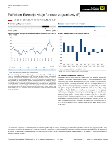 Termin wykonania 2015-10-30 1/2 Raiffeisen-Euroazja-Akcje fundusz zagraniczny (R) AT, BG, CH, CZ, DE, ES, FR, GB, HU, IT, LI, NL, PL, RO, SI, SK Tolerancja ryzyka przez inwestora Zalecany okres inwestowania w latach Niższe ryzyko Wyższe ryzyko Zmiana wartości w ciągu ostatnich 5 lat obrachunkowych: 2010-10-29 - 2015-10-30 w % rocznie Fundusz 1 rok 1,78 3 lata 3,91 5 lat 0,85 10 lat 7,09 Początek Rozwój wartości według lat kalendarzowych w% 62,42 38,83 40,84 -64,43 85,77 32,36 -22,37 17,57 -8,07 15,95 (2000-05-02) 4,63 Żródło: bank depozytowy (Raiffeisen Bank International AG) Przyrost wartości (performance) obliczany jest przez spółkę Raiffeisen KAG metodą OeKB na podstawie opublikowanych cen funduszy. Nie jest możliwe wyciągnięcie żadnych wiarygodnych wniosków dotyczących przyszłego rozwoju funduszu inwestycyjnego na podstawie przeszłych wyników. Przy obliczaniu rozwoju wartości nie uwzględnia się indywidualnych kosztów, szczególnie takich jak wysokość narzutu emisyjnego bądź ewentualnej opłaty za umorzenie czy też podatków. W przypadku ich uwzględnienia zmniejszają one rozwój wartości o konkretną kwotę. Maksymalną wysokość narzutu emisyjnego bądź ewentualnej opłaty za umorzenie znaleźć można w zestawieniu danych funduszu. Wskazówka dla inwestorów z walutą krajową inną aniżeli waluta funduszu: Zwracamy uwagę, że stopa zwrotu może się wahać na skutek zmian kursu walut. Wyniki z 12 miesięcy 30.09.2014 - 30.09.2015: -6,61 Żródło: bank depozytowy (Raiffeisen Bank International AG) Cel inwestycyjny/Kierunek inwestycji Raiffeisen-Euroazja-Akcje fundusz zagraniczny (R) podlega austriackiej ustawie o funduszach inwestycyjnych (InvFG) i jest funduszem akcji. Jako cel inwestycyjny zakłada długoterminowy przyrost kapitału z uwzględnieniem wyższego ryzyka i inwestuje przeważnie (min. 51 % majątku funduszu) w akcje i równoważne akcjom papiery wartościowe spółek, których siedziba lub główne miejsce prowadzenia działalności znajduje się w Azji i Rosji oraz/lub w Turcji. Dodatkowo możliwe są inwestycje w inne papiery wartościowe, w obligacje i instrumenty rynku pieniężnego, m.in. te emitowane przez państwa, spółki lub ponadnarodowych emitentów, w jednostki uczestnictwa funduszy inwestycyjnych oraz we wkłady płatne na żądanie i podlegające wypowiedzeniu. Fundusz jest zarządzany aktywnie i nie jest ograniczony benchmarkiem. Rodzajami ryzyka kluczowymi dla funduszu są m.in. ryzyko rynkowe, wyceny, płynności oraz kursów walut, a także ryzyko zmienności. Opublikowane prospekty lub informacje dla inwestorów zgodnie z § 21 ustawy zarządzających alternatywnymi funduszami inwestycyjnymi (AIFMG) oraz dokumenty informacyjne dla klienta (kluczowe informacje dla inwestorów) funduszy Raiffeisen Investment-Gesellschaft mbH, zatwierdzonych do dystrybucji w Polsce, są dostępne pod adresem www.rcm-international.com/pl, a także w siedzibie Raiffeisen Bank Polska S.A., ul. Piękna 20, 00-549 Warszawa, w języku angielskim i polskim. Raiffeisen Kapitalanlage-Gesellschaft m. b. H., Mooslackengasse 12, 1190 Wien | www.rcm.at | www.rcm-international.com/pl Termin wykonania 2015-10-30 2/2 Raiffeisen-Euroazja-Akcje fundusz zagraniczny (R) Ogólne informacje o funduszu ISIN f. reinwestujący całość zysku (V) AT0000745872 Wielkość funduszu w mln EUR 456,16 Założenie funduszu Struktura pap. wartościowych wg kraju siedziby 2000-05-02 Wypłata rocznie 15.04. Wyliczona wartość/udział V 201,72 Maks. narzut emisyjny (%) 5,00 Maks. opłata za umorzenie (%) 0,00 Koszty bieżące (%) ¹) 2,29 ¹) „Koszty bieżące“ naliczane są na podstawie danych liczbowych na dzień 30.12.2014 z uwzględnieniem poprzednich 12 miesięcy. „Koszty bieżące“ zawierają wynagrodzenie administracyjne i wszystkie opłaty pobrane w zeszłym roku. Koszty transakcji zagranicznych i opłaty uzależnione od powodzenia nie są częścią „opłat bieżących”. „Koszty bieżące“ mogą być każdego roku różne. Dokładny wykaz składników kosztów zawartych w „Kosztach bieżących” znaleźć można w aktualnym sprawozdaniu rocznym w podpunkcie „Koszty”. W ramach strategii inwestycyjnej możliwe są znaczne inwestycje w instrumenty pochodne (z uwzględnieniem związanego z nimi ryzyka). Fundusz wykazuje większą zmienność, tj. wartości udziałów ulegają dużym wahaniom w górę i w dół w krótkich okresach, przy czym nie można wykluczyć również strat kapitałowych. Jest to komunikat marketingowy. Wszystkie dane i informacje zostały zestawione i sprawdzone z największą starannością, a także z wykorzystaniem wiarygodnych źródeł. Niniejsze informacje są aktualne na dzień sporządzania aktualizacji. Nie ponosi się odpowiedzialności ani nie gwarantuje poprawności i kompletności informacji. Raiffeisen Kapitalanlage-Gesellschaft m. b. H., Mooslackengasse 12, 1190 Wien | www.rcm.at | www.rcm-international.com/pl Termin wykonania 2015-10-30 Załącznik Raiffeisen-Euroazja-Akcje fundusz zagraniczny (R) Rozwój wartości od założenia: 2000-05-02 - 2015-10-30 w % rocznie Fundusz 1 rok 3 lata 5 lat 10 lat 1,78 3,91 0,85 7,09 Struktura pap. wartościowych wg sektorów MSCI Początek Największe pozycje akcji (2000-05-02) Żródło: bank depozytowy (Raiffeisen Bank International AG) Przyrost wartości (performance) obliczany jest przez spółkę Raiffeisen KAG metodą OeKB na podstawie opublikowanych cen funduszy. Nie jest możliwe wyciągnięcie żadnych wiarygodnych wniosków dotyczących przyszłego rozwoju funduszu inwestycyjnego na podstawie przeszłych wyników. Przy obliczaniu rozwoju wartości nie uwzględnia się indywidualnych kosztów, szczególnie takich jak wysokość narzutu emisyjnego bądź ewentualnej opłaty za umorzenie czy też podatków. W przypadku ich uwzględnienia zmniejszają one rozwój wartości o konkretną kwotę. Maksymalną wysokość narzutu emisyjnego bądź ewentualnej 
