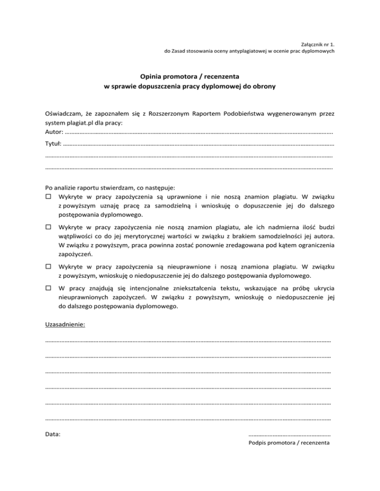Załącznik nr 1. do Zasad stosowania oceny antyplagiatowej w ocenie prac dyplomowych Opinia promotora / recenzenta w sprawie dopuszczenia pracy dyplomowej do obrony Oświadczam, że zapoznałem się z Rozszerzonym Raportem Podobieństwa wygenerowanym przez system plagiat.pl dla pracy: Autor: …………………………………………………………………………………………………………………………………………………. Tytuł: …………………………………………………………………………………………………………………………………………………… ……………………………………………………………………………………………………………………………………………………………. ……………………………………………………………………………………………………………………………………………………………. Po analizie raportu stwierdzam, co następuje: Wykryte w pracy zapożyczenia są uprawnione i nie noszą znamion plagiatu. W związku z powyższym uznaję pracę za samodzielną i wnioskuję o dopuszczenie jej do dalszego postępowania dyplomowego. Wykryte w pracy zapożyczenia nie noszą znamion plagiatu, ale ich nadmierna ilość budzi wątpliwości co do jej merytorycznej wartości w związku z brakiem samodzielności jej autora. W związku z powyższym, praca powinna zostać ponownie zredagowana pod kątem ograniczenia zapożyczeń. Wykryte w pracy zapożyczenia są nieuprawnione i noszą znamiona plagiatu. W związku z powyższym, wnioskuję o niedopuszczenie jej do dalszego postępowania dyplomowego. W pracy znajdują się intencjonalne zniekształcenia tekstu, wskazujące na próbę ukrycia nieuprawnionych zapożyczeń. W związku z powyższym, wnioskuję o niedopuszczenie jej do dalszego postępowania dyplomowego. Uzasadnienie: …………………………………………………………………………………………………………………………………………………………… …………………………………………………………………………………………………………………………………………………………… …………………………………………………………………………………………………………………………………………………………… …………………………………………………………………………………………………………………………………………………………… …………………………………………………………………………………………………………………………………………………………… …………………………………………………………………………………………………………………………………………………………… Data: …………………………………………… Podpis promotora / recenzenta