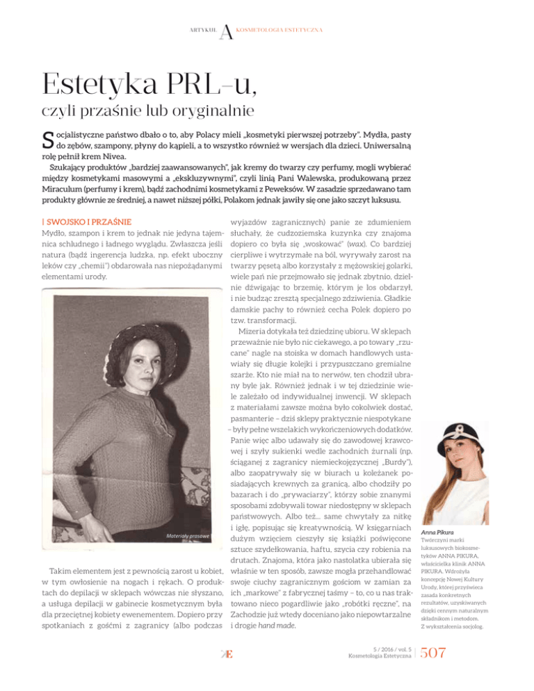 art ykuł A Kosmetologia Estet yczna Estetyka PRL-u, czyli przaśnie lub oryginalnie S ocjalistyczne państwo dbało o to, aby Polacy mieli „kosmetyki pierwszej potrzeby”. Mydła, pasty do zębów, szampony, płyny do kąpieli, a to wszystko również w wersjach dla dzieci. Uniwersalną rolę pełnił krem Nivea. Szukający produktów „bardziej zaawansowanych”, jak kremy do twarzy czy perfumy, mogli wybierać między kosmetykami masowymi a „ekskluzywnymi”, czyli linią Pani Walewska, produkowaną przez Miraculum (perfumy i krem), bądź zachodnimi kosmetykami z Peweksów. W zasadzie sprzedawano tam produkty głównie ze średniej, a nawet niższej półki, Polakom jednak jawiły się one jako szczyt luksusu. || Swojsko i przaśnie Mydło, szampon i krem to jednak nie jedyna tajemnica schludnego i ładnego wyglądu. Zwłaszcza jeśli natura (bądź ingerencja ludzka, np. efekt uboczny leków czy „chemii”) obdarowała nas niepożądanymi elementami urody. Materiały prasowe Takim elementem jest z pewnością zarost u kobiet, w tym owłosienie na nogach i rękach. O produktach do depilacji w sklepach wówczas nie słyszano, a usługa depilacji w gabinecie kosmetycznym była dla przeciętnej kobiety ewenementem. Dopiero przy spotkaniach z gośćmi z zagranicy (albo podczas wyjazdów zagranicznych) panie ze zdumieniem słuchały, że cudzoziemska kuzynka czy znajoma dopiero co była się „woskować” (wax). Co bardziej cierpliwe i wytrzymałe na ból, wyrywały zarost na twarzy pęsetą albo korzystały z mężowskiej golarki, wiele pań nie przejmowało się jednak zbytnio, dzielnie dźwigając to brzemię, którym je los obdarzył, i nie budząc zresztą specjalnego zdziwienia. Gładkie damskie pachy to również cecha Polek dopiero po tzw. transformacji. Mizeria dotykała też dziedzinę ubioru. W sklepach przeważnie nie było nic ciekawego, a po towary „rzucane” nagle na stoiska w domach handlowych ustawiały się długie kolejki i przypuszczano gremialne szarże. Kto nie miał na to nerwów, ten chodził ubrany byle jak. Również jednak i w tej dziedzinie wiele zależało od indywidualnej inwencji. W sklepach z materiałami zawsze można było cokolwiek dostać, pasmanterie – dziś sklepy praktycznie niespotykane – były pełne wszelakich wykończeniowych dodatków. Panie więc albo udawały się do zawodowej krawcowej i szyły sukienki wedle zachodnich żurnali (np. ściąganej z zagranicy niemieckojęzycznej „Burdy”), albo zaopatrywały się w biurach u koleżanek posiadających krewnych za granicą, albo chodziły po bazarach i do „prywaciarzy”, którzy sobie znanymi sposobami zdobywali towar niedostępny w sklepach państwowych. Albo też... same chwytały za nitkę i igłę, popisując się kreatywnością. W księgarniach dużym wzięciem cieszyły się książki poświęcone sztuce szydełkowania, haftu, szycia czy robienia na drutach. Znajoma, która jako nastolatka ubierała się właśnie w ten sposób, zawsze mogła przehandlować swoje ciuchy zagranicznym gościom w zamian za ich „markowe” z fabrycznej taśmy – to, co u nas traktowano nieco pogardliwie jako „robótki ręczne”, na Zachodzie już wtedy doceniano jako niepowtarzalne i drogie hand made. 5 / 2016 / vol. 5 Kosmetologia Estetyczna Anna Pikura Twórczyni marki luksusowych biokosmetyków ANNA PIKURA, właścicielka klinik ANNA PIKURA. Wdrożyła koncepcję Nowej Kultury Urody, której przyświeca zasada konkretnych rezultatów, uzyskiwanych dzięki cennym naturalnym składnikom i metodom. Z wykształcenia socjolog. 507 art ykuł A Gorzej niestety przedstawiała się sytuacja mężczyzn. Panów ubierających się w stylu hippie – którzy mogliby korzystać na krawieckich i dziewiarskich talentach żon, matek czy sióstr – nie było wielu, dla reszty pozostawały do wyboru: styl pierwszego sekretarza, czyli smutna, byle jaka marynarka, styl turystyczny, czyli koszula w kratę, bądź styl casual, czyli koszula względnie gładka, z nieodłącznym sweterkiem na wierzch w chłodniejsze dni. Kosmetologia Estet yczna gdzie nieznane i niedostępne były takie podstawowe dziś metody, jak eksfoliacja, dermabrazja, lasery, a „pielęgnacja” cery trądzikowej polegała po prostu na wyciskaniu pryszczy, zwykle jedynie pogarszały stan nieszczęśnika. Bywały oczywiście wyjątki w tej regule, czyli dermatolodzy poszukujący nowych rozwiązań – i znajdujący je. Do takich ustawiały się długie kolejki, a fama rozchodziła się szeroko. Do wrocławskiej dermatolog, przyjmującej gdzieś na Zalesiu, zjeżdżali się ludzie nawet z innych rejonów Polski. || Ważne co w głowie, nie co na głowie Materiały prasowe || Medycyna króla Ćwieczka Biada temu, kto w czasach PRL-u cierpiał na jakiekolwiek poważniejsze problemy dermatologiczne. Obecnie stosowane terapie (zresztą i dziś nie zawsze skuteczne) nie istniały, a o takich preparatach jak kolagen aktywny biologicznie, nieodzowny element walki z trądzikiem, można było tylko pomarzyć (choć to w latach osiemdziesiątych, czyli jeszcze w PRL-u, polscy uczeni podejmowali pierwsze próby jego uzyskania). Od dermatologa można było wyjść co najwyżej z maścią cynkową, która wprawdzie wysusza pryszcze, trądziku jednak nie wyleczy. Za jedyny kosmetyk przeciwtrądzikowy specjaliści uznawali często mydło siarkowo-dziegciowe. Podobno niektórym pomagało, inni jednak musieli obnosić się z ostrymi postaciami trądziku młodzieńczego. Wizyty w osiedlowych gabinetach kosmetycznych, 508 5 / 2016 / vol. 5 Kosmetologia Estetyczna Regularne wizyty u fryzjera stanowiły chyba jedyny powszechny element reżimu kosmetycznego przeciętnego Polaka, przestrzegany przez wszystkich niezależnie od wieku i płci. W przypadku panów i dzieci element ten ograniczał się do strzyżenia (u tych pierwszych w grę wchodziło jeszcze golenie), panie za to mogły wybierać i przebierać w dodatkowych możliwościach – od tlenienia