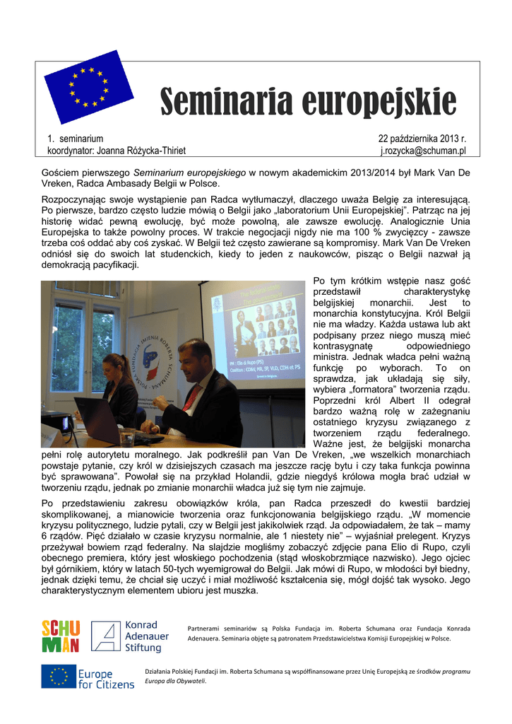 Seminaria europejskie 1. seminarium koordynator: Joanna Różycka-Thiriet 22 października 2013 r. [email protected] Gościem pierwszego Seminarium europejskiego w nowym akademickim 2013/2014 był Mark Van De Vreken, Radca Ambasady Belgii w Polsce. Rozpoczynając swoje wystąpienie pan Radca wytłumaczył, dlaczego uważa Belgię za interesującą. Po pierwsze, bardzo często ludzie mówią o Belgii jako „laboratorium Unii Europejskiej”. Patrząc na jej historię widać pewną ewolucję, być może powolną, ale zawsze ewolucję. Analogicznie Unia Europejska to także powolny proces. W trakcie negocjacji nigdy nie ma 100 % zwycięzcy - zawsze trzeba coś oddać aby coś zyskać. W Belgii też często zawierane są kompromisy. Mark Van De Vreken odniósł się do swoich lat studenckich, kiedy to jeden z naukowców, pisząc o Belgii nazwał ją demokracją pacyfikacji. Po tym krótkim wstępie nasz gość przedstawił charakterystykę belgijskiej monarchii. Jest to monarchia konstytucyjna. Król Belgii nie ma władzy. Każda ustawa lub akt podpisany przez niego muszą mieć kontrasygnatę odpowiedniego ministra. Jednak władca pełni ważną funkcję po wyborach. To on sprawdza, jak układają się siły, wybiera „formatora” tworzenia rządu. Poprzedni król Albert II odegrał bardzo ważną rolę w zażegnaniu ostatniego kryzysu związanego z tworzeniem rządu federalnego. Ważne jest, że belgijski monarcha pełni rolę autorytetu moralnego. Jak podkreślił pan Van De Vreken, „we wszelkich monarchiach powstaje pytanie, czy król w dzisiejszych czasach ma jeszcze rację bytu i czy taka funkcja powinna być sprawowana”. Powołał się na przykład Holandii, gdzie niegdyś królowa mogła brać udział w tworzeniu rządu, jednak po zmianie monarchii władca już się tym nie zajmuje. Po przedstawieniu zakresu obowiązków króla, pan Radca przeszedł do kwestii bardziej skomplikowanej, a mianowicie tworzenia oraz funkcjonowania belgijskiego rządu. „W momencie kryzysu politycznego, ludzie pytali, czy w Belgii jest jakikolwiek rząd. Ja odpowiadałem, że tak – mamy 6 rządów. Pięć działało w czasie kryzysu normalnie, ale 1 niestety nie” – wyjaśniał prelegent. Kryzys przeżywał bowiem rząd federalny. Na slajdzie mogliśmy zobaczyć zdjęcie pana Elio di Rupo, czyli obecnego premiera, który jest włoskiego pochodzenia (stąd włoskobrzmiące nazwisko). Jego ojciec był górnikiem, który w latach 50-tych wyemigrował do Belgii. Jak mówi di Rupo, w młodości był biedny, jednak dzięki temu, że chciał się uczyć i miał możliwość kształcenia się, mógł dojść tak wysoko. Jego charakterystycznym elementem ubioru jest muszka. Partnerami seminariów są Polska Fundacja im. Roberta Schumana oraz Fundacja Konrada Adenauera. Seminaria objęte są patronatem Przedstawicielstwa Komisji Europejskiej w Polsce. Działania Polskiej Fundacji im. Roberta Schumana są współfinansowane przez Unię Europejską ze środków programu Europa dla Obywateli. Charakterystyczne w rządzie belgijskim jest to, że jest on zawsze koalicyjny. Nie ma bowiem partii ogólnonarodowych (istnieją dwie sceny polityczne – walońska i flamandzka). I tak w obecnym rządzie zasiadają flamandzcy socjaliści, chadecy i liberałowie oraz walońscy socjaliści, chadecy i liberałowie (tak liczny skład gabinetu wnika z potrzeby dużej większości głosów umożliwiającej planowaną 6. reformę państwa). Rząd federalny zajmuje się polityką zagraniczną, obronną, bezpieczeństwem społecznym, sądownictwem, sprawami wewnętrznymi, finansami i budżetem. Parlament jest 2 izbowy, składa się z Izby Reprezentantów i Senatu. W Izbie Reprezentantów zasiada 150 członków wybranych bezpośrednio przez społeczeństwo wg proporcjonalnej ordynacji wyborczej. Skład Senatu jest dużo bardziej złożony (i zostanie zresztą zreformowany). Następnie przeszliśmy na szczebel regionalny – wspólnot i regionów. Zarówno rządy jak i parlamenty lokalne mają swoje kompetencje, które stale rosną. Następuje przesuniecie władzy na szczebel regionów i wspólnot. Między państwem, regionami i wspólnotami nie ma hierarchii. W zasadzie minister federalny nie może niczego nakazać albo zabronić wspólnocie czy regionowi (chyba, że chodzi o działanie wbrew ogólnobelgijskiej polityce). Ciekawe jest to, że wspólnoty oraz regiony mogą podpisywać umowy międzynarodowe. Jeden z przykładów: w 1994 roku Flandria podpisała umowę międzynarodowa z Polską. Była to zresztą pierwsza umowa międzynarodowa podpisana przez Flandrię. Tą niezależność w polityce zagranicznej widać np. w ambasadzie w Warszawie – są pracownicy reprezentujący rząd federalny i króla, ale są też przedstawiciele reprezentujący Walonię i Flandrię. Jeśli chodzi o to, kto reprezentuje Belgię w UE, zależy to od kompetencji. Jeśli posiedzenie Rady Unii Europejskiej dotyczy spraw leżących w kompetencjach federacji, to jest to np. minister spraw zagranicznych albo obrony narodowej. Jeśli kompetencje wkraczają w kompetencje regionów czy wspólnot, to wysyłają one swoich przedstawicieli (obowiązuje rotacja – każdy region/wspólnota zasiada w RUE przez 6 miesięcy). Jeśli kompetencje na siebie nachodzą, dochodzi do spotkania w MSZ i tam przedstawiciele władz lokalnych i rządu federalnego podejmują decyzję co do polityki Belgii. Belgijska federacja składa się z 3 wspólnot językowych: flamandzkiej (północ), francuskiej (południe) i niemieckiej (na wschodzie kraju). Zajmują się one językiem i wszystkim, co z językiem związane, miedzy innymi kulturą i edukacją. W Belgii mamy także 3 regiony: flamandzki (pokrywający się ze Wspólnotą Flamandzką), Walonię (która obejmuje także obszar niemieckojęzyczny) oraz Region Stołeczny Brukseli. Jeśli chodzi o kompetencje regionów to jest to gospodarka, energia, zatrudnienie oraz środowisko. Każda z tych jednostek ma swój parlam