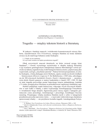 ACTA UNIVERSITATIS WRATISLAVIENSIS No 3267 Prace Literackie L Wrocław 2010 AGNIESZKA CZAJKOWSKA Akademia Jana Długosza w Częstochowie Tragedia — między tekstem historii a literaturą W jednym z bardziej znanych i wielokrotnie komentowanych wierszy Herberta, zatytułowanym Tren Fortynbrasa, następca Hamleta na tronie duńskim zwraca się do martwego bohatera sztuki Szekspira: [...] Nigdy się nie spotkamy to co po mnie zostanie nie będzie przedmiotem tragedii1. Obok oczywistych znaczeń doraźnych, na które zwracał uwagę Artur Sandauer2, i równie wyrazistego usytuowania w obrębie tradycji literackiej w jej wymiarze genologicznym (interpretacja Janusza Sławińskiego3) utwór pozwala na lekturę zogniskowaną wokół kategorii historyczności, pojmowanej jako wypowiedź, czyli gra „zmyślenia i prawdy”. Należy bowiem przypomnieć, że sztuka Szekspira, z którą dialoguje utwór Herberta, oparta została na dwóch źródłach — historycznym (Historie tragiczne F. De Belleforesta z 1569 roku, odwołujące się do XII-wiecznych łacińskich Dziejów Danii) i dramatycznym — anonimowym dziele Hamlet granym w teatrze londyńskim w latach 1587–1589. W ślad za nimi tragedia przywołuje postać bajecznego księcia jutlandzkiego Amletha z V wieku, przejętą przez literaturę za pośrednictwem zaginionej islandzkiej sagi. Herbert podejmuje wątek historyczny, włączając swych lirycznych bohaterów w nurt walki o władzę, a także wyposażając monologującego Fortynbrasa w świadomość biegu dziejów, figurowaną przez tarczę zegara i kategorie gramatyczne czasu przeszłego, teraźniejszego i przyszłego, kształtujące liryczny monolog. Przejmujący władzę morderca Hamleta myśli o sobie w kategoriach przedmiotu przyszłej opowieści, która — z racji mało widowiskowego charakteru sprawowanej władzy — nie przybierze kształtu tragedii. Autodegradacja Fortyn1 Z. Herbert, Tren Fortynbrasa, [w:] idem, Wiersze zebrane, Warszawa 1982, s. 149. Zob. B. Urbankowski, Poeta, czyli człowiek zwielokrotniony. Szkice o Zbigniewie Herbercie, Radom 2004, s. 336. 3 Zob. J. Sławiński, „Tren Fortynbrasa” Zbigniewa Herberta, [w:] Genologia polska. Wybór tekstów, wybór opracowań i wstęp E. Miodońska-Brookes, A. Kulawik, M. Tatara, Warszawa 1983. 2 Prace Literackie 50/2010 © for this edition by CNS PL50_book.indb 155 2010-12-06 12:39:42 156 AGNIESZKA CZAJKOWSKA brasa jest oczywiście przyjętą strategią dyktatora, który wie, że w życiu — inaczej niż w literaturze — liczą się nie kryształowe pojęcia, ale raczej glina ludzka i to, co się z niej uda ulepić. Nie wie natomiast — i niewiedza ta jest przedmiotem ironii odautorskiego podmiotu lirycznego — że w historii, odmiennie niż w życiu, liczą się opowieści i grający w nich główne role narrator i bohaterowie. Obraz przeszłości jest funkcją intencji przedstawiającego, a działania postaci — konsekwencją kulturowej deskrypcji lub — jak na przykład u autora Wojny galijskiej — autodeskrypcji. Świadomość Herbertowskiego „podmiotu historycznego” — w jego literackim statusie — wypracowana została w konfrontacji klasycznego wykształcenia, z jego bagażem lektur, z jednostkowym doświadczeniem historycznym, dla którego nie tyle trudno było znaleźć miejsce we wzorcowych dyskursach o przeszłości, co właśnie nieuchronność tej pozycji — pośród na przykład plemion podbijanych przez starożytnych Rzymian — stawała się problemem. W utworze Przemiany Liwiusza dysproporcja dostępnych narzędzi poznania minionego i samopoczucie podmiotu wyrażona zostaje na marginesie gimnazjalnej lektury czterech pokoleń czytelniczych: Jak czytali Liwiusza mój dziadek mój pradziadek [...] czytając dzieje Miasta ulegali złudzeniu że są Rzymianami lub potomkami Rzymian ci synowie podbitych sami ujarzmieni [...] bunt ludu — res tam foeda — budził w nich odrazę natomiast wszystkie podboje wydawały się słuszne znaczyły po prostu zwycięstwo tego co lepsze silniejsze4. Liwiusz, czytany w warunkach stabilizacji politycznej przez dziadka i pradziadka, stawał się poręczną wykładnią dla ładu świata i przydatnym podręcznikiem do wychowywania lojalnych galicyjskich obywateli Austro-Węgier. Dopiero wydarzenia I i II wojny światowej doprowadziły do lektury rzymskiego historiografa „przeciw niemu” — hermeneutyka podejrzeń stała się metodologią, przy pomocy której pokolenie ojca i syna zyskuje autonomiczną dziejową świadomość. Nadbudowana nad doświadczeniem refleksja przestaje mieścić się w stylistyce rzymskiego historiografa, a konsekwencją „protokołu rozbieżności” staje się poczucie wydziedziczenia z tradycji, połączone z pojmowanym jednocześnie jako stygmat i szansa, pragnieniem zbudowania własnej podmiotowości. Gatunek tragedii, wplątany w Herbertowską wizję historii, powraca w wierszu Posłaniec, który w autorskim wyborze z 1998 roku umieszczony został jako drugi, choć chronologia sugerowałaby — z racji opublikowania go w 1983 roku — miejsce odleglejsze. Utwór brzmi jak zadana lekcja Poetyki Arystotelesa — przywołując kluczową kwalifikację gatunkową, wskrzesza kategorie oczysz4 Z. Herbert, Przemiany Liwiusza, [w:] idem, Wiersze zebrane, oprac. R. Krynicki, Kraków 2008, s. 537. Prace Literackie 50/2010 © for this edition by CNS PL50_book.indb 156 2010-12-06 12:39:42 Tragedia — między tekstem historii a literaturą 157 czenia, litości i trwogi, przypomina elementy konstrukcyjne starożytnych utworów (epilog), wyposażenie aktorów (maska), a także właściwych jej bohaterów (posłaniec, król, bogowie) i odbiorców (widzowie). Czyni to po to, by wykazać, że wydarzenia, w których jedynym znanym z imienia własnego uczestnikiem, rodzajem współczesnego fatum jest „Wschód”, w żadnej mierze nie mogą się równać z kształtem fabuły, która ma prowadzić do oczyszczającego działania antycznego ga