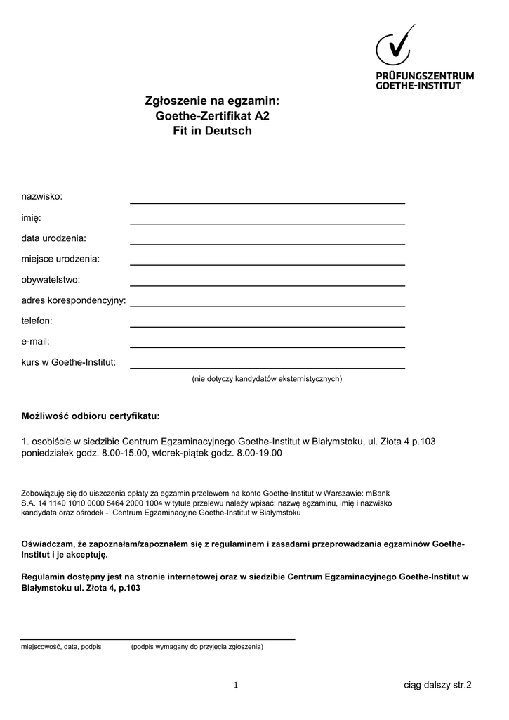 Zgłoszenie na egzamin: Goethe-Zertifikat A2 Fit in Deutsch nazwisko: imię: data urodzenia: miejsce urodzenia: obywatelstwo: adres korespondencyjny: telefon: e-mail: kurs w Goethe-Institut: (nie dotyczy kandydatów eksternistycznych) Możliwość odbioru certyfikatu: 1. osobiście w siedzibie Centrum Egzaminacyjnego Goethe-Institut w Białymstoku, ul. Złota 4 p.103 poniedziałek godz. 8.00-15.00, wtorek-piątek godz. 8.00-19.00 Zobowiązuję się do uiszczenia opłaty za egzamin przelewem na konto Goethe-Institut w Warszawie: mBank S.A. 14 1140 1010 0000 5464 2000 1004 w tytule przelewu należy wpisać: nazwę egzaminu, imię i nazwisko kandydata oraz ośrodek - Centrum Egzaminacyjne Goethe-Institut w Białymstoku Oświadczam, że zapoznałam/zapoznałem się z regulaminem i zasadami przeprowadzania egzaminów GoetheInstitut i je akceptuję. Regulamin dostępny jest na stronie internetowej oraz w siedzibie Centrum Egzaminacyjnego Goethe-Institut w Białymstoku ul. Złota 4, p.103 miejscowość, data, podpis (podpis wymagany do przyjęcia zgłoszenia) 1 ciąg dalszy str.2 Oświadczenie o wyrażeniu zgody na przetwarzanie danych osobowych Podpisując niniejsze oświadczenie, wyrażam zgodę na przekazanie przez Goethe-Institut moich danych osobowych, udostępnionych przeze mnie podczas rejestracji, do centralnej bazy danych klientów Goethe-Institut e.V. (pol.: stowarzyszenie zarejestrowane) z siedzibą w Monachium / Niemcy (Centrala), oraz na dokonanie scalenia tych informacji ze znajdującymi się tam ewentualnymi innymi danymi dotyczącymi mojej osoby. Ponadto wyrażam zgodę na wykorzystywanie moich danych przez Goethe-Institut oraz Centralę do przeprowadzania badań rynkowych oraz w celach reklamowych i marketingowych dotyczących każdorazowo oferty Goethe-Institut, w szczególności po to, aby dostarczać na podane przeze mnie dane adresowe przez pocztę lub — o ile wyraziłem/łam takie życzenie — także telefonicznie, pocztą elektroniczną informacje, np. dotyczące nowej oferty kursów Goethe-Institut. W celu kontroli autentyczności wystawianych duplikatów zaświadczeń zgadzam się ponadto na przekazywanie do Centrali, przechowywanie tam w centralnym archiwum egzaminów (przez maksymalnie 10 lat), oraz przetwarzanie danych dotyczących egzaminów, w których brałem/łam udział. Jeżeli są to informacje dotyczące egzaminów upoważniających do osiedlenia się w Niemczech małżonka w ramach łączenia rodzin, wyrażam zgodę na to, żeby Centrala na żądanie niemieckich urzędów, potwierdziła autentyczność świadectwa przedłożonego przeze mnie urzędowi. Moje dane nie będą przez Goethe-Institut wykorzystywane lub przekazywane osobom trzecim w celach innych niż wymienione powyżej w treści oświadczenia, chyba że w odniesieniu do tych danych istnieje uzasadnione podejrzenie popełnienia nadużycia. Jest mi wiadome, że w każdej chwili mogę sprzeciwić się wykorzystywaniu moich danych w celu badania rynku a także w celach reklamowych i marketingowych. miejscowość, data, podpis (podpis wymagany do przyjęcia zgłoszenia) TAK, chcę otrzymywać informacje przez e-mail/telefon. miejscowość, data, podpis (podpis niewymagany do przyjęcia zgłoszenia) PRAWO SPRZECIWU Ze wspomnianego wyżej prawa sprzeciwu może skorzystać Pani/Pan teraz (poniżej) lub w każdej innej chwili. Sprzeciwiam się przetwarzaniu i wykorzystywaniu moich danych osobowych w celach reklamowych i marketingowych. miejscowość, data, podpis (podpis niewymagany do przyjęcia zgłoszenia) 2