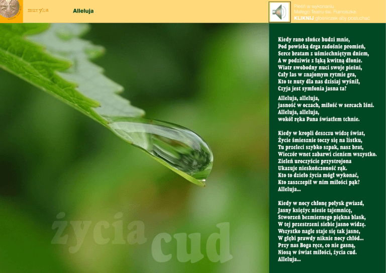 muzyka Alleluja Pieśń w wykonaniu Małego Teatru św. Franciszka. KLIKNIJ głośniczek aby posłuchać Kiedy rano słońce budzi mnie, Pod powieką drga radośnie promień, Serce bratam z uśmiechniętym dniem, A w podziwie z łąką kwitną dłonie. Wiatr swobodny nuci swoje pieśni, Cały las w znajomym rytmie gra, Kto te nuty dla nas dzisiaj wyśnił, Czyja jest symfonia jasna ta? Alleluja, alleluja, jasność w oczach, miłość w sercach lśni. Alleluja, alleluja, wokół ręka Pana światłem tchnie. Kiedy w kropli deszczu widzę świat, Życie śmiesznie toczy się na listku, Tu przeleci szybko szpak, nasz brat, Wieczór wnet zabarwi cieniem wszystko. Zieleń uroczyście przystrojona Ukazuje nieskończoność rąk. Kto to dzieło życia mógł wykonać, Kto zaszczepił w nim miłości pąk? Alleluja... życia cud Kiedy w nocy chłonę połysk gwiazd, Jasny księżyc niesie tajemnicę, Stworzeń bezmiernego piękna blask, W tej przestrzeni siebie jasno widzę. Wszystko nagle staje się tak jasne, W głębi prawdy niknie nocy chłód... Przy nas Boga ręce, co nie gasną, Niosą w świat miłości, życia cud. Alleluja...