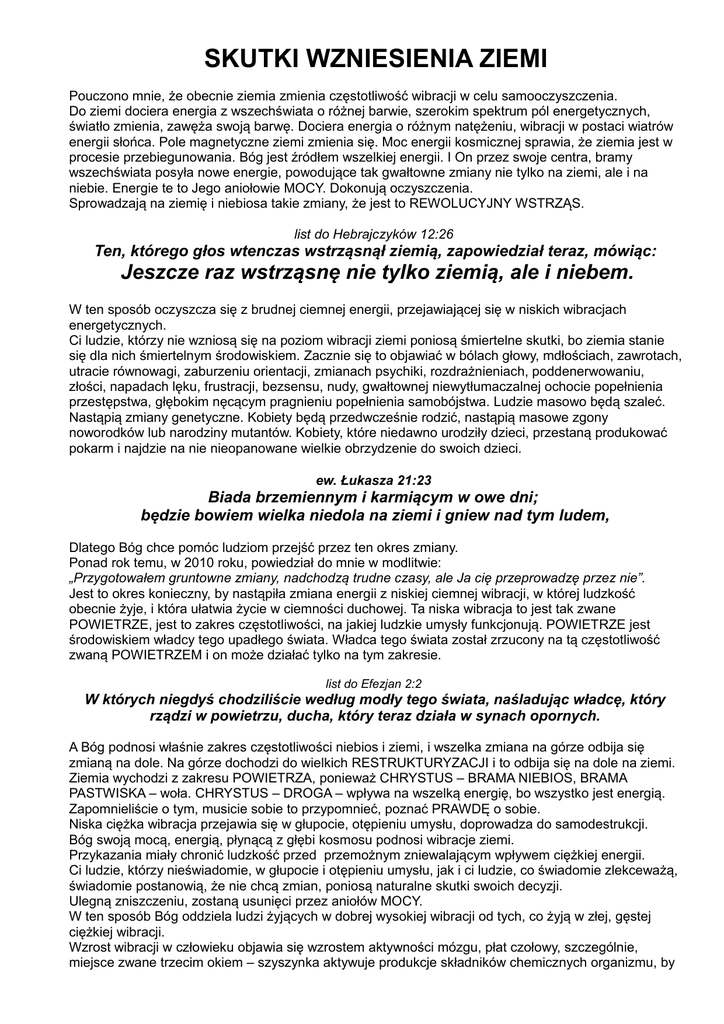 SKUTKI WZNIESIENIA ZIEMI Pouczono mnie, że obecnie ziemia zmienia częstotliwość wibracji w celu samooczyszczenia. Do ziemi dociera energia z wszechświata o różnej barwie, szerokim spektrum pól energetycznych, światło zmienia, zawęża swoją barwę. Dociera energia o różnym natężeniu, wibracji w postaci wiatrów energii słońca. Pole magnetyczne ziemi zmienia się. Moc energii kosmicznej sprawia, że ziemia jest w procesie przebiegunowania. Bóg jest źródłem wszelkiej energii. I On przez swoje centra, bramy wszechświata posyła nowe energie, powodujące tak gwałtowne zmiany nie tylko na ziemi, ale i na niebie. Energie te to Jego aniołowie MOCY. Dokonują oczyszczenia. Sprowadzają na ziemię i niebiosa takie zmiany, że jest to REWOLUCYJNY WSTRZĄS. list do Hebrajczyków 12:26 Ten, którego głos wtenczas wstrząsnął ziemią, zapowiedział teraz, mówiąc: Jeszcze raz wstrząsnę nie tylko ziemią, ale i niebem. W ten sposób oczyszcza się z brudnej ciemnej energii, przejawiającej się w niskich wibracjach energetycznych. Ci ludzie, którzy nie wzniosą się na poziom wibracji ziemi poniosą śmiertelne skutki, bo ziemia stanie się dla nich śmiertelnym środowiskiem. Zacznie się to objawiać w bólach głowy, mdłościach, zawrotach, utracie równowagi, zaburzeniu orientacji, zmianach psychiki, rozdrażnieniach, poddenerwowaniu, złości, napadach lęku, frustracji, bezsensu, nudy, gwałtownej niewytłumaczalnej ochocie popełnienia przestępstwa, głębokim nęcącym pragnieniu popełnienia samobójstwa. Ludzie masowo będą szaleć. Nastąpią zmiany genetyczne. Kobiety będą przedwcześnie rodzić, nastąpią masowe zgony noworodków lub narodziny mutantów. Kobiety, które niedawno urodziły dzieci, przestaną produkować pokarm i najdzie na nie nieopanowane wielkie obrzydzenie do swoich dzieci. ew. Łukasza 21:23 Biada brzemiennym i karmiącym w owe dni; będzie bowiem wielka niedola na ziemi i gniew nad tym ludem, Dlatego Bóg chce pomóc ludziom przejść przez ten okres zmiany. Ponad rok temu, w 2010 roku, powiedział do mnie w modlitwie: „Przygotowałem gruntowne zmiany, nadchodzą trudne czasy, ale Ja cię przeprowadzę przez nie”. Jest to okres konieczny, by nastąpiła zmiana energii z niskiej ciemnej wibracji, w której ludzkość obecnie żyje, i która ułatwia życie w ciemności duchowej. Ta niska wibracja to jest tak zwane POWIETRZE, jest to zakres częstotliwości, na jakiej ludzkie umysły funkcjonują. POWIETRZE jest środowiskiem władcy tego upadłego świata. Władca tego świata został zrzucony na tą częstotliwość zwaną POWIETRZEM i on może działać tylko na tym zakresie. list do Efezjan 2:2 W których niegdyś chodziliście według modły tego świata, naśladując władcę, który rządzi w powietrzu, ducha, który teraz działa w synach opornych. A Bóg podnosi właśnie zakres częstotliwości niebios i ziemi, i wszelka zmiana na górze odbija się zmianą na dole. Na górze dochodzi do wielkich RESTRUKTURYZACJI i to odbija się na dole na ziemi. Ziemia wychodzi z zakresu POWIETRZA, ponieważ CHRYSTUS – BRAMA NIEBIOS, BRAMA PASTWISKA – woła. CHRYSTUS – DROGA – wpływa na wszelką energię, bo wszystko jest energią. Zapomnieliście o tym, musicie sobie to przypomnieć, poznać PRAWDĘ o sobie. Niska ciężka wibracja przejawia się w głupocie, otępieniu umysłu, doprowadza do samodestrukcji. Bóg swoją mocą, energią, płynącą z głębi kosmosu podnosi wibracje ziemi. Przykazania miały chronić ludzkość przed przemożnym zniewalającym wpływem ciężkiej energii. Ci ludzie, którzy nieświadomie, w głupocie i otępieniu umysłu, jak i ci ludzie, co świadomie zlekceważą, świadomie postanowią, że nie chcą zmian, poniosą naturalne skutki swoich decyzji. Ulegną zniszczeniu, zostaną usunięci przez aniołów MOCY. W ten sposób Bóg oddziela ludzi żyjących w dobrej wysokiej wibracji od tych, co żyją w złej, gęstej ciężkiej wibracji. Wzrost wibracji w człowieku objawia się wzrostem aktywności mózgu, płat czołowy, szczególnie, miejsce zwane trzecim okiem – szyszynka aktywuje produkcje składników chemicznych organizmu, by wzmocnić organizm połączony z naszym duchem i duszą. Szyszynka uruchamia energetyczne pole ochronne w koło człowieka, powstaje tzw. znak na czole. Ci, co będą mieli wysokie wibracje, znak na czole, nic złego nie doświadczą, wierny PRAWDOMÓWNY BÓG przeprowadzi ich przez ten okres. Objawienie Jana 7:2 Widziałem też innego anioła wstępującego od wschodu słońca, który miał pieczęć Boga żywego i który zawołał głosem donośnym na czterech aniołów, którym zezwolono wyrządzić szkodę ziemi i morzu, mówiąc: 7:3 Nie wyrządźcie szkody ani ziemi, ani morzu, ani drzewom, dopóki nie opatrzymy pieczęcią sług Boga naszego na czołach ich. To jest tak samo, jak wkładamy do mikroweli mrożonki i włączamy kuchenkę, i następuje wzrost wibracji energii tak, że wydzielająca się energia rozgrzewa mrożonki. Ich stan, w jakim są ulega zmianie, roztapiają się, bo nie nadążają ze zmianą częstotliwości energii. Nie jesteśmy pozostawieni samym sobie na żywioły wszechświata. Bóg nas wspiera, On jest wierny i pomocny. Dlatego posyła swoje MOCE, wielkie i silne anioły, by nam służyły nauką, radą, ostrzeżeniami, by wprowadzić nas na te same wibracje, co wibruje ziemia. By zmieniający się klimat ziemski i zmiany promieniowania kosmicznego nie wyrządzały nam krzywdy. Bóg nie czyni nic, jeśli wcześniej nie ostrzeże, takie jest Jego prawo i to właśnie czyni obecnie przez przekaz anielski. Ks. Amosa 3:7 Zaiste, nie czyni Wszechmogący Pan nic, jeżeli nie objawił swojego planu swoim sługom, prorokom. Właśnie ten plan został mi pokazany i przekazuję go Wam. Uważajcie, byście nie drwili, nie lekceważyli nadchodzących zmian i nie zostali odrzuceni. W ten sposób Bóg czyni różnice pomiędzy tymi, którzy mu