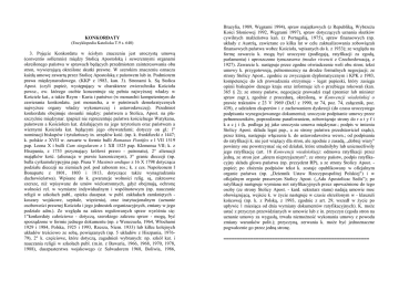 KONKORDATY (Encyklopedia Katolicka T.9 s. 640) 3. Poj cie Konkordatu w cis!ym znaczeniu jest uroczyst$ umow$ (conventio sollemnis) mi dzy Stolic$ Apostolsk$ i suwerennymi organami okre lonego pa)stwa w sprawach b d$cych przedmiotem zainteresowania obu stron, wywieraj$c$ okre lone skutki prawne. W szerokim znaczeniu oznacza ka.d$ umow zawart$ przez Stolic Apostolsk$ z pa)stwem lub in. Podmiotem prawa mi dzynarodowego. (KKP z 1983, kan. 3). Stronami k. S$ Stolica Apost. (czyli papie., wyst puj$cy w charakterze zwierzchnika Ko cio!a powsz., ew. którego osobie koncentruje si pe!nia najwy.szej w!adzy w Ko ciele kat., a tak.e Rzym - Kuria i pa)stwo (w monarchii kompetentnym do zawierania konkordatu. jest monarcha, a w pa)stwach demokratycznych najwy.sze organy w!adzy wykonawczej i ustawodawczej). Przedmiot konkordatu obejmuje stosunki mi dzy: pa)stwem a Stolica, Apost. na p!aszczy5nie mi dzynar. (papie. nie reprezentuje pa)stwa ko cielnego Watykanu, pa)stwem a Ko cio!em kat. dzia!aj$cym na jego terytorium oraz pa)stwem a wiernymi Ko cio!a kat. b d$cymi jego obywatelami; dotyczy on g!.: l" nominacji biskupów i tytulariuszy in. urz dów ko 8. (np. k. frankfurcki z 1447; k. polskie z XVII w. zawarte w formie bulli Romanus Pontifex z l VII 1519 pap. Leona X i bulli Cum singularem z 1 XII 1525 pap. Klemensa VII; k. z Hiszpania, z 1753 przyznaj$cy królowi prawo - patronatu), 2° alienacji maj$tków ko 8. (alienacja w prawie kanonicznym), 3° granic diecezji (np. bulla cyrkumskrypcyjna pap. Piusa V Maximis undique z 16 X 1798 dotycz$ca podzia!u diecezji na ziemiach pol. pod zaborem ros.; k. z ces. Napoleonem I Bonaparte z 1801, 1803 i 1813, dotycz$ce tak.e wynagradzania duchowie)stwa). Wpisane do k. gwarancje wolno ci relig. s$, zakresowe szersze, ni. wpisywane do umów wielostronnych, gdy. obejmuj$, ochron wolno ci rel. w wymiarze indywidualnym i wspólnotowym (np. nauczanie religii w szko!ach publ., opieka duszpast. w publ. zak!adach zamkni tych koszary wojskowe, szpitale, wi zienia), oraz instytucjonalnym (uznanie osobowo ci prawnej Ko cio!a i jego jednostek organizacyjnych, zmiany w jego podziale adm.). Ze wzgl du na zakres regulowanych spraw wyró.nia si : 1"konkordaty ca!o ciowe - dotycz$, szerokiego zakresu spraw - mog$, by8 sporz$dzone w formie jednego dokumentu (np. z Wenezuela, 1964, W!ochami 1929 i 1984, Polska, 1925 i 1993, Rzesza, Niem. 1933) lub kilku kolejnych uk!adów tre ciowo ze sob$, powi$zanych (np. 5 uk!adów z Hiszpania, 197679), 2" k. cz ciowe, które dotycz$, zagadnie) wybranych: np. szkó! kat. i nauczania religii w szko!ach publ. (m.in. z Bawaria, 1966, 1968, 1970, 1978, 1988), duszpasterstwa wojskowego (z Salwadorem 1968, Boliwia, 1986, Brazylia, 1989, W grami 1994), spraw maj$tkowych (z Republik$, Wybrze.a Ko ci S!oniowej 1992, W grami 1997), spraw dotycz$cych uznania skutków cywilnych ma!.e)stwa ka). (z Portugali$, 1975), spraw finansowych (np. uk!ady z Austri$, zawierane co kilka lat w celu zaktualizowania zobowi$za) finansowych pa)stwa wobec Ko cio!a, wpisanych do k. z 1933); ze wzgl du na form zawarcia k. mog$ by8 uroczyste (podlegaj$, ratyfikacji za zgod$, parlamentu) i uproszczone tymczasowe (modus vivencii z Czechos!owacj$, z 1927). Zawarcie k. nast puje przez zgodne o wiadczenie woli obu stron; tekst umowy k. przygotowuj$, pe!nomocnicy na drodze formalnych negocjacji; ze strony Stolicy Apost., zgodnie ze zwyczajem dyplomatycznym i KPK z 1983, kompetencje do ich prowadzenia otrzymuje - legat papieski, który zasi ga opinii biskupów danego kraju oraz informuje ich o przebiegu rokowa) (kan. 365 § 2); ze strony pa)stw, negocjacje prowadzi rz$d (premier lub minister spraw zagr.), zgodnie z procedur$, okre lon$, w Konwencji wiede skiej o prawie traktatów z 23 V 1969 (DzU z 1990, nr 74, poz. 74, za!$cznik, poz. 439), z udzia!em ekspertów i z zachowaniem dyskrecji (do czasu uroczystego podpisania wynegocjowanego dokumentu); uroczyste podpisanie umowy przez pe!nomocników, poprzedzone parafowaniem, zobowi$zuje strony do r a t y f i k a c j i (k. podlega jej jako uroczysta umowa mi dzynar.; podpis w imieniu Stolicy Apost. sk!ada legat pap., a ze strony pa)stwa przedstawiciel rz$du), przez któr$, nast puje w!$czenie k. do ustawodawstwa wewn.; od podpisania do ratyfikacji k. nie jest wi$.$cy dla stron, ale zgodnie z zasad$, „dobrej wiary" powinny one powstrzyma8 si od dzia!a), które utrudni!yby lub uniemo.liwi!y jego ratyfikacj (art. 18 Konwencji wiede skiej); odmowa ratyfikacji przez jedn$, ze stron jest „aktem nieprzyjaznym"; ze strony pa)stw, podpis ratyfikacyjny sk!ada g!owa pa)stwa (np. prezydent RP), a ze strony Stolicy Apost. papie.; po z!o.eniu podpisów tekst k. zostaje opublikowany w oficjalnym organie pa)stwa (np. „Dziennik Ustaw Rzeczypospolitej Polskiej") i w oficjalnym organie prasowym Stolicy Apost. („Ada Apostolicac Sedis"); po ratyfikacji nast puje wymiana not ratyfikacyjnych przez upowa.nione do tego osoby (ze strony Stolicy Apost. - kard. sekretarz stanu) nadaj$ umowie moc obowi$zuj$c$, wej cie k. w .ycie nast puje w czasie okre lonym w - klauzuli ko)cowej (np. k. z Polsk$, z 1993, zgodnie z art. 29, wszed! w .ycie po up!ywie 1 miesi$ca od dnia wymiany dokumentów ratyfikacyjnych). K. mo.e usta8 z przyczyn przewidzianych w umowie lub z in. przyczyn (zgoda stron na uznanie umowy za wygas!$, trwa!a niemo.no 8 wykonania umowy z powodu zmiany warunków polit.); przyczyn$, zerwania k. mo.e by8 jednoznaczne pogwa!cenie go przez jedn$ stron . ====================================================== KONKORDATY Z RZECZYPOSPOLIT POLSK Za cznik nr l Konkordat mi!dzy Stolic Apostolsk a Rzeczypospolit Polsk , podpisany w Rzymie dnia 10 lutego 1925 r. (Ratyfikowany zgodnie z ustaw$ z 23 kwietnia 1925 r. Dz. U. z 1925 r. nr 47, p 324). W Imieniu Rzeczypospolitej Polskiej my, Stanis!aw Wojciechowski, prezydent Rzeczypospolitej Polskiej, wszem wobec i ka.demu z osobna, komu o tym wiedzie8 nale.y, wiadomym czynimy: W dniu dziesi$tym lutego tysi$c dziewi 8set d