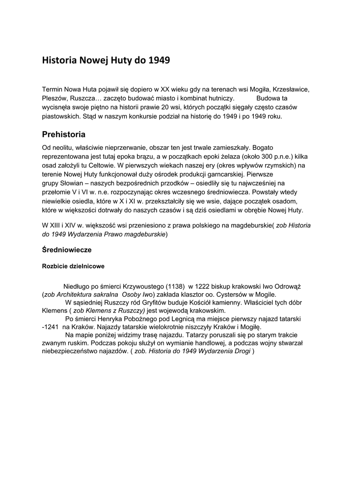 Historia Nowej Huty do 1949 Termin Nowa Huta pojawił się dopiero w XX wieku gdy na terenach wsi Mogiła, Krzesławice, Pleszów, Ruszcza… zaczęto budować miasto i kombinat hutniczy. Budowa ta wycisnęła swoje piętno na historii prawie 20 wsi, których początki sięgały często czasów piastowskich. Stąd w naszym konkursie podział na historię do 1949 i po 1949 roku. Prehistoria Od neolitu, właściwie nieprzerwanie, obszar ten jest trwale zamieszkały. Bogato reprezentowana jest tutaj epoka brązu, a w początkach epoki żelaza (około 300 p.n.e.) kilka osad założyli tu Celtowie. W pierwszych wiekach naszej ery (okres wpływów rzymskich) na terenie Nowej Huty funkcjonował duży ośrodek produkcji garncarskiej. Pierwsze grupy Słowian – naszych bezpośrednich przodków – osiedliły się tu najwcześniej na przełomie V i VI w. n.e. rozpoczynając okres wczesnego średniowiecza. Powstały wtedy niewielkie osiedla, które w X i XI w. przekształciły się we wsie, dające początek osadom, które w większości dotrwały do naszych czasów i są dziś osiedlami w obrębie Nowej Huty. W XIII i XIV w. większość wsi przeniesiono z prawa polskiego na magdeburskie( zob Historia do 1949 Wydarzenia Prawo magdeburskie) Średniowiecze Rozbicie dzielnicowe Niedługo po śmierci Krzywoustego (1138) w 1222 biskup krakowski Iwo Odrowąż ( zob Architektura sakralna Osoby Iw o) zakłada klasztor oo. Cystersów w Mogile. W sąsiedniej Ruszczy ród Gryfitów buduje Kościół kamienny. Właściciel tych dóbr Klemens ( zob Klemens z Ruszczy) jest wojewodą krakowskim. Po śmierci Henryka Pobożnego pod Legnicą ma miejsce pierwszy najazd tatarski 1241 na Kraków. Najazdy tatarskie wielokrotnie niszczyły Kraków i Mogiłę. Na mapie poniżej widzimy trasę najazdu. Tatarzy poruszali się po starym trakcie zwanym ruskim. Podczas pokoju służył on wymianie handlowej, a podczas wojny stwarzał niebezpieczeństwo najazdów. ( zob. Historia do 1949 Wydarzenia Drogi ) Na terenie Małopolski toczą się walki o spadek po Henryku. Po stronie Bolesława Wstydliwego opowiedział się Klemens z Ruszczy. ( zob Osoby Klemens z Ruszczy ) Po bitwie pod Suchodołem władzę nad dzielnicą obejmuje Bolesław. W XIV w. (1345) na terenie Czyżyn stacjonują wojska Jana Luksemburskiego, który oblegał Kraków. Po jego wyparciu przybył do Mogiły król Kazimierz Wielki i polecił ukończyć prace budowlane, ciągnące się już od ponad stulecia. W XV w.klasztor w Mogile jest najczęściej odwiedzanym miejscem pielgrzymkowym w Polsce. XVI wiek W tym wieku następuje rozwój Krakowa, a przy okazji okolicy. Rozwija się przemysł papierniczy.W Mogile działa papiernia, która wykorzystuje robocze koryto Dłubni. Rozwija się również przemysł metalurgiczny. W Mogile, w dobrach oo. cystersów Jan Turzo ( zob Historia do 1949 Osoby Turzonowie) zakłada hutę miedzi. Działa ona tu w latach 14691529. W Mogile rozwinął się również ośrodek malarstwa miniaturowego. Jego najwybitniejszym przedstawicielem był Stanisław Samostrzelnik ( zob. Osoby Stanisław), który iluminował modlitewniki dla króla Zygmunta Starego i królowej Bony. Rozwój opactwa w Mogile był możliwy dzięki opatom takim Jak Erazm Ciołek, który przyjaźnił się z Erazmem z Rotterdamu, Marcin Białobrzeski i Paweł Piasecki. Wolne elekcje W czasach nowożytnych tereny dzisiejszej Nowej Huty były miejscem kilku ważnych wydarzeń historycznych. W kwietniu 1576 r. zatrzymał się tutaj na jakiś czas Stefan Batory zdążający na koronację do Krakowa ( zob. Historia do 1949 Wydarzenia Krół Stefan Batory w Mogil e) .Po śmierci tego władcy, w 1587 r., gdy wybuchła wojna o koronę polską, stacjonował w Mogile ze swoimi wojskami Maksymilian Habsburg. ( zob. Historia do 1949 Wydarzenia Maksymilian Habsburg w Mogile ) Zaś w 1657 r. na Suchych Stawach doszło do bitwy, w której wojska szwedzkie pobiły polskie oddziały szykujące się do oblężenia Krakowa. Rozbiory Pierwszy i drugi rozbiór nie przyniósł zmian, chociaż Kraków i wsie nad Wisłą stały się terenami nadgranicznymi. W czerwcu 1787 odwiedził Kraków król Stanisław August Poniatowski. Przybył ze spotkania z carycą Katarzyną. Przed wjazdem do miasta zatrzymał się u Eliasza Wodzickiego w Kościelnikach.( zob. Historia do 1949 Wydarzenia król w Kościelnikach) Powstanie kościuszkowskie Przez tereny obecnej Nowej Huty maszerował pod Racławice Tadeusz Kościuszko ze swoim wojskiem, zaopatrując się po drodze w ludzi, pieniądze i broń, przekazane mu m.in. przez klasztor w Mogile i rodzinę Czartoryskich z Pleszowa . ( zob. Historia do 1949 Wydarzenia Powstanie kościuszkowskie 15 czerwca 1794 r., Kraków zostaje zajęty przez wojska pruskie, a w styczniu 1796 r. wojska pruskie opuszczają Kraków i wkraczają wojska austriackie. Po trzecim rozbiorze w 1795 roku ziemie do Wisły znalazły się w zaborze austriackim tzw. Nowej Galicji. W 1805 roku wybuchła wojna Francji z tzw. trzecią Koalicją. W listopadzie przemaszerowały przez Kraków wojska carskie. W grudniu ( 2.XII, 1805) miała miejsce pod Austerlitz (obecnie Slavkov) w pobliżu Brna na Morawach bitwa nazywana też bitwą trzech cesarzy przegrana przez Austriaków i Rosjan. 10 grudnia przejechał po cichu przez Kraków car Aleksander I. ( zob. Historia do 1949 Wydarzenia car Aleksander) ) Po pokoju w Peszburgu ( Bratysławie ) Austria zachowała neutralność. Tymczasem po kolejnej wojnie Napoleona z Prusami podpisano pokój w Tylży . W 1807 powstaje księstwo warszawskie. Gdy w 1809 rozpoczyna się kolejna wojna Austriacy wkraczają na teren Księstwa warszawskiego. Po bitwie pod Raszynem wojska ks. Józefa Poniatowskiego zajmują tereny Nowej Galicji. Kolejna klęska Austriaków na Morawach pod Wagram przynosi rozkaz wycofania się wojsk austriackich z Galicji i Krakowa. W lipcu ks. Józef kwateruje na terenach Prądnika Czerwonego. Po pokoju w Schonbrun Nowa Galicja weszła w skład