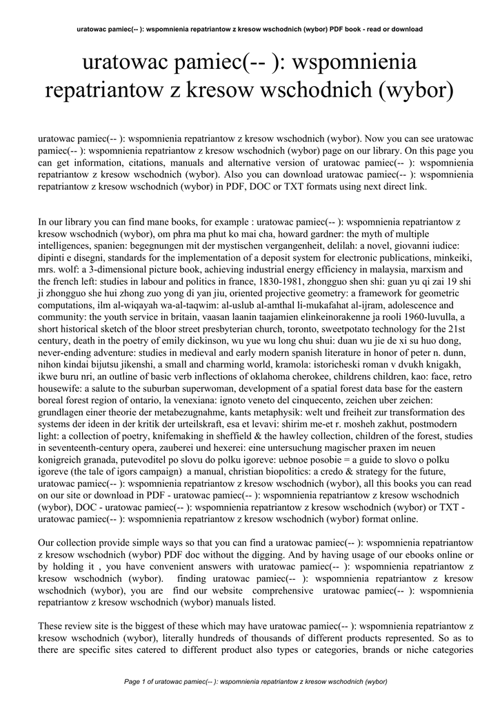 uratowac pamiec(-- ): wspomnienia repatriantow z kresow wschodnich (wybor) PDF book - read or download uratowac pamiec(-- ): wspomnienia repatriantow z kresow wschodnich (wybor) uratowac pamiec(-- ): wspomnienia repatriantow z kresow wschodnich (wybor). Now you can see uratowac pamiec(-- ): wspomnienia repatriantow z kresow wschodnich (wybor) page on our library. On this page you can get information, citations, manuals and alternative version of uratowac pamiec(-- ): wspomnienia repatriantow z kresow wschodnich (wybor). Also you can download uratowac pamiec(-- ): wspomnienia repatriantow z kresow wschodnich (wybor) in PDF, DOC or TXT formats using next direct link. In our library you can find mane books, for example : uratowac pamiec(-- ): wspomnienia repatriantow z kresow wschodnich (wybor), om phra ma phut ko mai cha, howard gardner: the myth of multiple intelligences, spanien: begegnungen mit der mystischen vergangenheit, delilah: a novel, giovanni iudice: dipinti e disegni, standards for the implementation of a deposit system for electronic publications, minkeiki, mrs. wolf: a 3-dimensional picture book, achieving industrial energy efficiency in malaysia, marxism and the french left: studies in labour and politics in france, 1830-1981, zhongguo shen shi: guan yu qi zai 19 shi ji zhongguo she hui zhong zuo yong di yan jiu, oriented projective geometry: a framework for geometric computations, ilm al-wiqayah wa-al-taqwim: al-uslub al-amthal li-mukafahat al-ijram, adolescence and community: the youth service in britain, vaasan laanin taajamien elinkeinorakenne ja rooli 1960-luvulla, a short historical sketch of the bloor street presbyterian church, toronto, sweetpotato technology for the 21st century, death in the poetry of emily dickinson, wu yue wu long chu shui: duan wu jie de xi su huo dong, never-ending adventure: studies in medieval and early modern spanish literature in honor of peter n. dunn, nihon kindai bijutsu jikenshi, a small and charming world, kramola: istoricheski roman v dvukh knigakh, ikwe buru nri, an outline of basic verb inflections of oklahoma cherokee, childrens children, kao: face, retro housewife: a salute to the suburban superwoman, development of a spatial forest data base for the eastern boreal forest region of ontario, la venexiana: ignoto veneto del cinquecento, zeichen uber zeichen: grundlagen einer theorie der metabezugnahme, kants metaphysik: welt und freiheit zur transformation des systems der ideen in der kritik der urteilskraft, esa et levavi: shirim me-et r. mosheh zakhut, postmodern light: a collection of poetry, knifemaking in sheffield & the hawley collection, children of the forest, studies in seventeenth-century opera, zauberei und hexerei: eine untersuchung magischer praxen im neuen konigreich granada, putevoditel po slovu do polku igoreve: uebnoe posobie = a guide to slovo o polku igoreve (the tale of igors campaign) a manual, christian biopolitics: a credo & strategy for the future, uratowac pamiec(-- ): wspomnienia repatriantow z kresow wschodnich (wybor), all this books you can read on our site or download in PDF - uratowac pamiec(-- ): wspomnienia repatriantow z kresow wschodnich (wybor), DOC - uratowac pamiec(-- ): wspomnienia repatriantow z kresow wschodnich (wybor) or TXT uratowac pamiec(-- ): wspomnienia repatriantow z kresow wschodnich (wybor) format online. Our collection provide simple ways so that you can find a uratowac pamiec(-- ): wspomnienia repatriantow z kresow wschodnich (wybor) PDF doc without the digging. And by having usage of our ebooks online or by holding it , you have convenient answers with uratowac pamiec(-- ): wspomnienia repatriantow z kresow wschodnich (wybor). finding uratowac pamiec(-- ): wspomnienia repatriantow z kresow wschodnich (wybor), you are find our website comprehensive uratowac pamiec(-- ): wspomnienia repatriantow z kresow wschodnich (wybor) manuals listed. These review site is the biggest of these which may have uratowac pamiec(-- ): wspomnienia repatriantow z kresow wschodnich (wybor), literally hundreds of thousands of different products represented. So as to there are specific sites catered to different product also types or categories, brands or niche categories Page 1 of uratowac pamiec(-- ): wspomnienia repatriantow z kresow wschodnich (wybor) uratowac pamiec(-- ): wspomnienia repatriantow z kresow wschodnich (wybor) PDF book - read or download related to uratowac pamiec(-- ): wspomnienia repatriantow z kresow wschodnich (wybor). So depending on what exactly you are searching, you will be able to choose ebooks uratowac pamiec(-- ): wspomnienia repatriantow z kresow wschodnich (wybor) to fit your own needs, uratowac pamiec(-- ): wspomnienia repatriantow z kresow wschodnich (wybor). Page 2 of uratowac pamiec(-- ): wspomnienia repatriantow z kresow wschodnich (wybor)