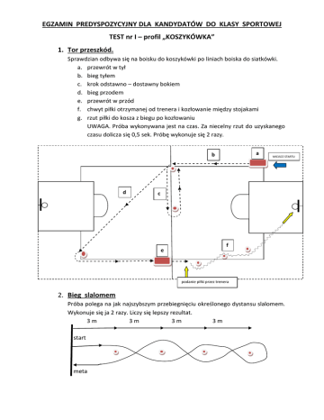 EGZAMIN PREDYSPOZYCYJNY DLA KANDYDATÓW DO KLASY SPORTOWEJ TEST nr I – profil „KOSZYKÓWKA” 1. Tor przeszkód. Sprawdzian odbywa się na boisku do koszykówki po liniach boiska do siatkówki. a. przewrót w tył b. bieg tyłem c. krok odstawno – dostawny bokiem d. bieg przodem e. przewrót w przód f. chwyt piłki otrzymanej od trenera i kozłowanie między stojakami g. rzut piłki do kosza z biegu po kozłowaniu UWAGA. Próba wykonywana jest na czas. Za niecelny rzut do uzyskanego czasu dolicza się 0,5 sek. Próbę wykonuje się 2 razy. ssss a b d MIEJSCE STARTU c e f podanie piłki przez trenera 2. Bieg slalomem Próba polega na jak najszybszym przebiegnięciu określonego dystansu slalomem. Wykonuje się ja 2 razy. Liczy się lepszy rezultat. 3m 3m 3m 3m start meta 3. Kozłowanie slalomem Próba polega na jak najszybszym przebiegnięciu określonego dystansu z kozłowaniem piłki. Próbę wykonuje się 2 razy. Liczy się lepszy rezultat. Dystans jak w biegu slalomowym. 4. Rzut piłki do kosza z biegu. Próba polega na wykonaniu pięciu rzutów piłką z biegu z prawej strony do kosza oraz pięciu rzutów piłką z biegu z lewej strony do kosza po podniesieniu piłki umieszczonej na krześle w określonych miejscach na boisku. W próbie liczy się uzyskany czas oraz ilość celnych rzutów. Próba wykonywana jest jeden raz. POMOCNIK PRZYJMUJĄCY PODAWANE PIŁKI TEST nr II – profil „AKTYWNOŚĆ DLA ZDROWIA” 1. 2. 3. 4. 5. 6. Bieg wahadłowy ( 10 x 10 m – chłopcy, 6 x 10 m – dziewczęta ). Rzut piłką lekarską ( 3 kg ) oburącz w tył. Skok w dal obunóż z miejsca ( na materacach ). Przewrót w przód i przewrót w tył. Odbijanie piłki siatkowej oburącz przed i nad sobą. Rzut do kosza z biegu.