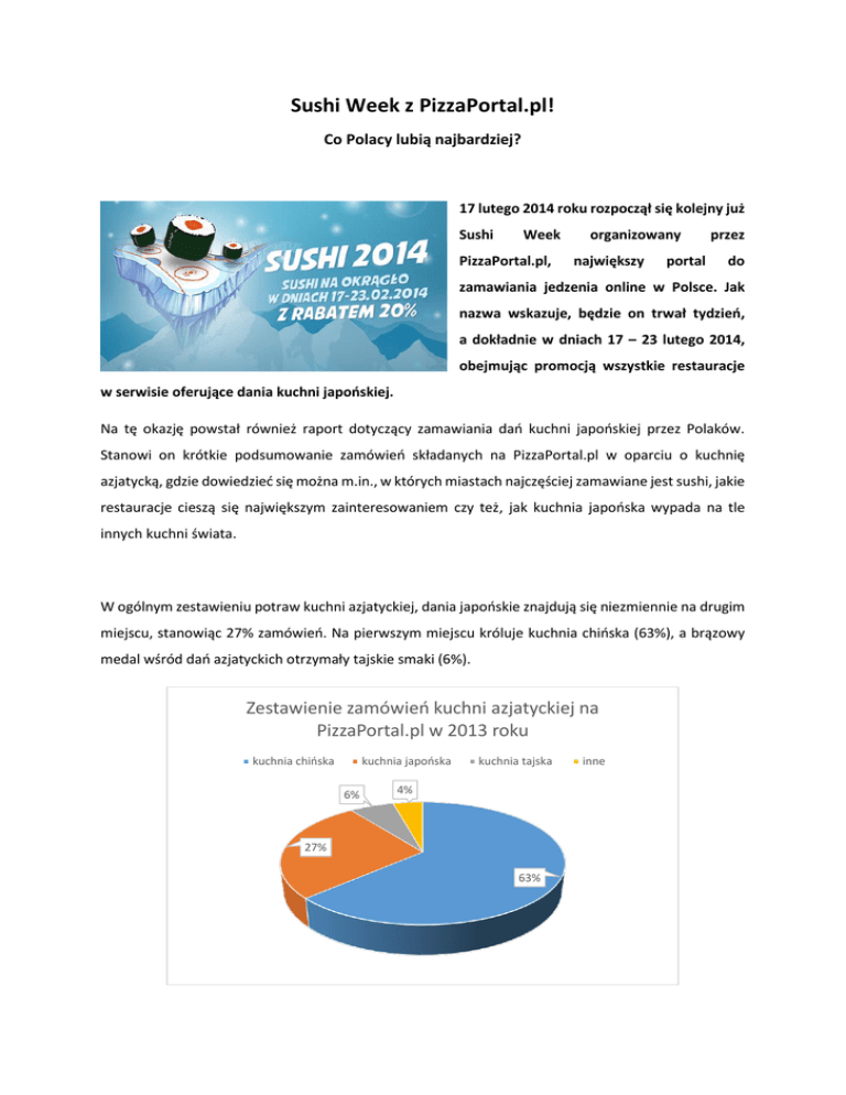 Sushi Week z PizzaPortal.pl! Co Polacy lubią najbardziej? 17 lutego 2014 roku rozpoczął się kolejny już Sushi Week PizzaPortal.pl, organizowany największy portal przez do zamawiania jedzenia online w Polsce. Jak nazwa wskazuje, będzie on trwał tydzień, a dokładnie w dniach 17 – 23 lutego 2014, obejmując promocją wszystkie restauracje w serwisie oferujące dania kuchni japońskiej. Na tę okazję powstał również raport dotyczący zamawiania dań kuchni japońskiej przez Polaków. Stanowi on krótkie podsumowanie zamówień składanych na PizzaPortal.pl w oparciu o kuchnię azjatycką, gdzie dowiedzieć się można m.in., w których miastach najczęściej zamawiane jest sushi, jakie restauracje cieszą się największym zainteresowaniem czy też, jak kuchnia japońska wypada na tle innych kuchni świata. W ogólnym zestawieniu potraw kuchni azjatyckiej, dania japońskie znajdują się niezmiennie na drugim miejscu, stanowiąc 27% zamówień. Na pierwszym miejscu króluje kuchnia chińska (63%), a brązowy medal wśród dań azjatyckich otrzymały tajskie smaki (6%). Zestawienie zamówień kuchni azjatyckiej na PizzaPortal.pl w 2013 roku kuchnia chińska kuchnia japońska 6% kuchnia tajska 4% 27% 63% inne Japońskie restauracje w Polsce – gdzie najczęściej jedliśmy sushi? Restauracje japońskie, cieszą się coraz większym zainteresowaniem klientów PizzaPortal.pl. Obecnie w serwisie dostępnych jest 114 japońskich restauracji. W tabeli poniżej znajduje się wykaz restauracji, w których najczęściej zamawiano sushi na PizzaPortal.pl. Jak można zobaczyć, Tokyo Sushi Bar z Łodzi zajął pierwsze miejsce w rankingu. Następnie OTO! Sushi z Warszawy, a za nim Sushi Box Mokotów. Poniżej można zobaczyć 10 japońskich restauracji z największą liczbą zamówień na PizzaPortal.pl. Wykaz restauracji z największą liczbą zamówień sushi Tokyo Sushi Bar Łódź OTO!Sushi Warszawa Sushi Box Mokotów Warszawa Dom Sushi Restauracje japońskie Sopot Satori Sushi Lublin Fusion Sushi - Wrzeszcz Gdańsk Fusion Sushi - Wrzeszcz Gdańsk Sushi NagoYa Poznań Sensi Sushi Ochota Warszawa Gold Sushi Warszawa Dom Sushi Restauracje japońskie Gdańsk Źródło: PizzaPortal.pl Druga tabela przedstawia spis najwyżej ocenianych restauracji z kuchnią japońską na portalu. Lokale oceniane były pod względem jakości obsługi, szybkości dostawy oraz jakości zamawianych dań. Wykaz restauracji o najlepszej ocenie Nazwa restauracji Miasto Sekai Sushi Rumia OTO!Sushi Warszawa Dragon Sushi & Noodle Bar Wejherowo Satori Sushi Lublin Fusion Sushi - Wrzeszcz Gdańsk Dom Sushi Restauracje japońskie Sopot Gold Sushi Warszawa Sakana Sushi Bar Katowice Sushi Bar & Chinese Food Białystok Sushi NagoYa Poznań Źródło: PizzaPortal.pl Sushi w Polsce – które miasta najchętniej zamawiają orientalną kuchnię? A na koniec przedstawiony jest wykaz miast, w których najczęściej zamawiane jest sushi. Według zamówień na PizzaPortal.pl, najczęściej sushi zamawiają mieszkańcy Warszawy (4,5% zamówień), następnie łodzianie (2% zamówień), za nimi mieszkańcy Krakowa (1,5% wszystkich zamówień), Gdańska oraz Poznania. Dane dotyczą zamówień składanych w 2013 roku. Kuchnia japońska uważana jest za jedną z najbardziej egzotycznych i wykwintnych kuchni świata. Ma coraz większą liczbę miłośników w Polsce, a na świecie miliony wielbicieli. Warto skosztować i zamówić smaczne sushi o 20% taniej z PizzaPortal.pl!
