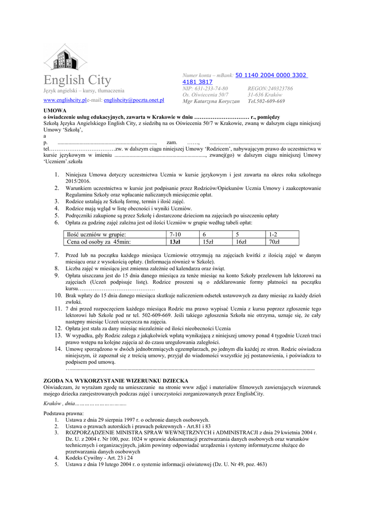 Numer konta – mBank: 50 4181 3817 NIP: 631-233-74-80 Os. Oświecenia 50/7 Mgr Katarzyna Koryczan English City Język angielski – kursy, tłumaczenia www.englishcity.ple-mail: [email protected] 1140 2004 0000 3302 REGON:240323786 31-636 Kraków Tel.502-609-669 UMOWA o świadczenie usług edukacyjnych, zawarta w Krakowie w dniu ………………………… r., pomiędzy Szkołą Języka Angielskiego English City, z siedzibą na os Oświecenia 50/7 w Krakowie, zwaną w dalszym ciągu niniejszej Umowy ‘Szkołą’, a p. ......................................................................., zam. ……, ................................................................................. tel………………………………zw. w dalszym ciągu niniejszej Umowy ‘Rodzicem’, nabywającym prawo do uczestnictwa w kursie językowym w imieniu .................................................................., zwanej(go) w dalszym ciągu niniejszej Umowy ‘Uczniem’.szkoła 1. 2. 3. 4. 5. 6. Niniejsza Umowa dotyczy uczestnictwa Ucznia w kursie językowym i jest zawarta na okres roku szkolnego 2015/2016. Warunkiem uczestnictwa w kursie jest podpisanie przez Rodziców/Opiekunów Ucznia Umowy i zaakceptowanie Regulaminu Szkoły oraz wpłacanie naliczanych miesięcznie opłat. Rodzice ustalają ze Szkołą formę, termin i ilość zajęć. Rodzice mają wgląd w listę obecności i wyniki Uczniów. Podręczniki zakupione są przez Szkołę i dostarczone dzieciom na zajęciach po uiszczeniu opłaty Opłata za godzinę zajęć zależna jest od ilości Uczniów w grupie według tabeli opłat: Ilość uczniów w grupie: Cena od osoby za 45min: 7. 8. 9. 10. 11. 12. 13. 14. 7-10 13zł 6 15zł 5 16zł 1-2 70zł Przed lub na początku każdego miesiąca Uczniowie otrzymują na zajęciach kwitki z ilością zajęć w danym miesiącu oraz z wysokością opłaty. (Informacja również w Szkole). Liczba zajęć w miesiącu jest zmienna zależnie od kalendarza oraz świąt. Opłata uiszczana jest do 15 dnia danego miesiąca za tenże miesiąc na konto Szkoły przelewem lub lektorowi na zajęciach (Uczeń podpisuje listę). Rodzice proszeni są o zdeklarowanie formy płatności na początku kursu…………………………………… Brak wpłaty do 15 dnia danego miesiąca skutkuje naliczeniem odsetek ustawowych za dany miesiąc za każdy dzień zwłoki. 7 dni przed rozpoczęciem każdego miesiąca Rodzic ma prawo wypisać Ucznia z kursu poprzez zgłoszenie tego lektorowi lub Szkole pod nr tel. 502-609-669. Jeśli takiego zgłoszenia Szkoła nie otrzyma, uznaje się, że cały następny miesiąc Uczeń uczęszcza na zajęcia. Opłata jest stała za dany miesiąc niezależnie od ilości nieobecności Ucznia W wypadku, gdy Rodzic zalega z jakąkolwiek wpłatą wynikającą z niniejszej umowy ponad 4 tygodnie Uczeń traci prawo wstępu na kolejne zajęcia aż do czasu uregulowania zaległości. Umowę sporządzono w dwóch jednobrzmiących egzemplarzach, po jednym dla każdej ze stron. Rodzic oświadcza niniejszym, iż zapoznał się z treścią umowy, przyjął do wiadomości wszystkie jej postanowienia, i poświadcza to podpisem pod umową. …................................................................................................................................................................................. ZGODA NA WYKORZYSTANIE WIZERUNKU DZIECKA Oświadczam, że wyrażam zgodę na umieszczanie na stronie www zdjęć i materiałów filmowych zawierających wizerunek mojego dziecka zarejestrowanych podczas zajęć i uroczystości zorganizowanych przez EnglishCity. Kraków , dnia………………………….. Podstawa prawna: 1. Ustawa z dnia 29 sierpnia 1997 r. o ochronie danych osobowych. 2. Ustawa o prawach autorskich i prawach pokrewnych - Art.81 i 83 3. ROZPORZĄDZENIE MINISTRA SPRAW WEWNĘTRZNYCH i ADMINISTRACJI z dnia 29 kwietnia 2004 r. Dz. U. z 2004 r. Nr 100, poz. 1024 w sprawie dokumentacji przetwarzania danych osobowych oraz warunków technicznych i organizacyjnych, jakim powinny odpowiadać urządzenia i systemy informatyczne służące do przetwarzania danych osobowych 4. Kodeks Cywilny - Art. 23 i 24 5. Ustawa z dnia 19 lutego 2004 r. o systemie informacji oświatowej (Dz. U. Nr 49, poz. 463)