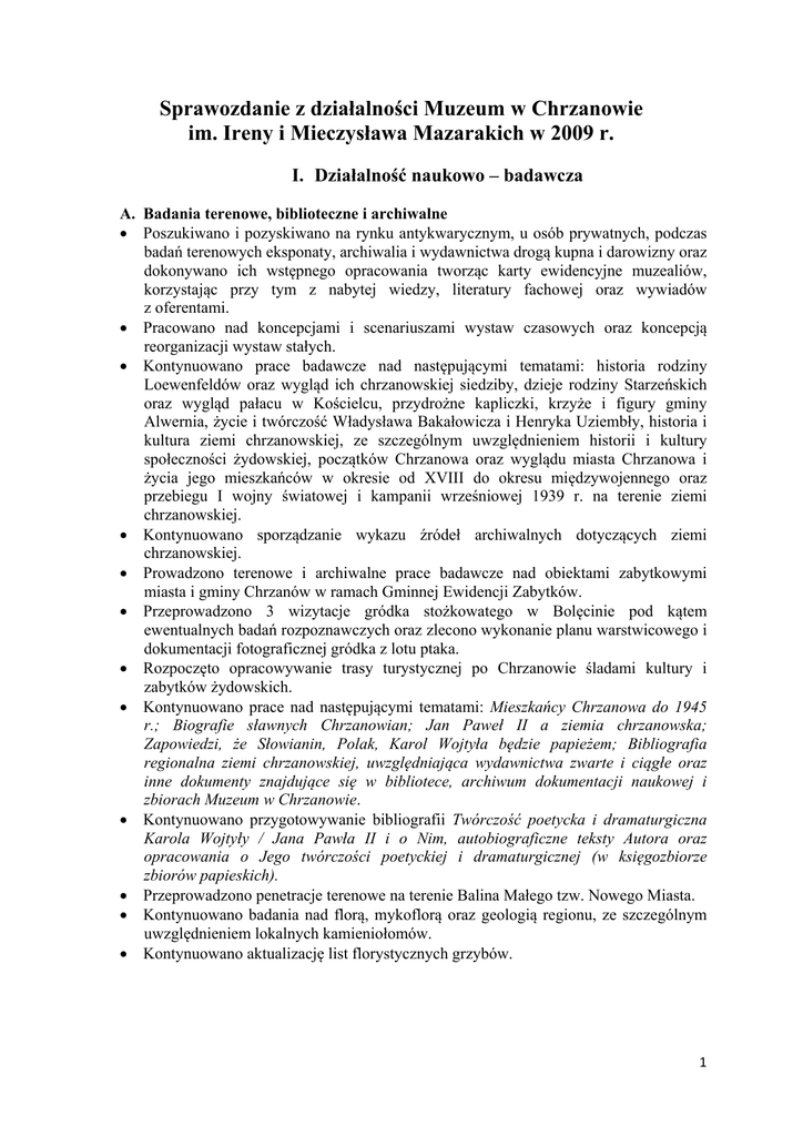 Sprawozdanie z działalności Muzeum w Chrzanowie im. Ireny i