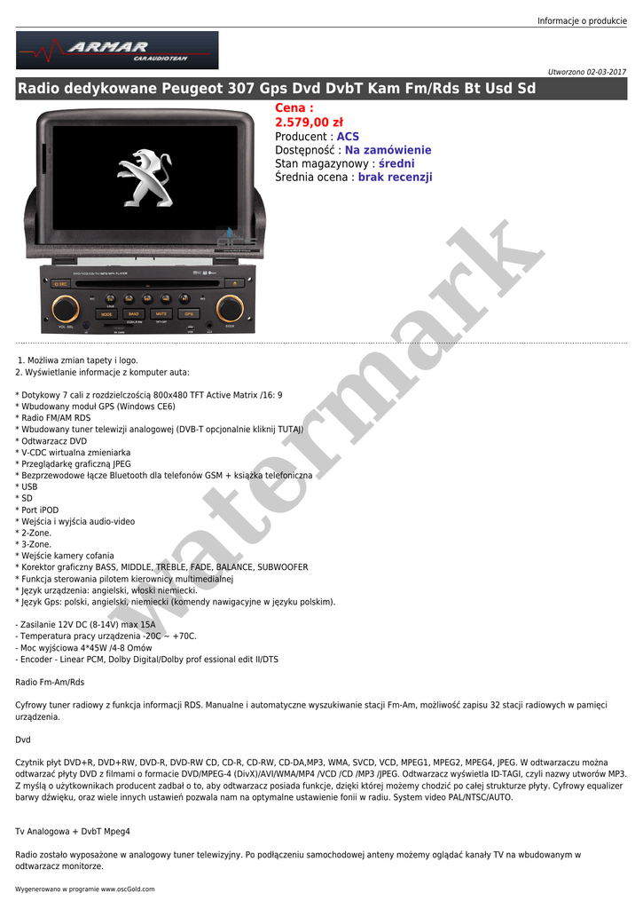 Informacje o produkcie Utworzono 02-03-2017 Radio dedykowane Peugeot 307 Gps Dvd DvbT Kam Fm/Rds Bt Usd Sd Cena : 2.579,00 zł er m ar k Producent : ACS Dostępność : Na zamówienie Stan magazynowy : średni Średnia ocena : brak recenzji 1. Możliwa zmian tapety i logo. 2. Wyświetlanie informacje z komputer auta: w at * Dotykowy 7 cali z rozdzielczością 800x480 TFT Active Matrix /16: 9 * Wbudowany moduł GPS (Windows CE6) * Radio FM/AM RDS * Wbudowany tuner telewizji analogowej (DVB-T opcjonalnie kliknij TUTAJ) * Odtwarzacz DVD * V-CDC wirtualna zmieniarka * Przeglądarkę graficzną JPEG * Bezprzewodowe łącze Bluetooth dla telefonów GSM + książka telefoniczna * USB * SD * Port iPOD * Wejścia i wyjścia audio-video * 2-Zone. * 3-Zone. * Wejście kamery cofania * Korektor graficzny BASS, MIDDLE, TREBLE, FADE, BALANCE, SUBWOOFER * Funkcja sterowania pilotem kierownicy multimedialnej * Język urządzenia: angielski, włoski niemiecki. * Język Gps: polski, angielski, niemiecki (komendy nawigacyjne w języku polskim). - Zasilanie 12V DC (8-14V) max 15A - Temperatura pracy urządzenia -20C ~ +70C. - Moc wyjściowa 4*45W /4-8 Omów - Encoder - Linear PCM, Dolby Digital/Dolby prof essional edit II/DTS Radio Fm-Am/Rds Cyfrowy tuner radiowy z funkcja informacji RDS. Manualne i automatyczne wyszukiwanie stacji Fm-Am, możliwość zapisu 32 stacji radiowych w pamięci urządzenia. Dvd Czytnik płyt DVD+R, DVD+RW, DVD-R, DVD-RW CD, CD-R, CD-RW, CD-DA,MP3, WMA, SVCD, VCD, MPEG1, MPEG2, MPEG4, JPEG. W odtwarzaczu można odtwarzać płyty DVD z filmami o formacie DVD/MPEG-4 (DivX)/AVI/WMA/MP4 /VCD /CD /MP3 /JPEG. Odtwarzacz wyświetla ID-TAGI, czyli nazwy utworów MP3. Z myślą o użytkownikach producent zadbał o to, aby odtwarzacz posiada funkcje, dzięki której możemy chodzić po całej strukturze płyty. Cyfrowy equalizer barwy dźwięku, oraz wiele innych ustawień pozwala nam na optymalne ustawienie fonii w radiu. System video PAL/NTSC/AUTO. Tv Analogowa + DvbT Mpeg4 Radio zostało wyposażone w analogowy tuner telewizyjny. Po podłączeniu samochodowej anteny możemy oglądać kanały TV na wbudowanym w odtwarzacz monitorze. Wygenerowano w programie www.oscGold.com System: PAL D/K, PAL I, PAL BG, PAL-N, PAL-M, NTSC, SECAM. Dźwięk IF: PAL D/K, PAL I DVB-T opcjonalnie kliknij TUTAJ Usb Możliwość podłączania zewnętrznej pamięci USB i swobodny sposób przeglądaniu jak i dotwarzaniu plików muzycznych, filmowych, graficznych. Również może służyć, jako ładowarka telefonu lub innych urządzeń. Sd Możliwość podłączania zewnętrznej pamięci SD HC max 32Gb i swobodny sposób przeglądaniu jak i dotwarzaniu plików muzycznych, filmowych, graficznych. Aux Radio może pełnić funkcje monitora, możemy podłączyć dowolne urządzenie pod wejście AUX obraz będzie wyświetlany na monitorze dźwięk będziemy słyszeć w głośnikach. Funkcja dostępna po podaniu sygnału. Telefon - Bluetooth er m ar k Po połączeniu z telefonem system służy, jako zestaw głośnomówiący. Podczas gdy ktoś dzwoni do nas dzwonek telefonu słyszymy w głośnikach samochodu, jednym przyciskiem w panelu radia odbieramy rozmowę, my zaś naszego rozmówce słyszymy w głośnikach samochodowych. Po zakończeniu rozmowy bezpośrednio z panelu radia możemy wybrać numer telefonu. Urządzenie dodatkowo wyświetla, rozmowy wychodzące, przychodzące, połączenia nieodebrane i importuje książkę telefoniczna telefonu (NAZWA - NUMER). Wyposażony w funkcję multimedialna: słuchanie muzyki przez BT z telefonu. iPod Po podłączaniu iPOD-a wszystkimi funkcjami sterujemy za pomocą ekranu dotykowego, sygnał audio przekierowany jest na głośniki radia. Kamera Cofania Kamera cofania Możliwość podłączenia kamery cofania, obraz wyświetlany jest na całym ekranie, dodatkowo kamery cofania posiadają podziałkę odległości, dzięki czemu nasze parkowanie nigdy nie sprawi nam problemu.(Zdjęcie przedstawia dedykowana kamerę cofania, możliwe jest podłączenie uniwersalnej kamery.) Gps Dzięki wbudowanemu modułowi GPS wyposażony w system operacyjny Windows CE. 6, Możemy zmieniać programy nawigacyjne (programy sprawdzone przez nas to: IGO, AutoMapa, TomTom, Road 66.) Program nawigacyjny wgrywamy na kartę SD w szybki sposób możemy przełączać pomiędzy programami map. Kompas Kalkulator at Cyfrowy kompas działający z sygnałem GPS. Kalkulator obsługiwany z pozycji ekranu dotykowego. w Tapeta - Logo Możliwość zmiany tapety na własną lub proponowana przez system. Również mamy możliwość zmiany powitalnego logo. Setup Główne ustawienia systemu gdzie znajdziemy: Ścieżkę programu nawigacyjnego, ustawienia wideo, ustawienia audio, ustawienia czasu, kalibracje ekranu, ustawianie funkcji przycisków multimedialnych kierownicy. ustawienia Pełna współpraca z kierownica multimedialną. Sami programujemy funkcje pod odpowiadającym nam przyciskiem. Do zaprogramowanie 10 funkcji: głośniej, ciszej, przewiń w lewo, przewiń w prawo, mode (przechodzenie pomiędzy funkcjami) wyciszenie, power- wł./wył. urządzeni radio, nawigacja, srcgłówne menu, następny utwór (stacja), poprzedni utwór (stacja) W przypadku urządzeń z dekoderem CANBUS, dekoder sam przypisuje fakcie kierownicy, również odbierania i zakańczanie rozmów. Wejścia & Wyjścia 1. Wejście anteny FM. 2. Wejście sterowania kierownicą multimedialną (w komplecie niezbędne przewody, przejściówki do danego auta). 3. Wejście USB. 4. Wejście iPOD. 5. Wejście dodatkowego mikrofonu. Informacje o produkcie 6. Wejście anteny TV. 7. Wejście anteny, GPS. 8. Wejście anteny TV (telewizji cyfrowej, DVB-T MPEG4(opcjonalnie)). 9. Bezpiecznik. 10. Główne wejście zasilające i wyjście głośnikowe x4, przewód do sterowania kamerą cofania (automatyczne włączanie kamery przy biegu wstecznym), przewód do sterowania obrazem, przewód do sterowania wzmacniaczem. 11. Wyjścia RCA 4xAUDIO 1xVIDEO na wzmacniacz 