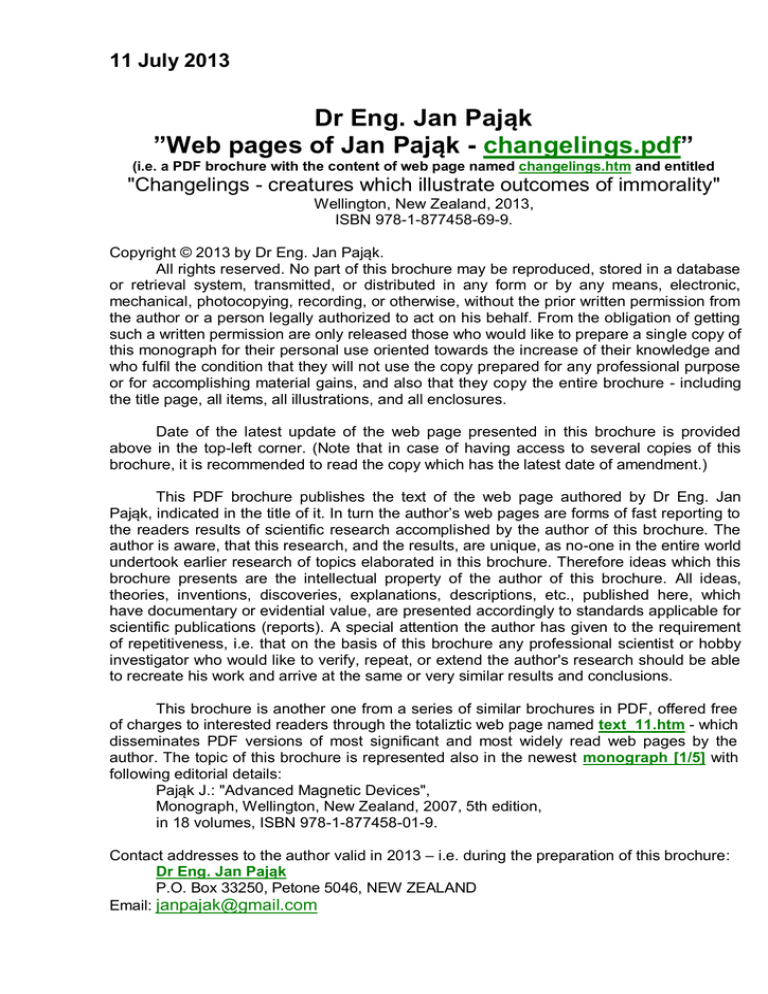 11 July 2013 Dr Eng. Jan Pająk ”Web pages of Jan Pająk - changelings.pdf” (i.e. a PDF brochure with the content of web page named changelings.htm and entitled "Changelings - creatures which illustrate outcomes of immorality" Wellington, New Zealand, 2013, ISBN 978-1-877458-69-9. Copyright © 2013 by Dr Eng. Jan Pająk. All rights reserved. No part of this brochure may be reproduced, stored in a database or retrieval system, transmitted, or distributed in any form or by any means, electronic, mechanical, photocopying, recording, or otherwise, without the prior written permission from the author or a person legally authorized to act on his behalf. From the obligation of getting such a written permission are only released those who would like to prepare a single copy of this monograph for their personal use oriented towards the increase of their knowledge and who fulfil the condition that they will not use the copy prepared for any professional purpose or for accomplishing material gains, and also that they copy the entire brochure - including the title page, all items, all illustrations, and all enclosures. Date of the latest update of the web page presented in this brochure is provided above in the top-left corner. (Note that in case of having access to several copies of this brochure, it is recommended to read the copy which has the latest date of amendment.) This PDF brochure publishes the text of the web page authored by Dr Eng. Jan Pająk, indicated in the title of it. In turn the author’s web pages are forms of fast reporting to the readers results of scientific research accomplished by the author of this brochure. The author is aware, that this research, and the results, are unique, as no-one in the entire world undertook earlier research of topics elaborated in this brochure. Therefore ideas which this brochure presents are the intellectual property of the author of this brochure. All ideas, theories, inventions, discoveries, explanations, descriptions, etc., published here, which have documentary or evidential value, are presented accordingly to standards applicable for scientific publications (reports). A special attention the author has given to the requirement of repetitiveness, i.e. that on the basis of this brochure any professional scientist or hobby investigator who would like to verify, repeat, or extend the author's research should be able to recreate his work and arrive at the same or very similar results and conclusions. This brochure is another one from a series of similar brochures in PDF, offered free of charges to interested readers through the totaliztic web page named text_11.htm - which disseminates PDF versions of most significant and most widely read web pages by the author. The topic of this brochure is represented also in the newest monograph [1/5] with following editorial details: Pająk J.: "Advanced Magnetic Devices", Monograph, Wellington, New Zealand, 2007, 5th edition, in 18 volumes, ISBN 978-1-877458-01-9. Contact addresses to the author valid in 2013 – i.e. during the preparation of this brochure: Dr Eng. Jan Pająk P.O. Box 33250, Petone 5046, NEW ZEALAND Email: [email protected] If we look around in these present, stripped from morality times, then strikes us that a noticeable proportion of people in fact does not wish to work, but only tries to benefit from all these pleasures that the current world offers to us. These people do not want to dirty their hands with building or repairing cars, but they love to drive nice limousines. They do not wish to trouble themselves with farming or cooking, but they insist on eating in exclusive restaurants. They do not wish to wash nor clean, but like to live in nice hotels with clean bedding. Etc., etc. So what such people would do, if someone on Earth managed to build an interstellar spaceship, such as the magnocraft. Well, according to what is explained on a separate web page evil, they would immediately arrange a farm of slaves for themselves on a remote planet. Then they would force children of these slaves to do for them all works. In order to make these slaves even more useful, and to be able to utilise them e.g. as prostitutes and as servants, in this farm of slaves people would farm their own race, means their close relatives - other people. In the result of such a situation, these enslaved relatives of humans would only 2 work for people, while people would do nothing else but enjoy life through various pleasures and deviations. Exactly as this is described above, creatures which we call UFOnauts are doing. Only that for them we are these farmed relatives whose children are doing all works. they in turn just sample various pleasures of life. Unfortunately, in last years the knowledge and technology of humanity grew too much, and as a civilisation we begin to notice that we are secretly exploited by them. So in order to shift us back in the development, these UFOnauts use, amongst others, also their secret weapon, which are changelings. This web page explains exactly who are these "changelings", and in what manner they gradually shift humanity back in the development. Part #A: Introductory information about this web page: #A1. Goals of this web page: Actually this web page has only one main goal. It is to explain "who", "why" and "in what way" illustratively lets the humanity know and taste, how it feels when the life on the Earth is ruled by practitioners of the philosophy of socalled "evil parasitism". But because this explanation is NOT possible without a 3 simultaneous revealing "who" exactly are these supernatural creatures, which by the folklore of Ireland are called "changelings", (while by the Polish folklore are called "podmieńcy") - and which enable people to taste a "hell" that is created by common practicing of this destructive and highly immoral philosophy of parasitism, this web page explains additionally (1) "ho" or "what" are these supernatural beings which by the Irish folklo