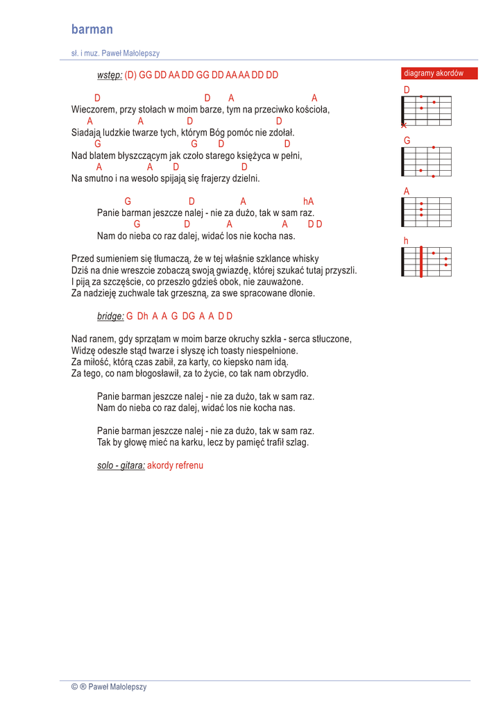 barman sł. i muz. Paweł Małolepszy wstęp: (D) GG DD AA DD GG DD AA AA DD DD D D A A Wieczorem, przy stołach w moim barze, tym na przeciwko kościoła, A A D D Siadają ludzkie twarze tych, którym Bóg pomóc nie zdołał. G G D D Nad blatem błyszczącym jak czoło starego księżyca w pełni, A A D D Na smutno i na wesoło spijają się frajerzy dzielni. diagramy akordów D G A G D A hA Panie barman jeszcze nalej - nie za dużo, tak w sam raz. G D A A DD Nam do nieba co raz dalej, widać los nie kocha nas. Przed sumieniem się tłumaczą, że w tej właśnie szklance whisky Dziś na dnie wreszcie zobaczą swoją gwiazdę, której szukać tutaj przyszli. I piją za szczęście, co przeszło gdzieś obok, nie zauważone. Za nadzieję zuchwale tak grzeszną, za swe spracowane dłonie. bridge: G Dh A A G DG A A D D Nad ranem, gdy sprzątam w moim barze okruchy szkła - serca stłuczone, Widzę odeszłe stąd twarze i słyszę ich toasty niespełnione. Za miłość, którą czas zabił, za karty, co kiepsko nam idą. Za tego, co nam błogosławił, za to życie, co tak nam obrzydło. Panie barman jeszcze nalej - nie za dużo, tak w sam raz. Nam do nieba co raz dalej, widać los nie kocha nas. Panie barman jeszcze nalej - nie za dużo, tak w sam raz. Tak by głowę mieć na karku, lecz by pamięć trafił szlag. solo - gitara: akordy refrenu © ® Paweł Małolepszy h